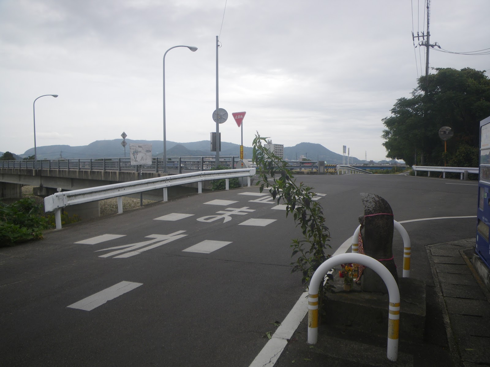 次いで新川に架かる新川橋を渡ると橋の東詰に標石があり、手印と共に「やし満 右一之宮 東徳島 西高松 北やし満」と刻まれる。遍路道はここを左折し県道155号を離れ県道150号に乗り換え相引川の右岸を北に進む。