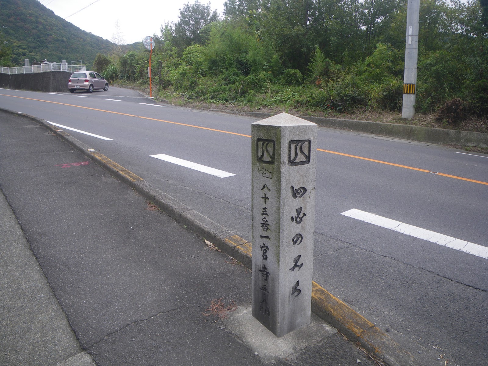 少し進むとブロック造りの地蔵堂があり、その前に標石2基が立つ。ひとつは茂兵衛道標。手印と共に「扁んろ道 明治十九年」の文字が刻まれる。もう一基の標石には手印と「八十三番一ノ宮寺ハコチラ」と刻まれる。