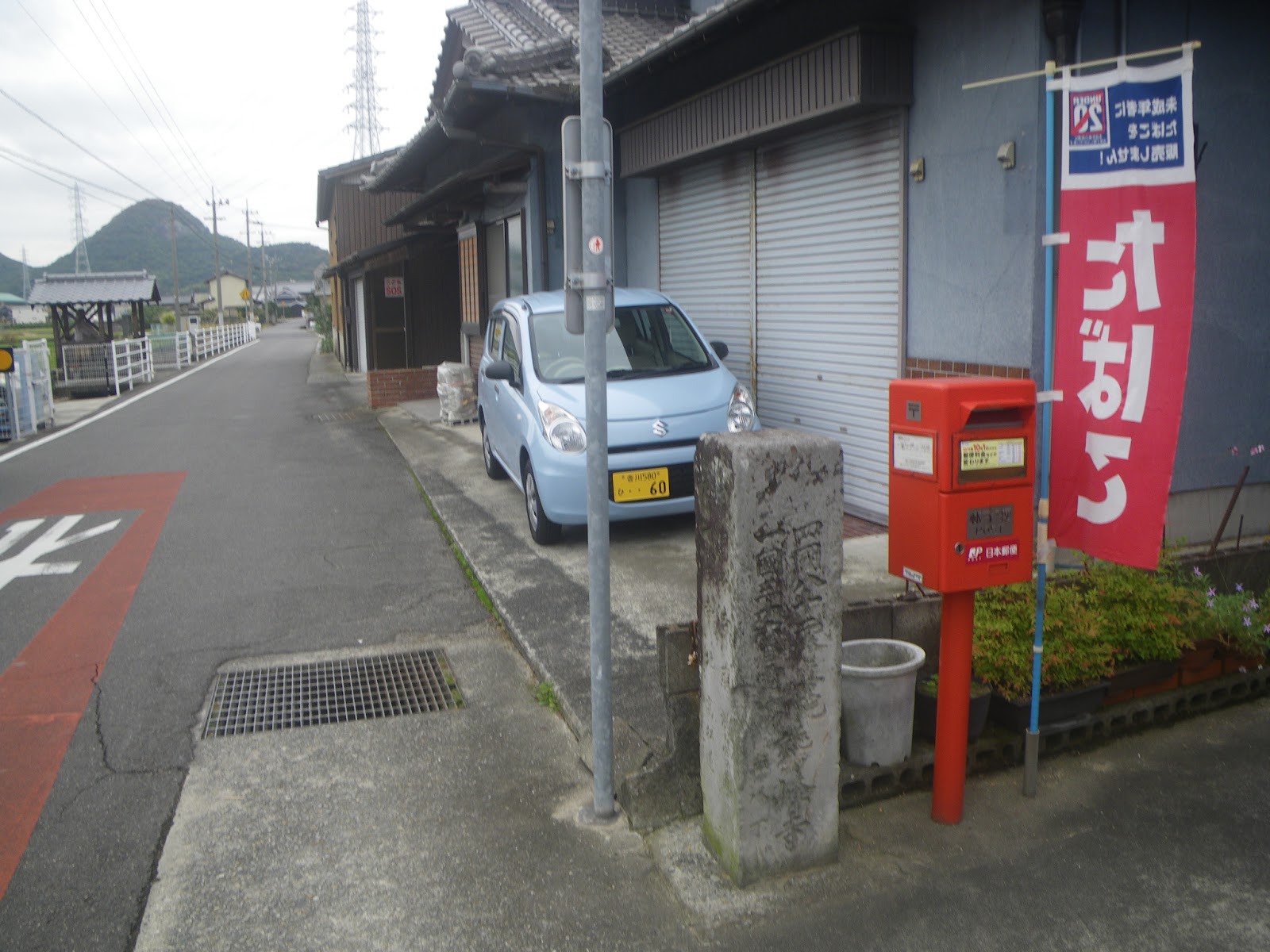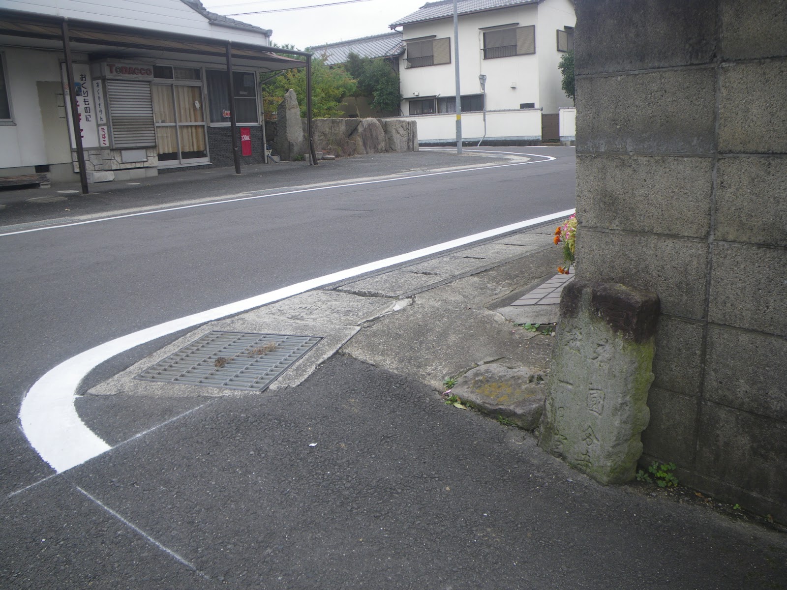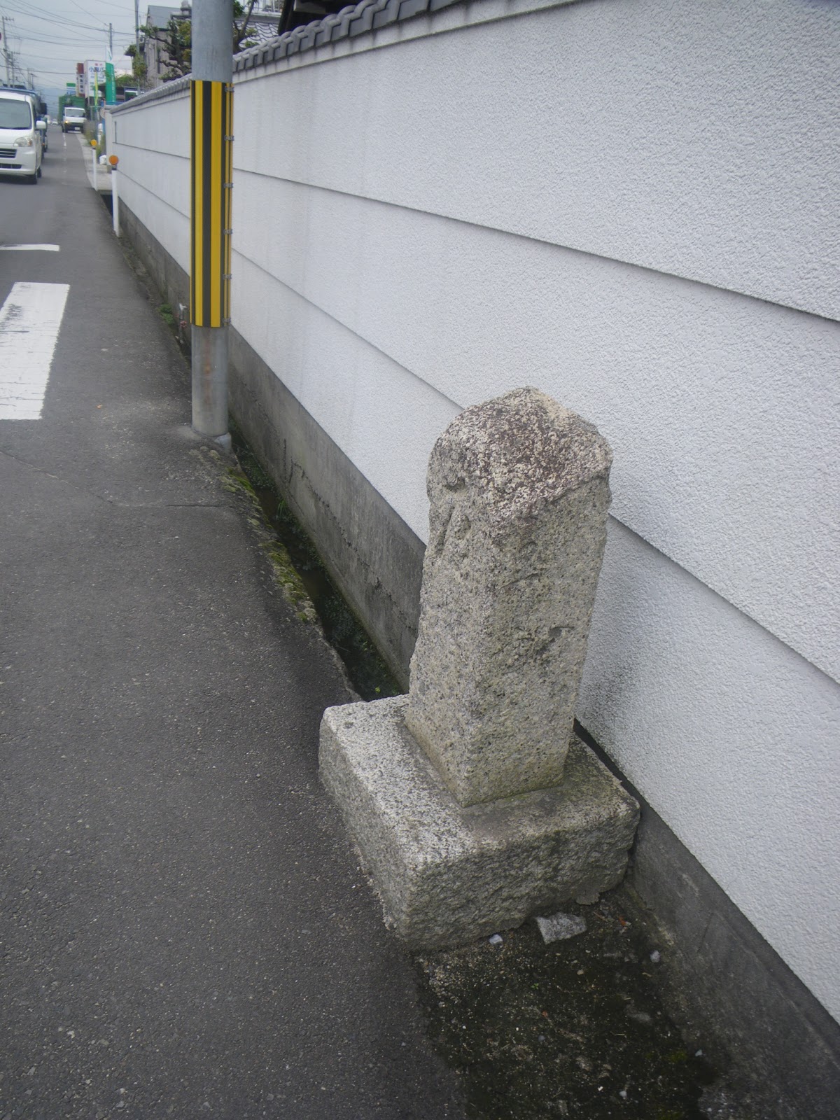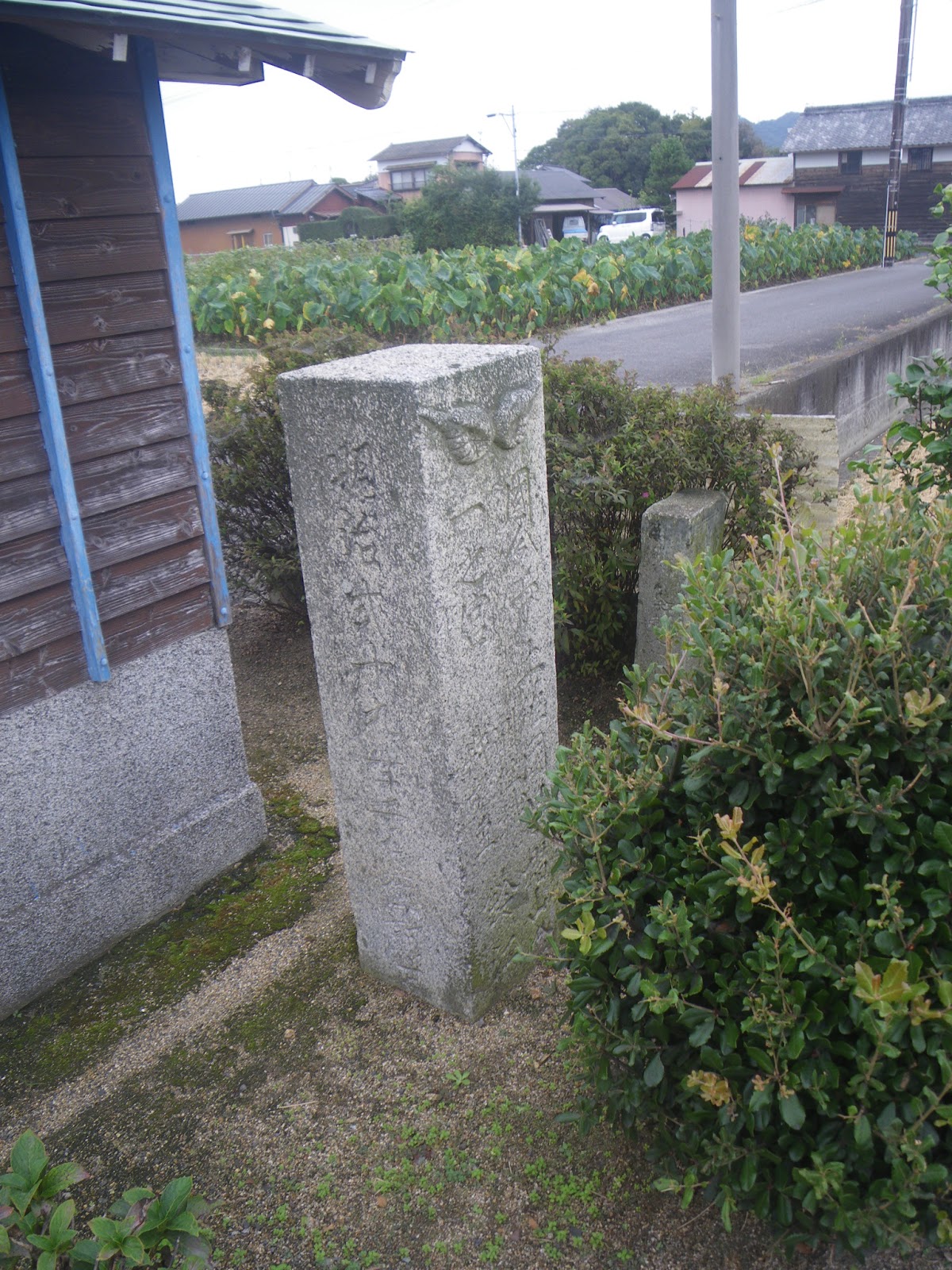 自然石の指示に従い道を左折。水路に沿って北東へと進むと「おさか脳神経外科病院」の南に出る。その東は国道192号。遍路道は国道を渡り東へと進む。ほどなく道の左手に三名神社があり、そこから50mほど進むと道の左手に標石がある。手印に従い左折し北に向かう。