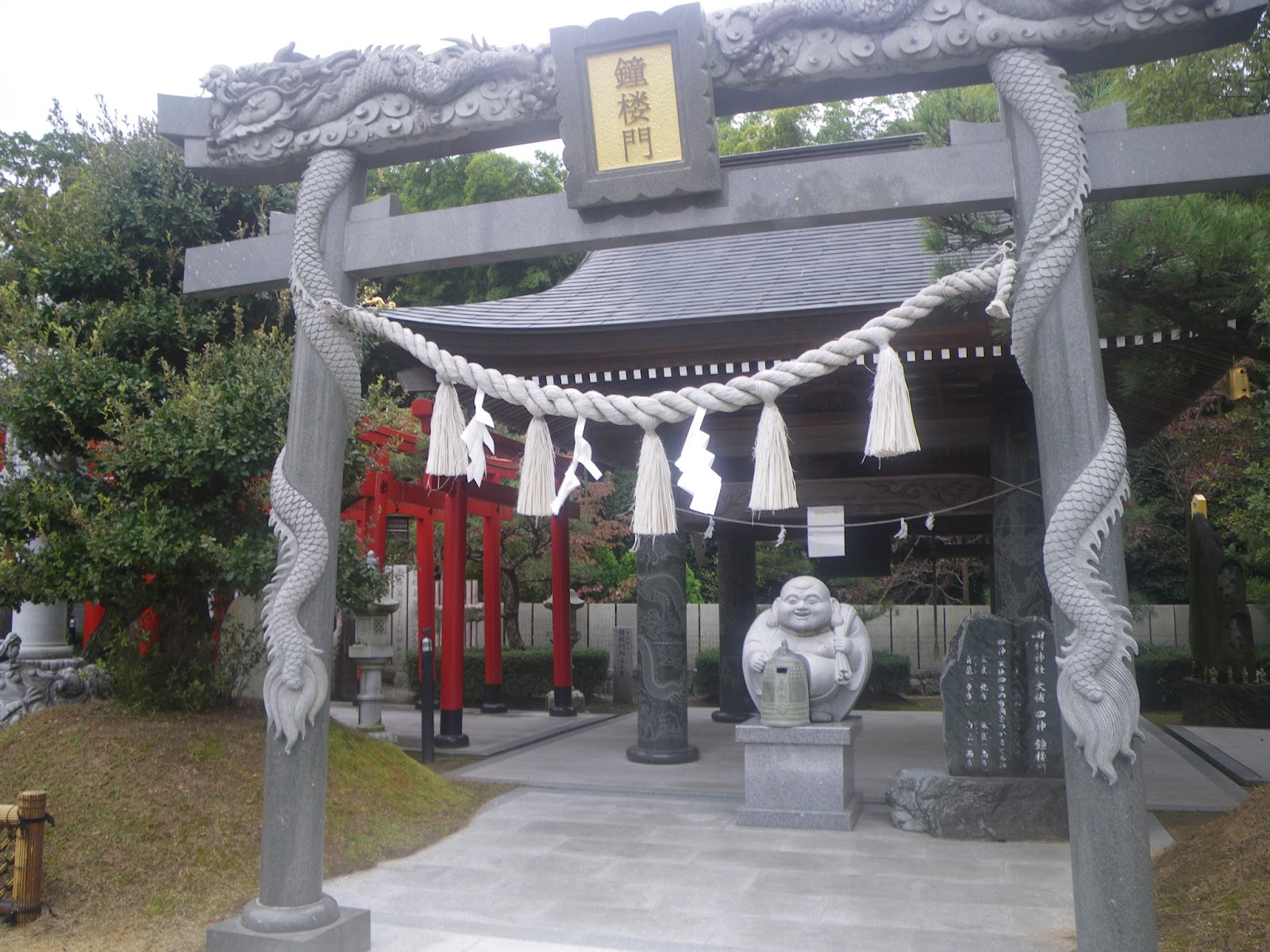 境内には満蒙開拓者殉難之碑の碑、海軍少年飛行兵之碑、忠魂碑など鎮魂のための石碑や十二支巡りの造作、桃太郎話に仮託した犬・猿・雉と吉備津彦・倭迹迹日百襲姫命の石造、竜神の像など多くの石碑・石造が「展開」する。あまりにいろいろなものがありすぎて、とてもすべてメモできそうもない、