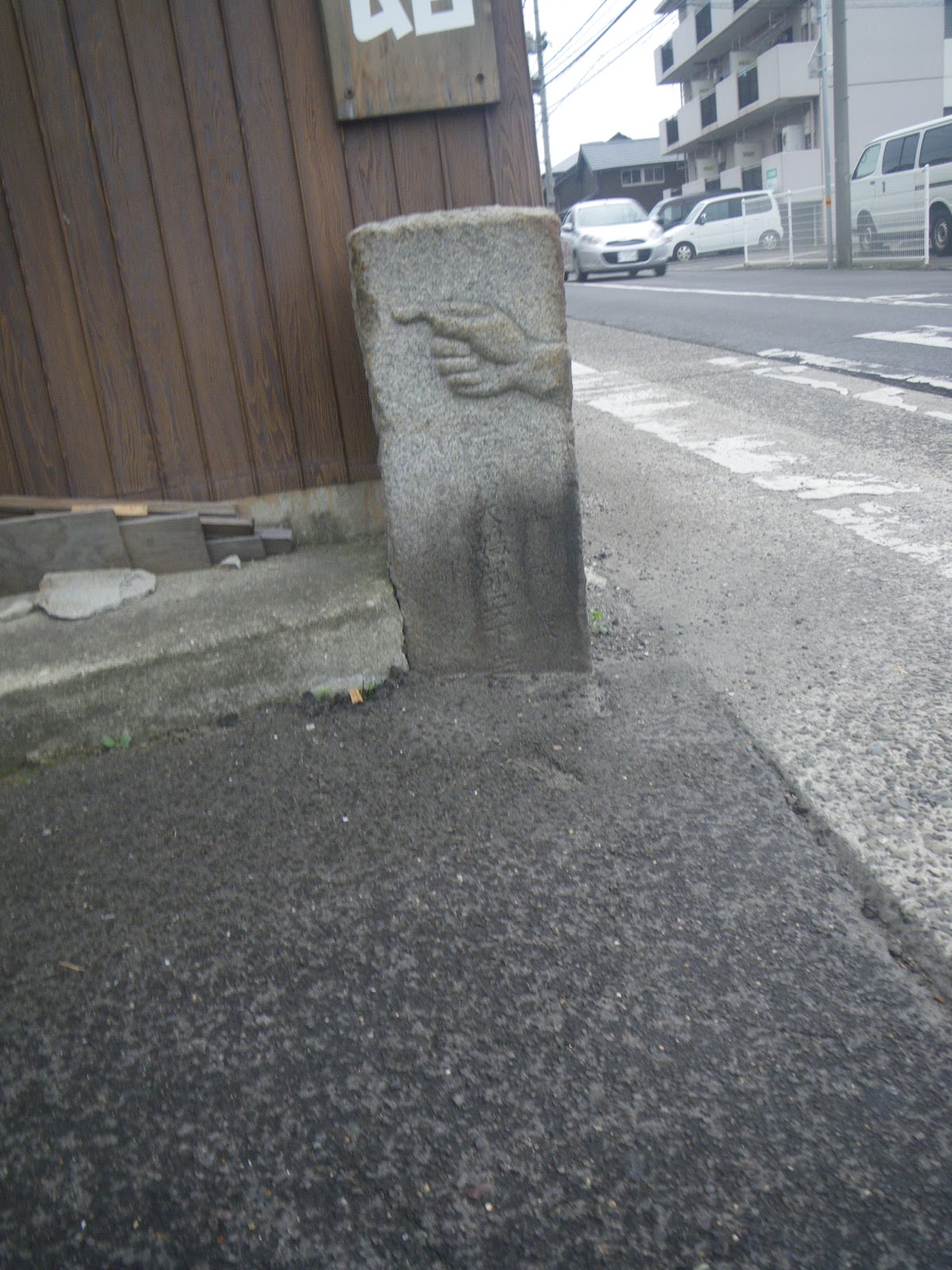 北に進むと一筋先の道との交差に手印だけの標石。更に一筋先の交差部にも少し傾いた手印だけの標石。手印は北を指すが民家の敷地となっており先に進めない。道を右に折れる。