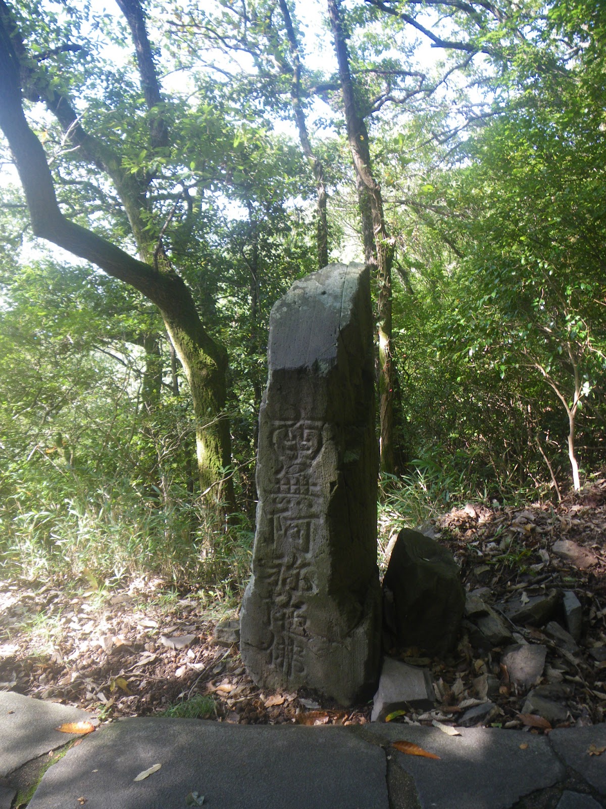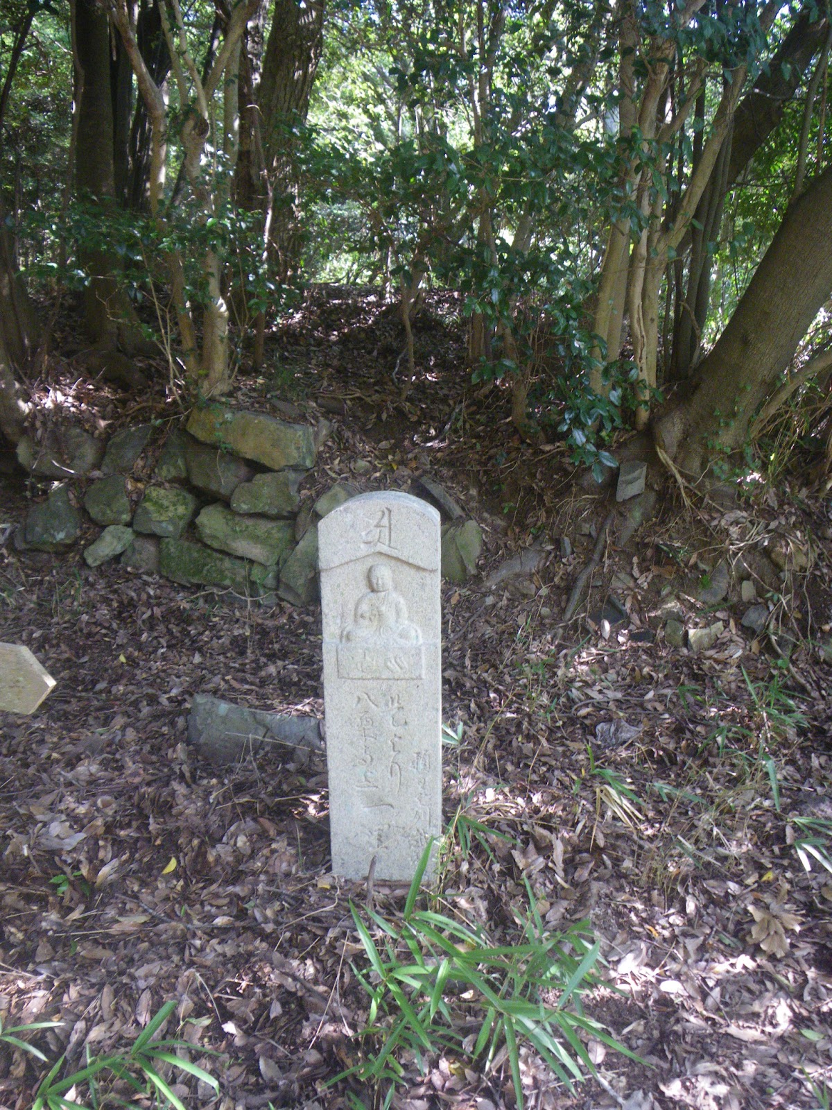 数分進むと不動明王の石仏、さらに数分で自然石に「南無阿弥陀仏」と刻まれた名号石。前述「屋島の遍路みち案内」には、「地元の人はこの石の前でこけると腹がいたくなるから転ばぬようにせよ」とのいいつたえから、この石を腹くわり石と呼んでいる」とあった。屋島には弘法大師が仏の名を刻んだ名号石が3基あるとのことだが、これはそのひとつ。