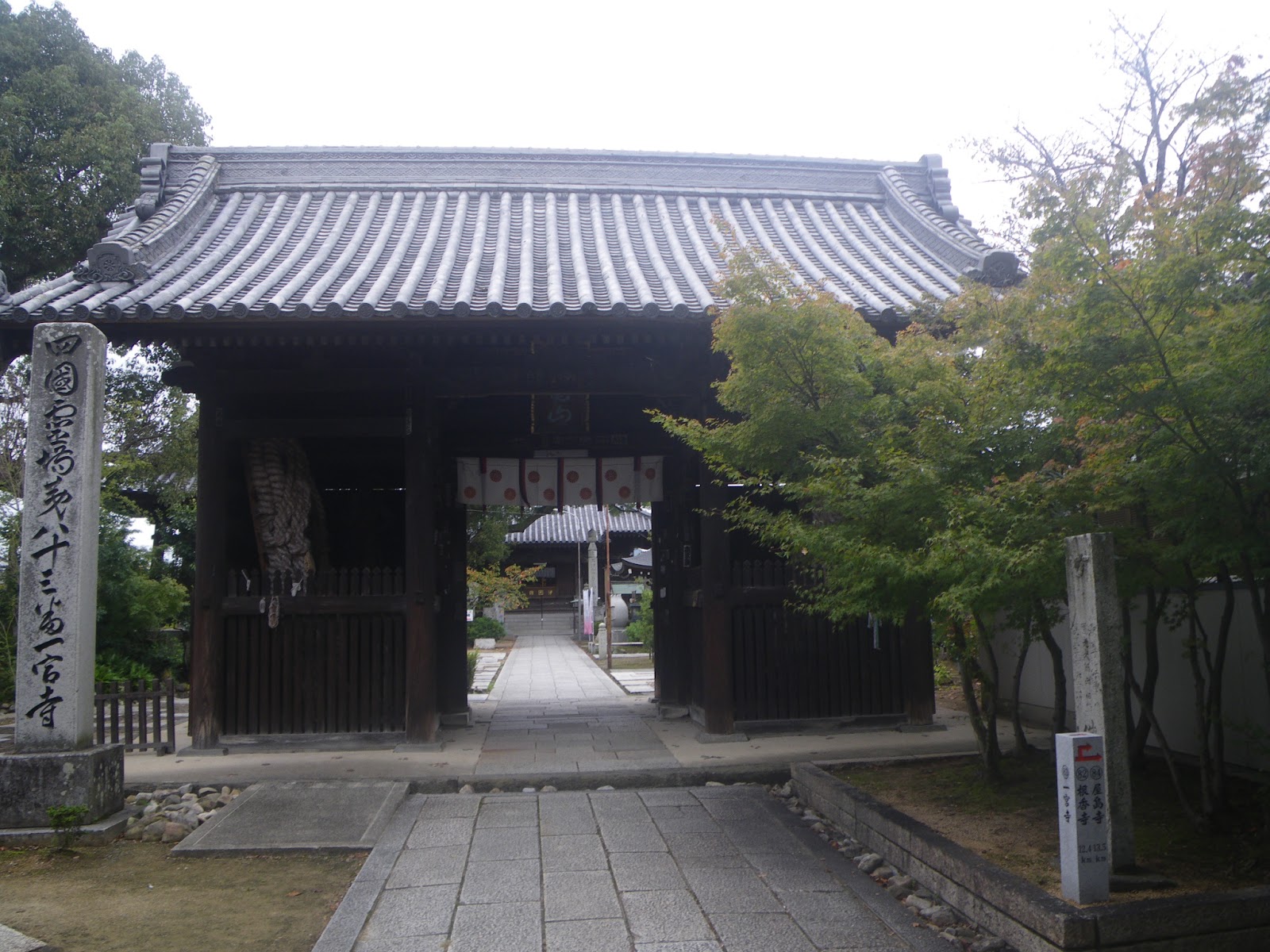 一宮寺への遍路道は、順打路である八十二番根香寺からのふたつのルート、香西口ルートと鬼無口ルートのいずれの道を辿っても、また逆打ルートである七十九番天皇寺から八十一番白峰寺、八十二番根香寺を経て八十番国分寺に至り、そこからこの八十三番一宮寺へと辿る遍路道をとっても共に境内西側に至る。一宮寺の正面仁王門は境内の東側にあり、順路は寺の北西角、大師堂脇から入ることになるし、逆打ちルートは西門(裏門)から境内に入ることになる。