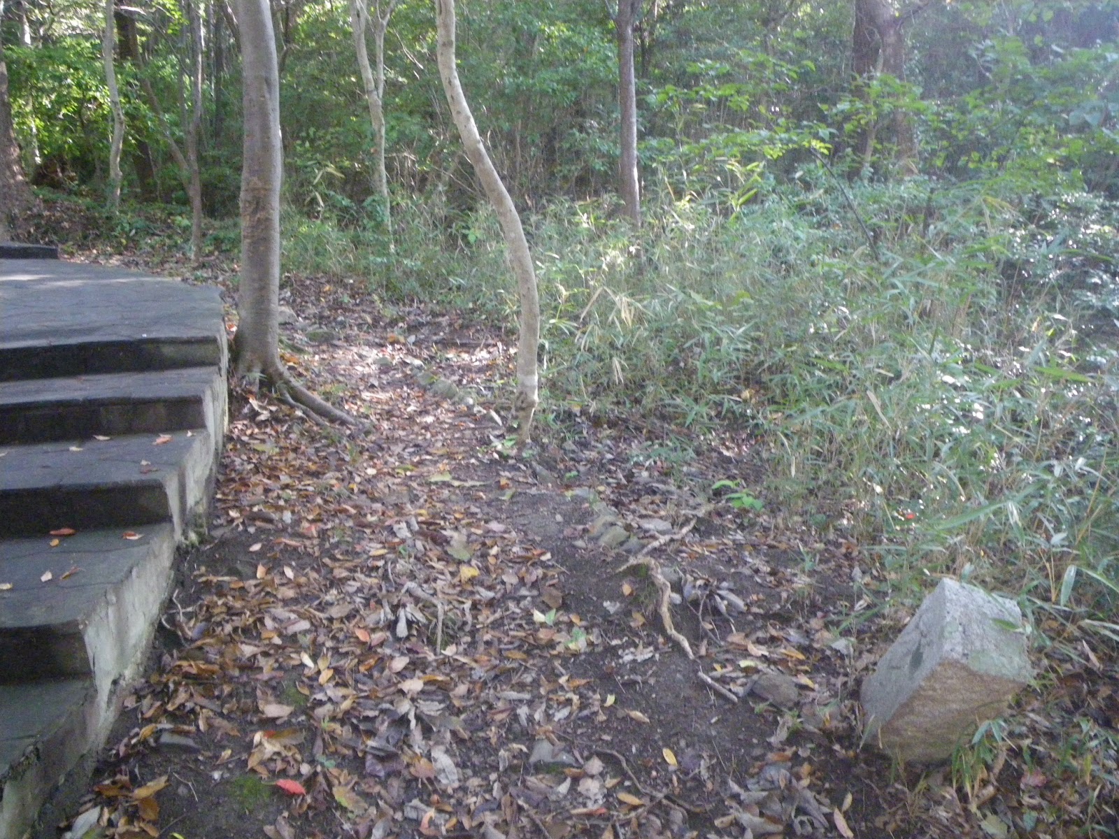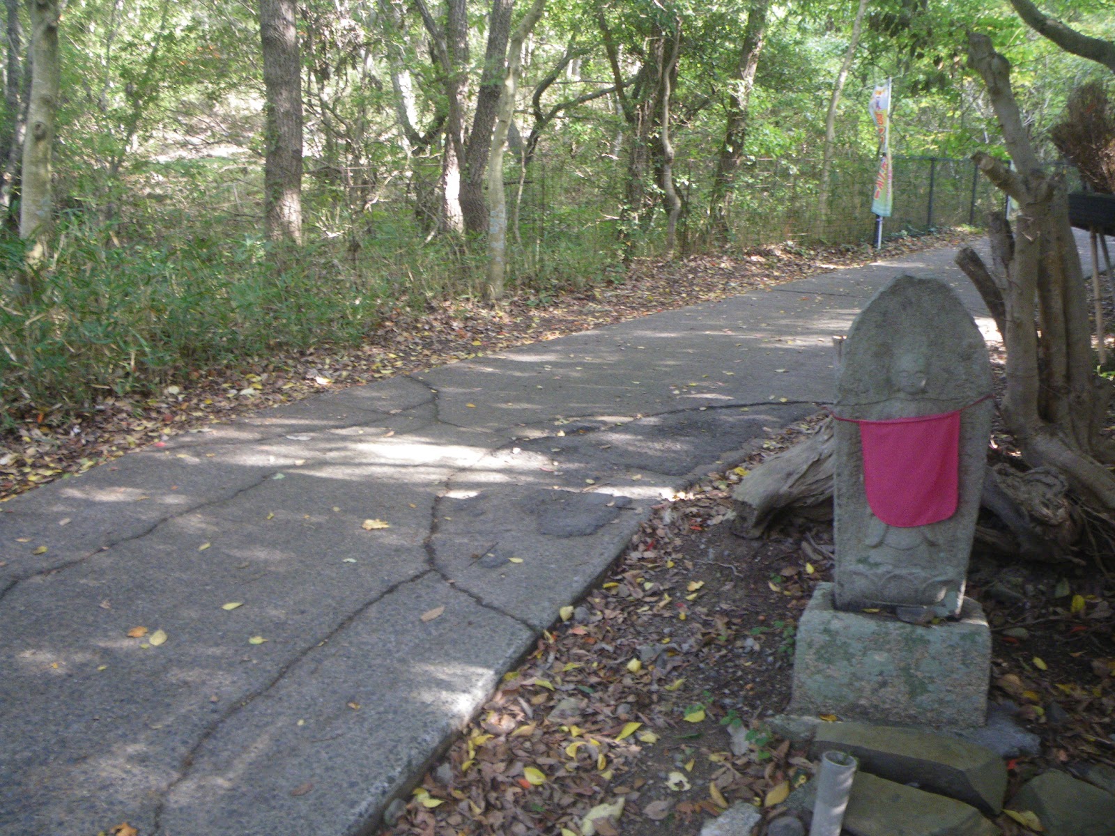 道の左右の未舗装箇所には結構な数の車が停る。屋島寺なのか屋島のお山なのか、ともあれ車をここまで寄せて屋島へと向かうようだ。道はその先で石段となる。