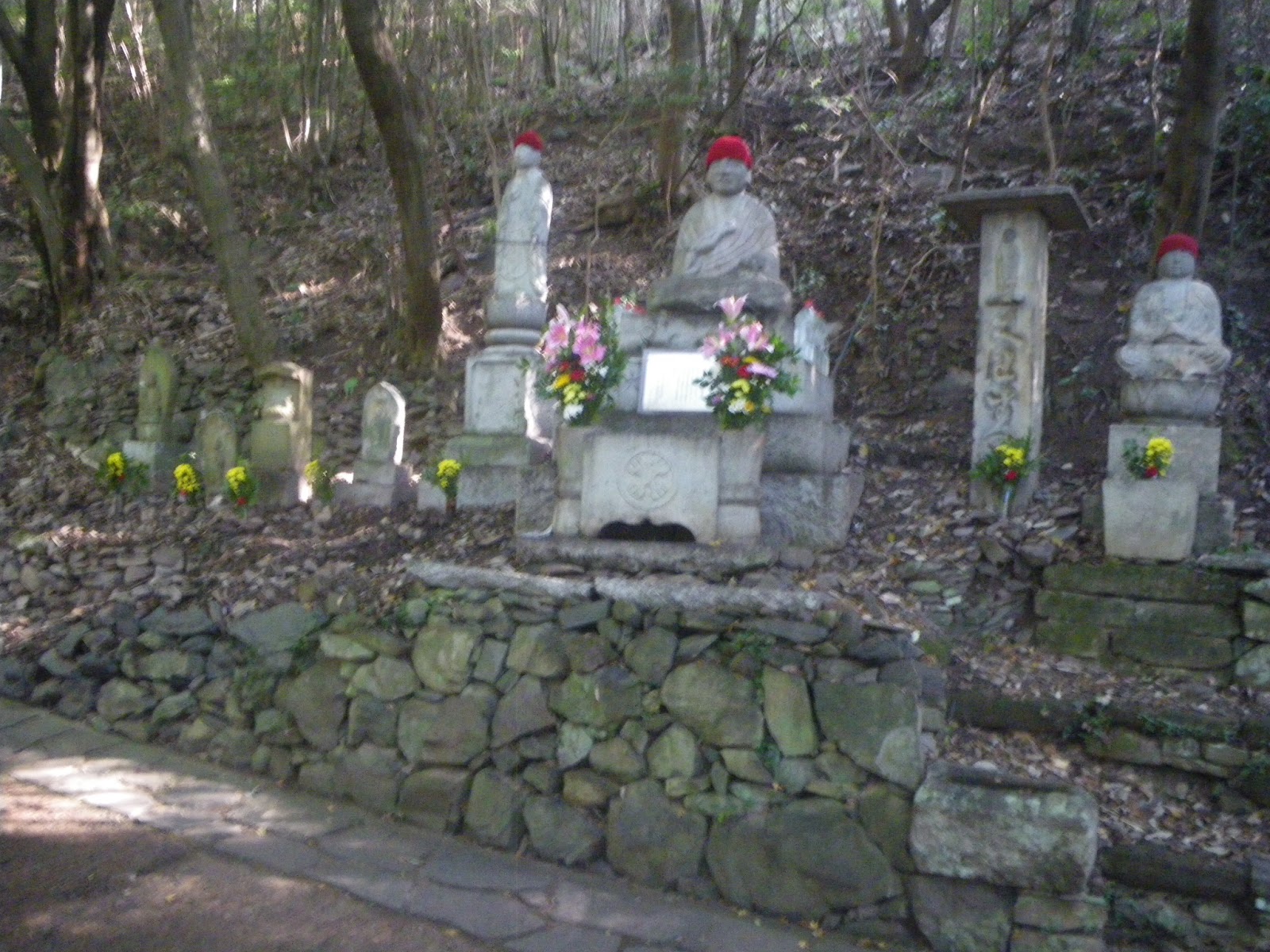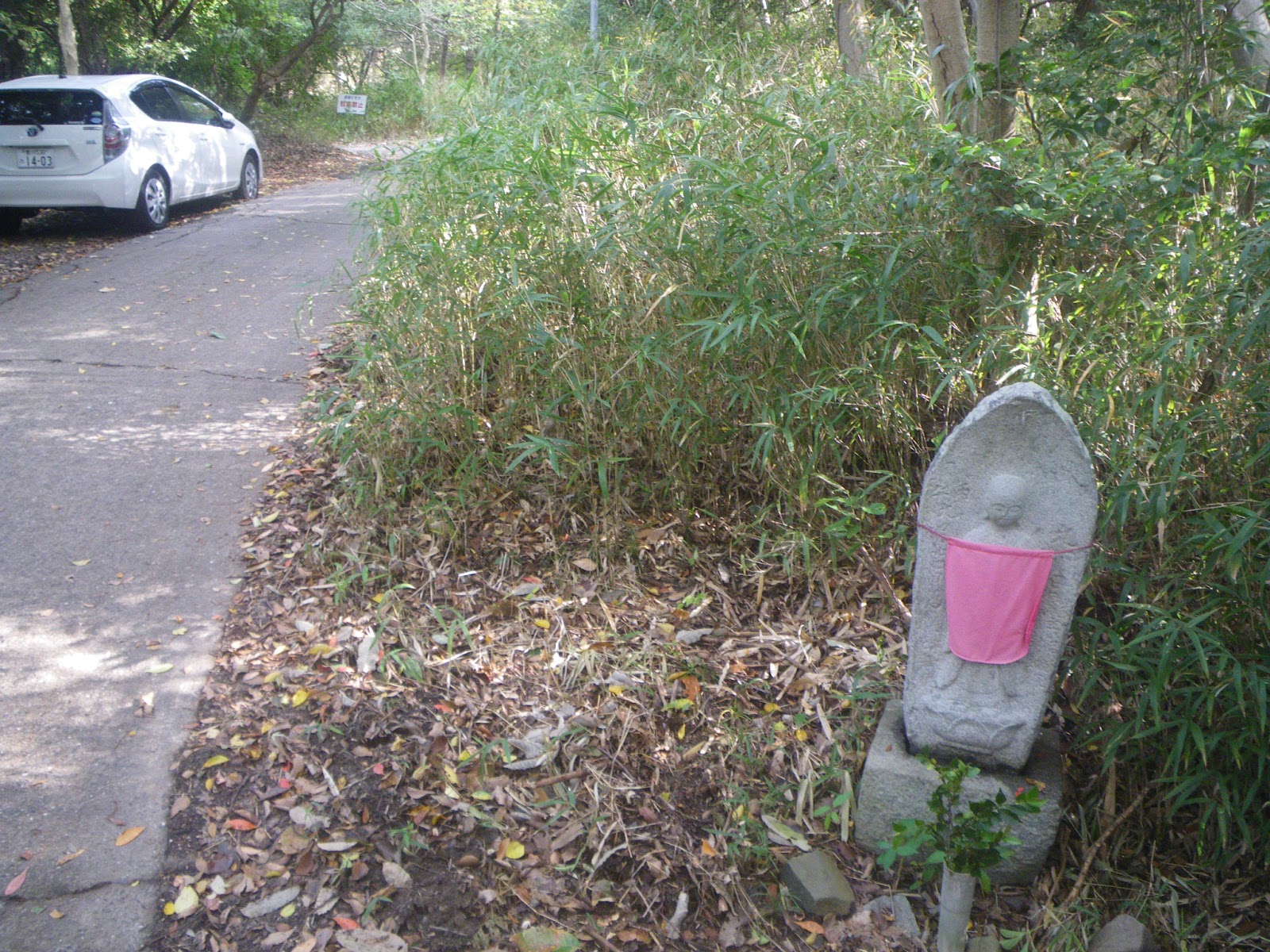 加持水からほどなく道の右手に地蔵石仏、次いで4分程あるくと十二丁、更に5分ほどで十三丁の舟形地蔵丁石が現れる。道は相変わらず舗装され、朝の散歩のお山に上り、そして下りてくる多くの人にすれ違う。