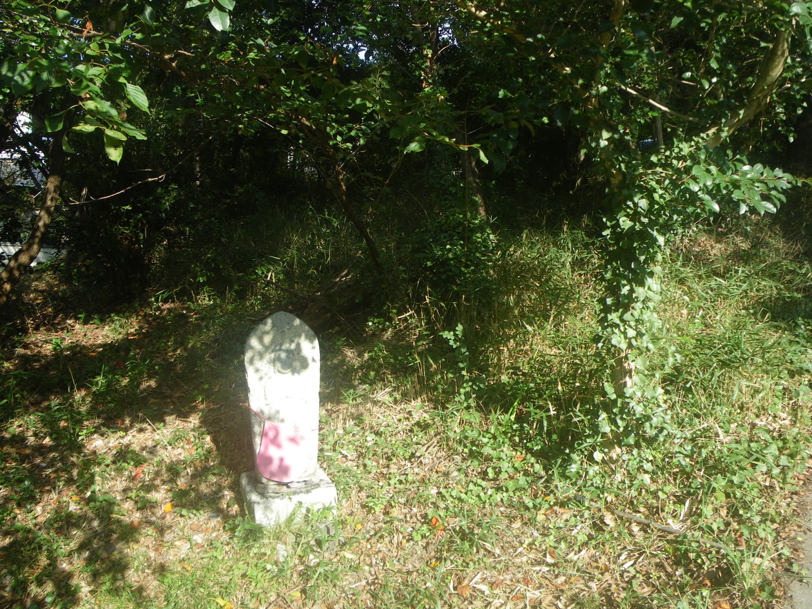 石段付近には標石らしき傾いた石柱、左手の林の中にも舟形地蔵。「右 左」といった文字が刻まれており、標石となっている。