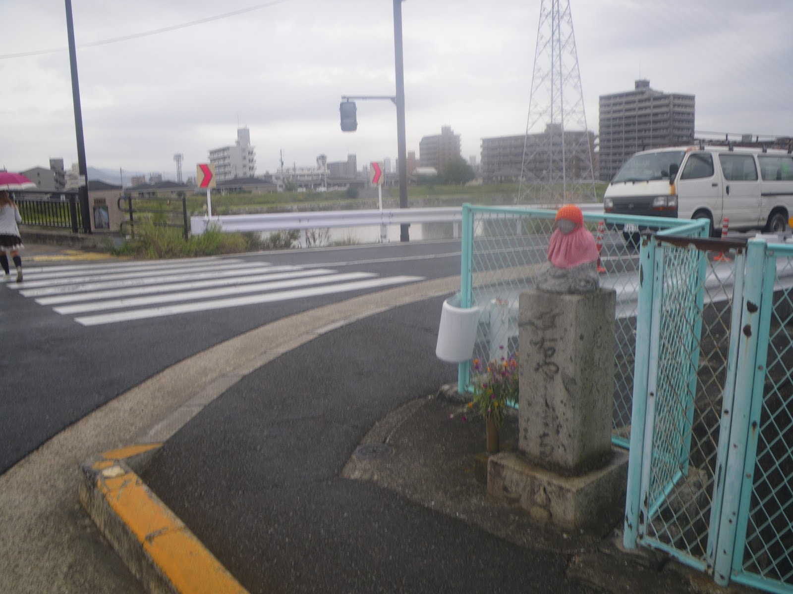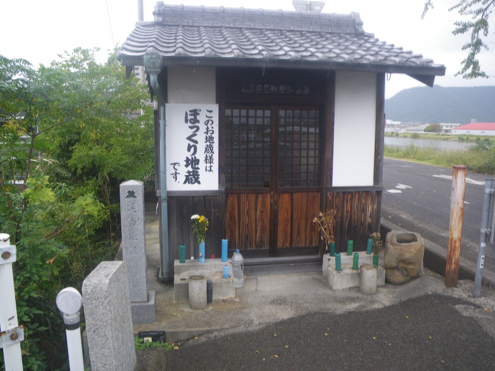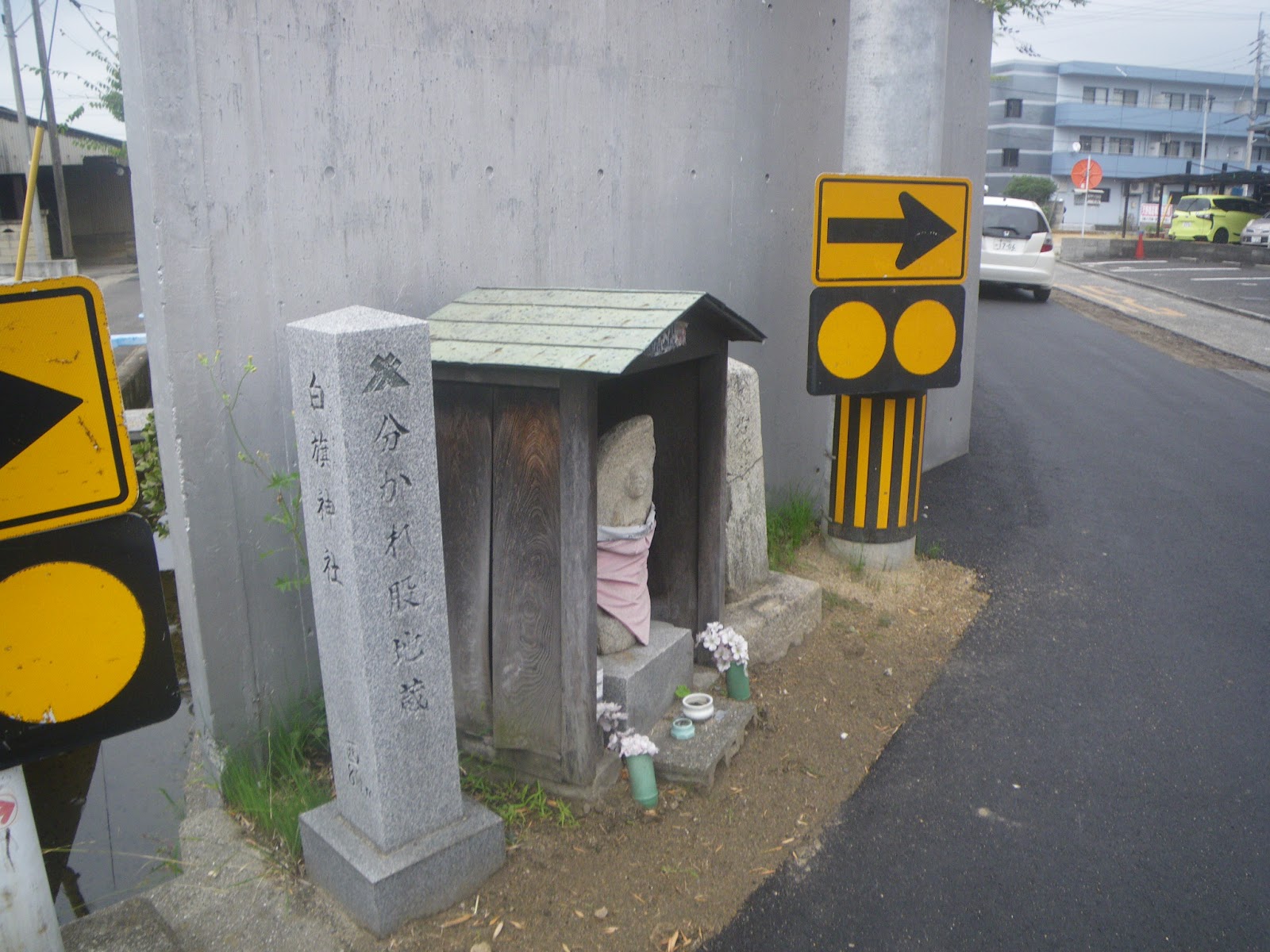 高須公民館の北を右折し北東進した遍路道はT字路で左折。JR高徳線の軌道を潜り県道155号に出る。そこで右折し春日川に架かる春日川橋に。橋の西詰に地蔵堂。「ぽっくり地蔵」とある。また橋を渡ると東詰にお地蔵さまが石柱上に座る標石があり、手印と共に「右やしま寺 明治三十年」と刻まれる。手印に従い県道を更に東に進む。