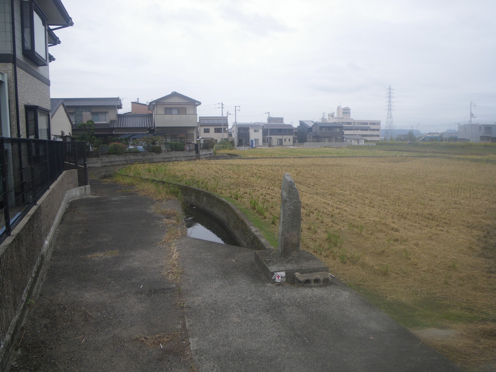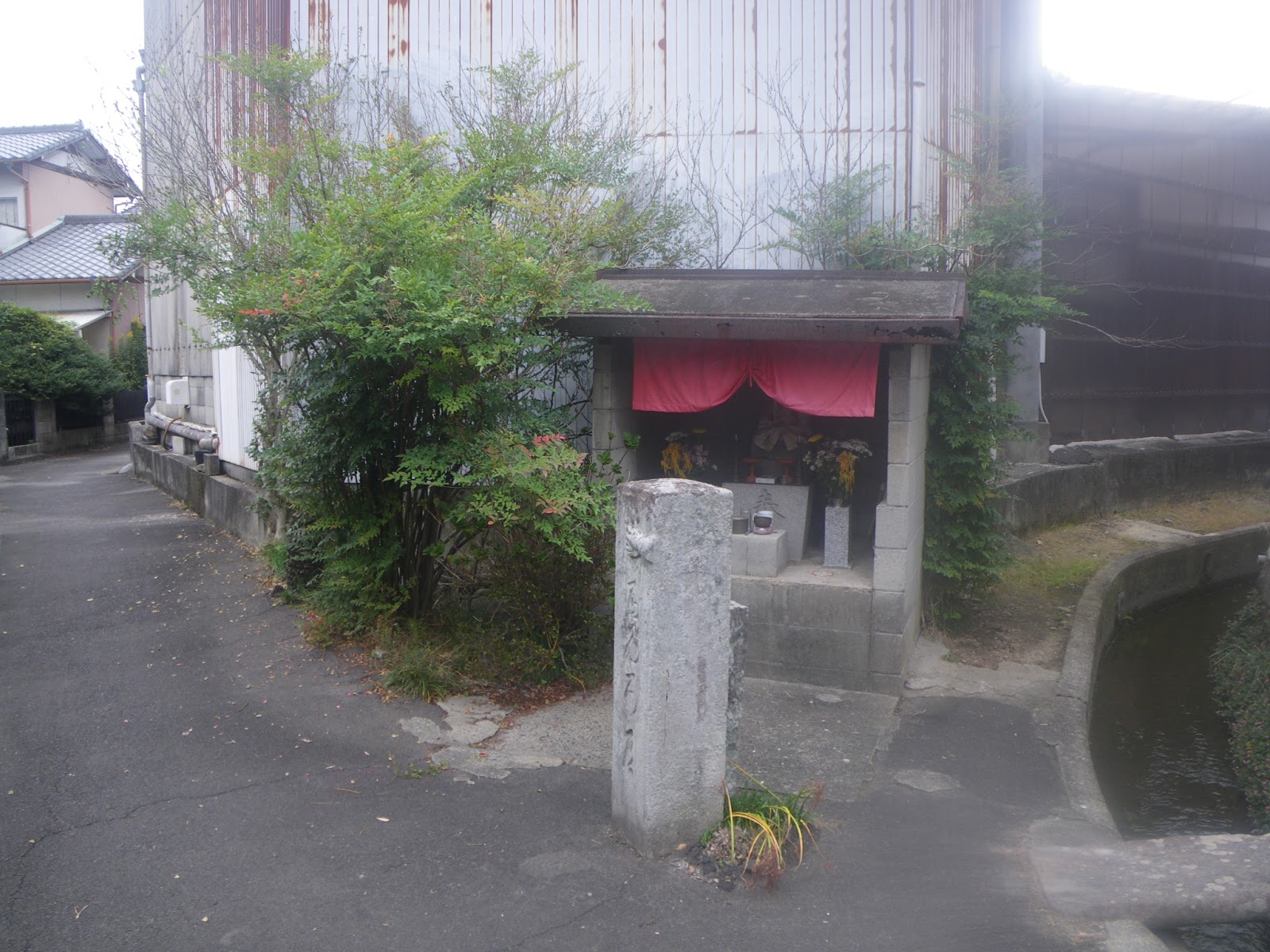 次のルート目安は太田天満宮だが、古い遍路道資料にある標石から北東に進む道はない。ここから先天満宮までは標石もなく、どうしたものかとあちこち彷徨うと、標石から少し南に戻った水路脇に遍路タグがあった。