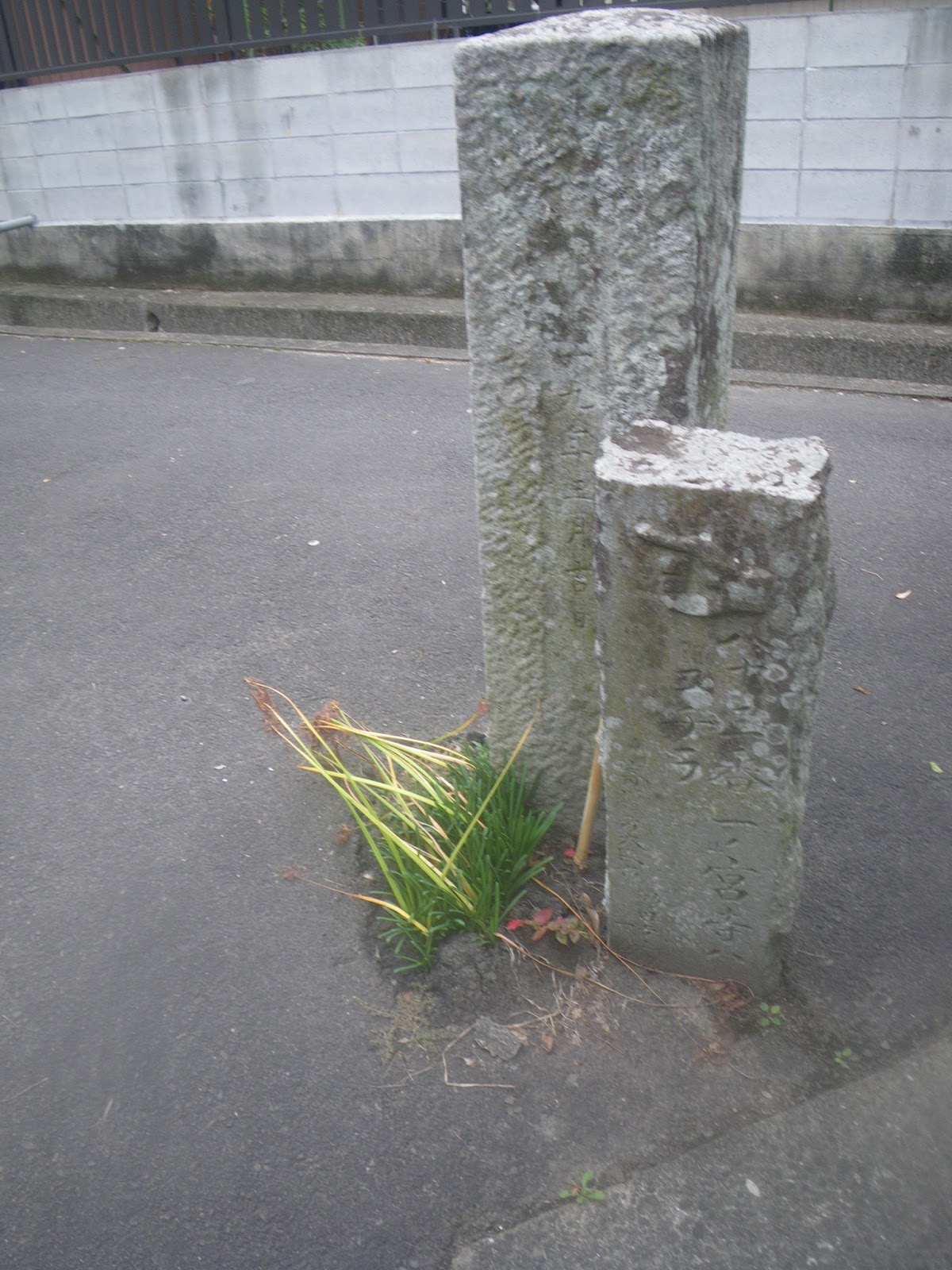 自然石の指示に従い道を左折。水路に沿って北東へと進むと「おさか脳神経外科病院」の南に出る。その東は国道192号。遍路道は国道を渡り東へと進む。ほどなく道の左手に三名神社があり、そこから50mほど進むと道の左手に標石がある。手印に従い左折し北に向かう。