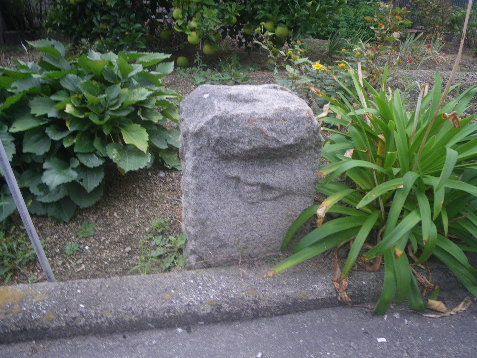 野田池を出発。北に300mほど進み右折し東進。チェックできた標石に北進する道を左折。少し北に進み手印だけの標石を確認。そこから先にT字路。右折し次の角を左折し松縄東公園へと進むと直ぐ、道の右手の家庭菜園端に標石があった。この標石の手印の上には元の石が庇(ひさし)の用に張り出している。あまり見かけない姿の標石だ。