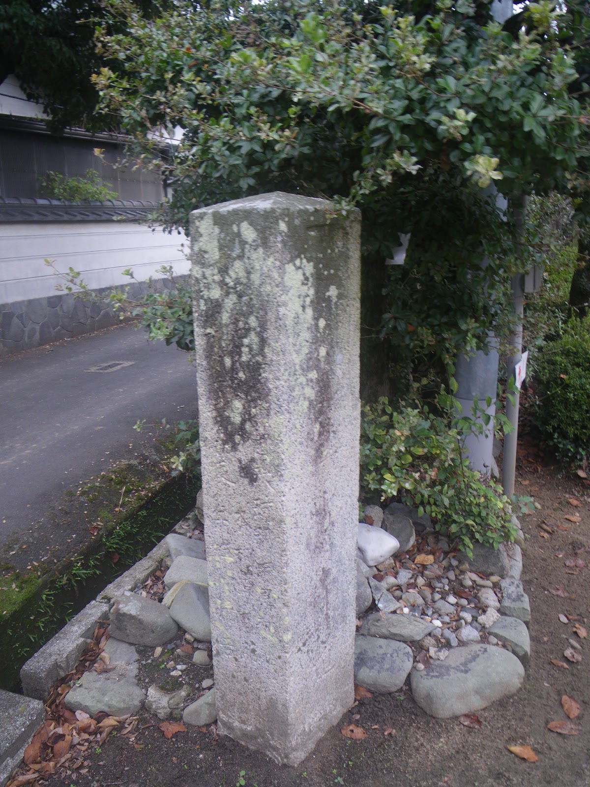 弧を描く水路脇の道を進み県道280号東側に。そのまま光臨寺の北側の道を進むと県道166号に当たる。合流点を左に折れると県道右側に標石。「右屋し満道 左高ま津道」と刻まれる。