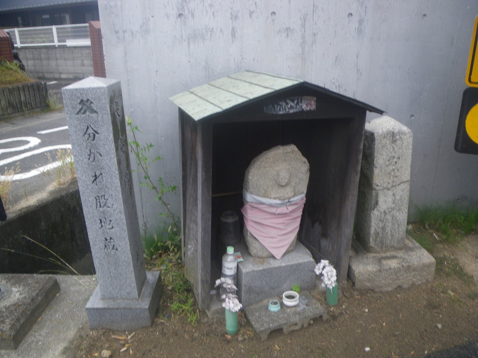 夷神社脇の細路を進み車道に出る。遍路道はここを左に折れて北に向かう。少し進むと道が二股に分かれる。その分岐点に小さな地蔵堂と標石がある。石柱には「分かれ股地蔵」とある。地蔵様の右手にある標石には「右屋島 左高松 寛政十」といった文字が刻まれる。