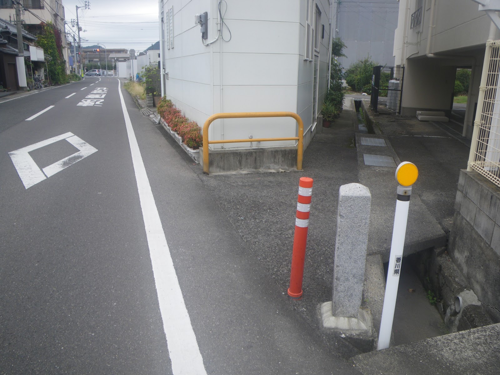 古い資料に拠れば、ルート目安となる標石は琴平電鉄長尾線歩行者踏切を渡ったところにあるとのこと。成り行きで道を進み右折・左折を繰り返し線路脇の道筋に出る。道を東に進み琴電の歩行者踏切を渡ると標石があった。