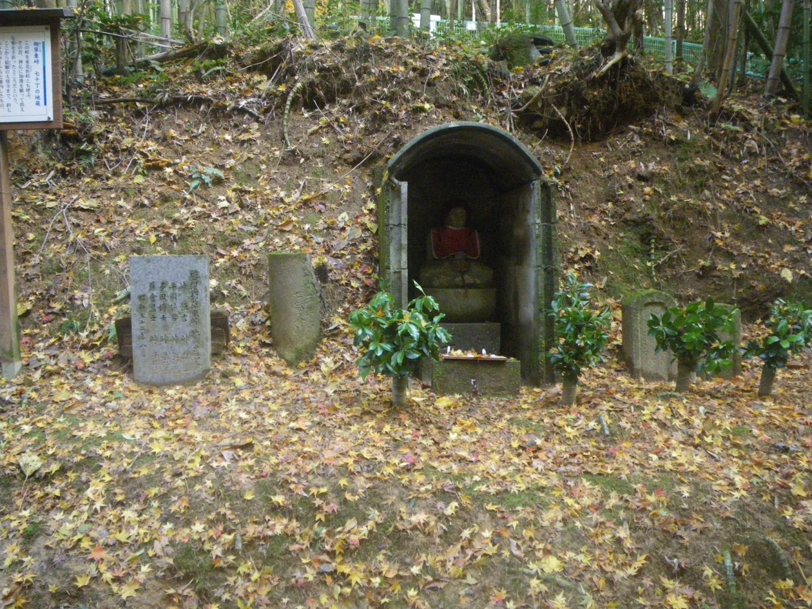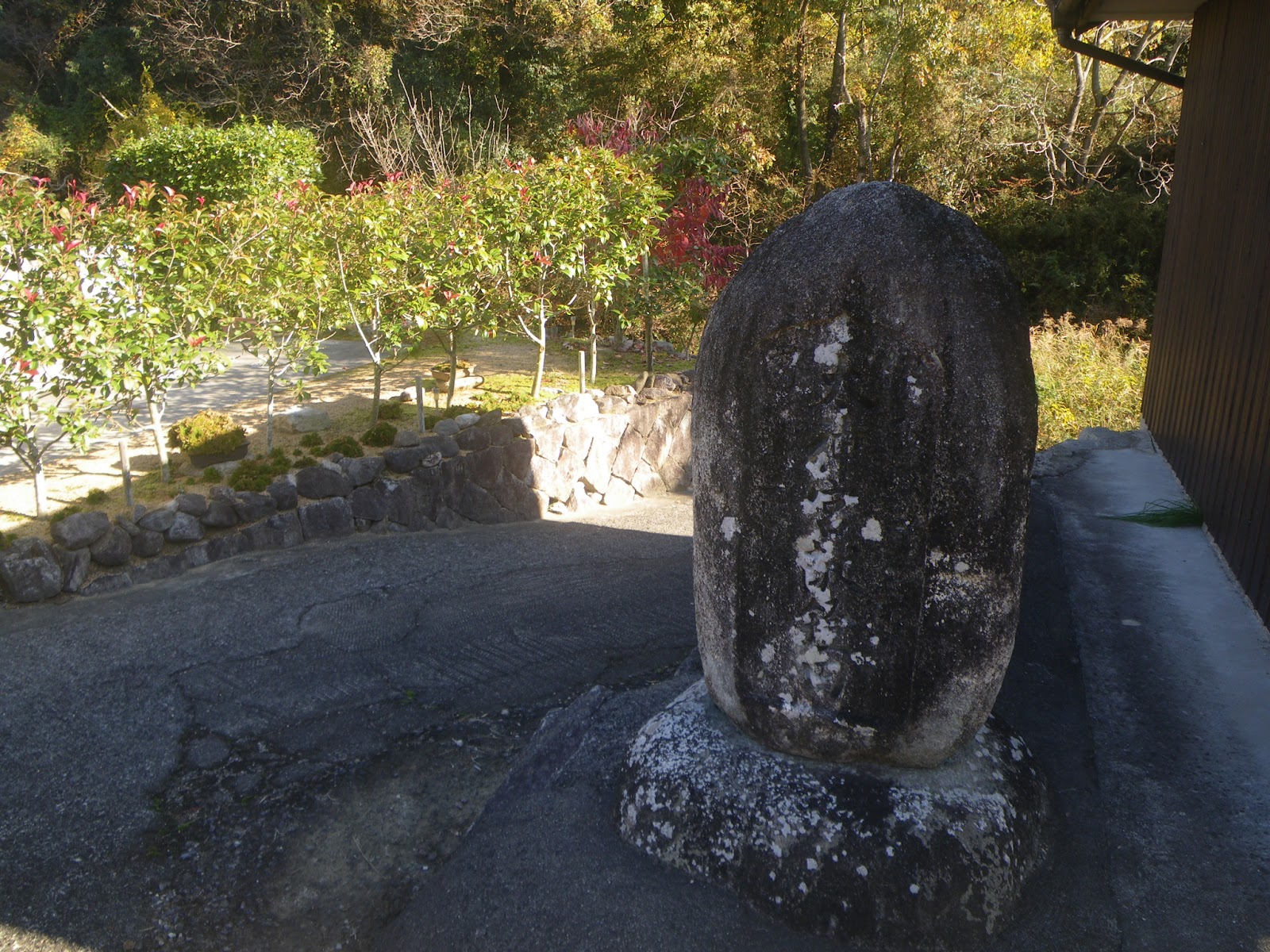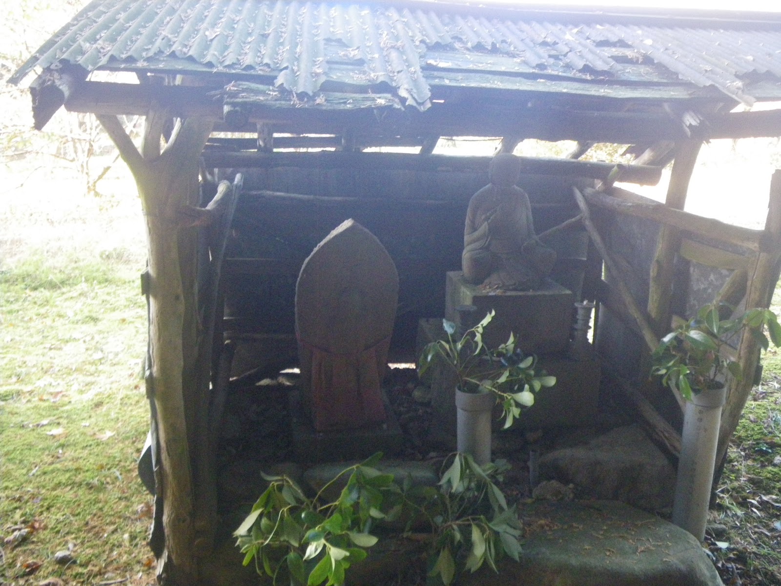 後でわかったことではあるが、小屋の中に大師像、阿弥陀像と共に卵型の忠左衛門の墓碑もあったようだ。