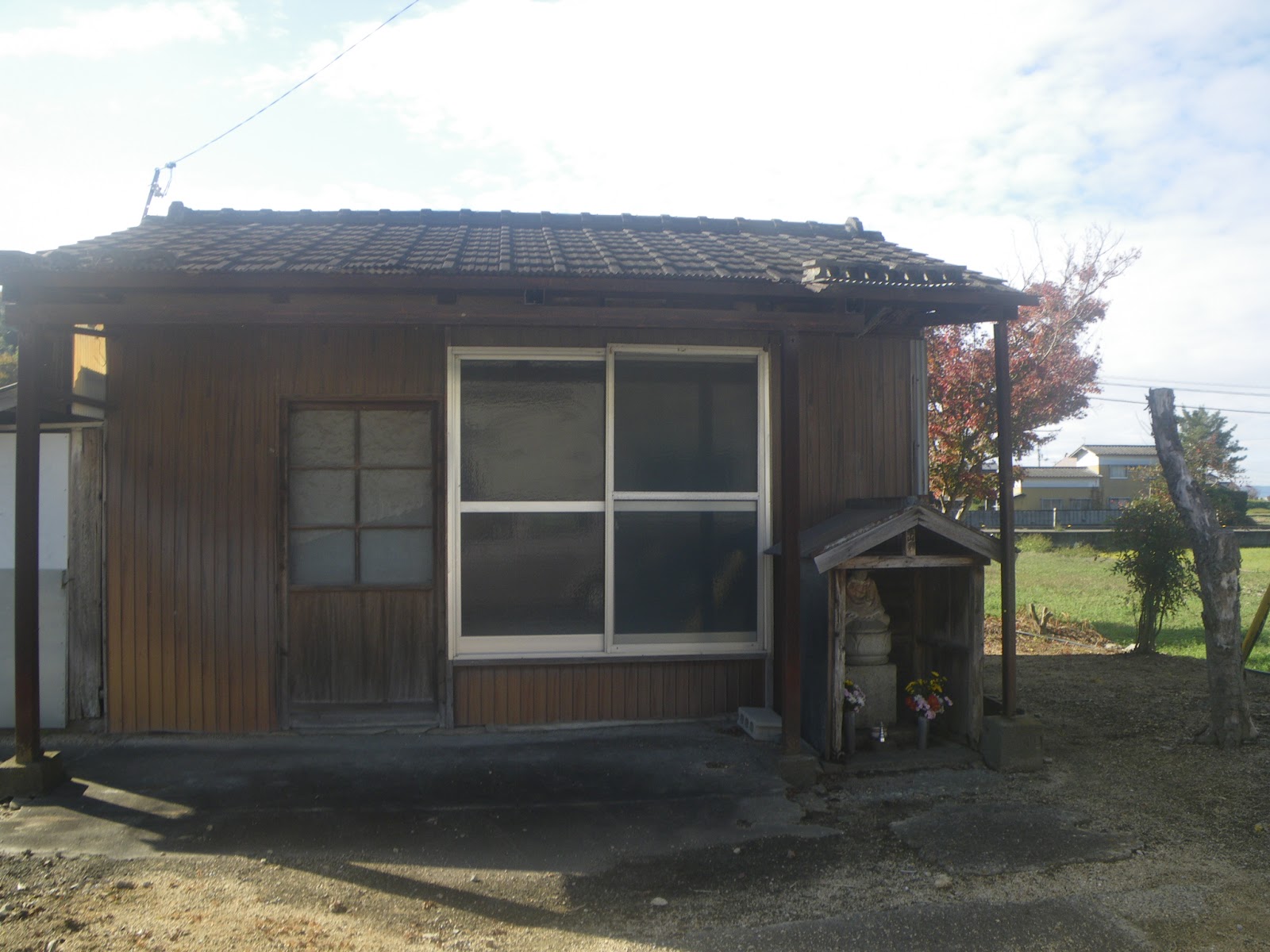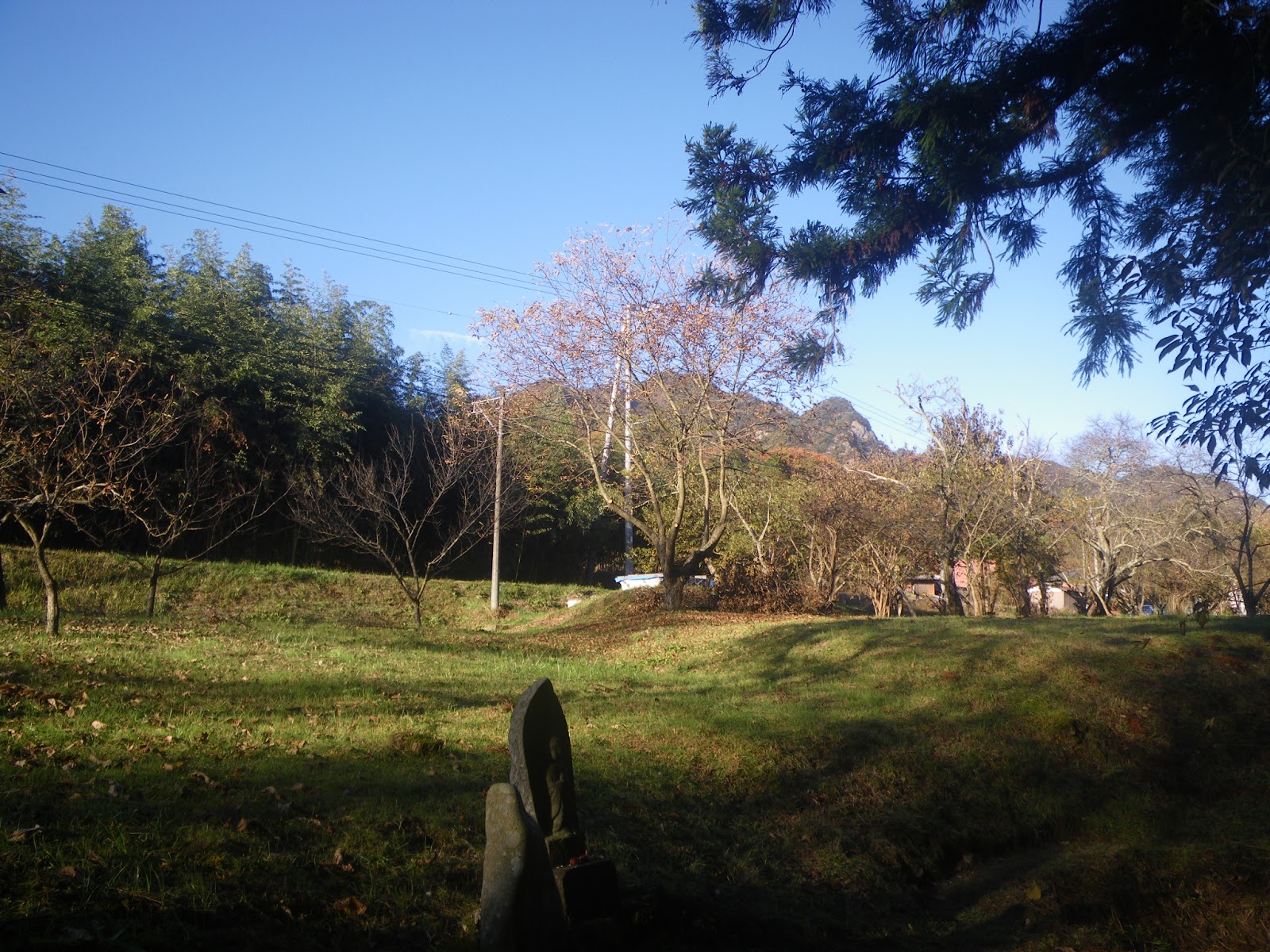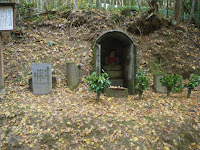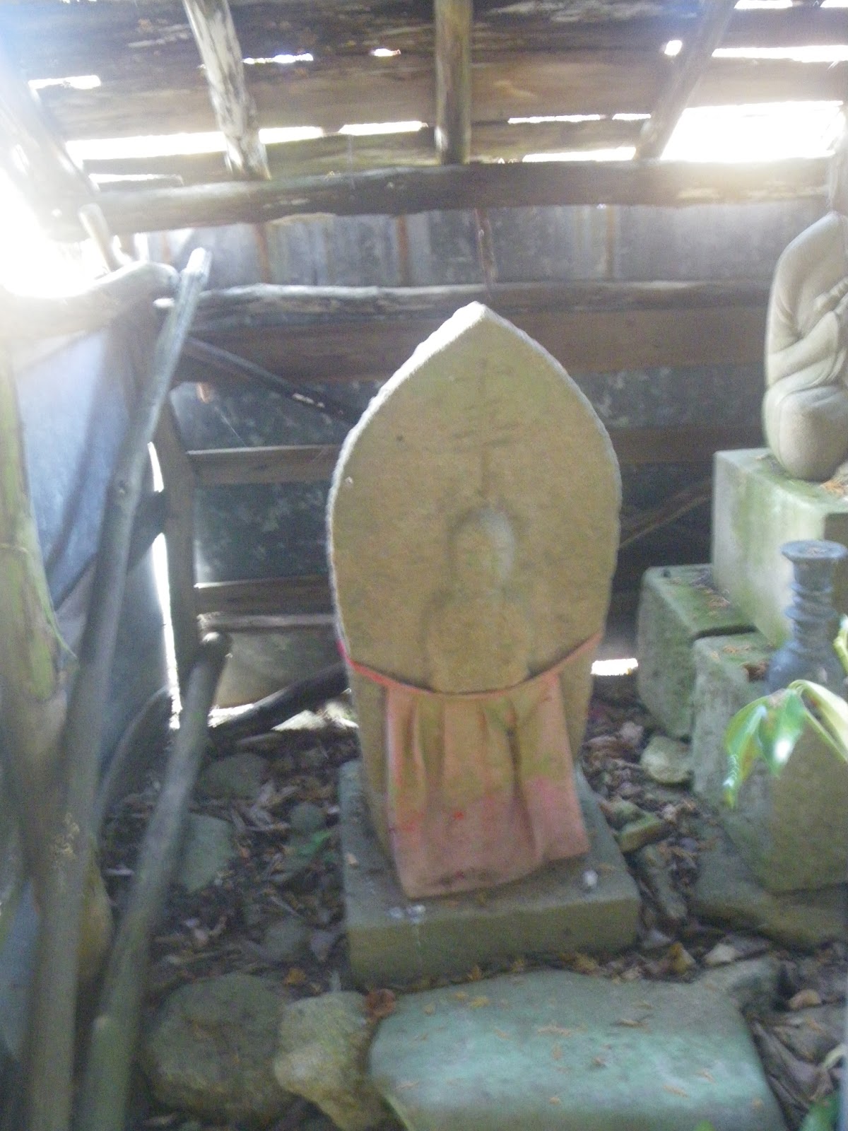 後でわかったことではあるが、小屋の中に大師像、阿弥陀像と共に卵型の忠左衛門の墓碑もあったようだ。