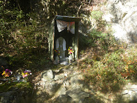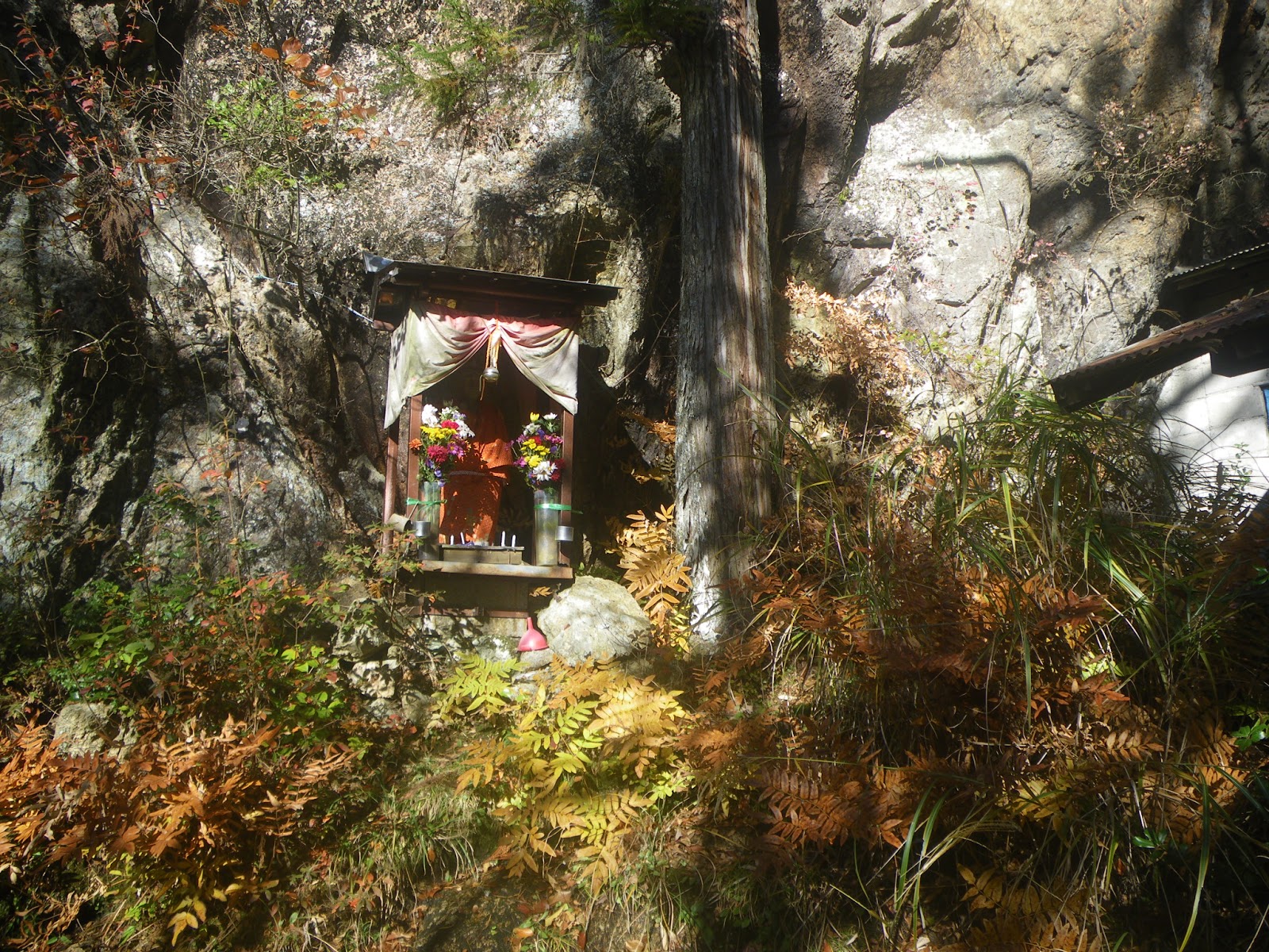 奥の院のある場所は少し開けており。岩場に食い込んだようなトタン張りの小屋とその左手にふたつの小祠に石仏が座る。小屋は施錠され内部は窺えない。祠の石仏は1基は大師像、もう1基は不動明王の姿に見える。祠の左は危険通行止めとなっていた。
