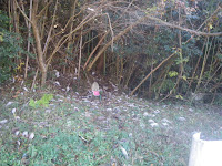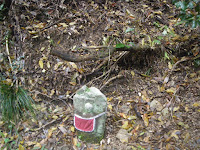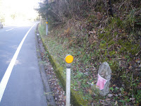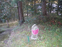 六十九丁石のある辺りから道の左手に沢が現れる。花折峠が分水界ともなっているので、この沢は吉野川水系の川に注ぐことになる。道を少し下るとその先にも上部が破損した丁石。「六十八」丁石だろう。
