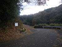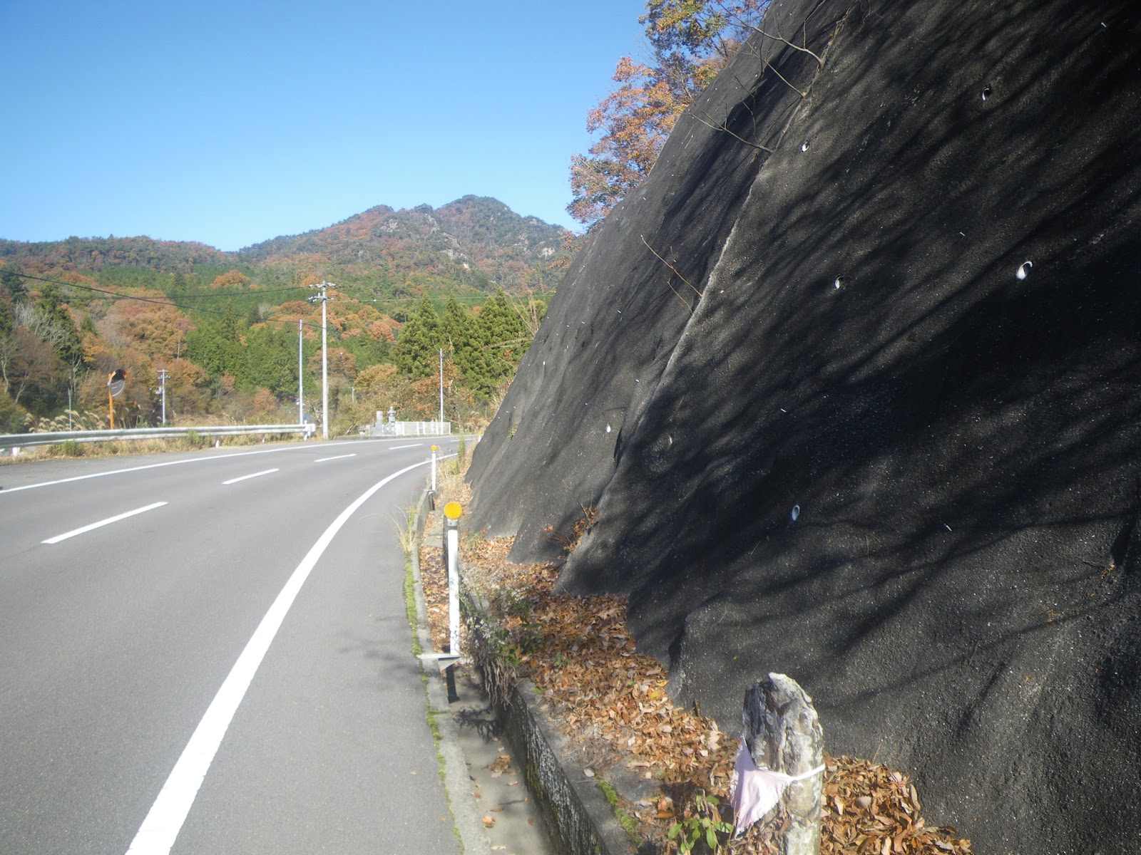 思いがけず興味深い展示物に出合った交流センターを出て花折峠への上り道に入る。道は県道3号が前山ダム湖南西端から東へと折れる箇所から南に入る。道は峠越えの山道との予想に反し完全舗装されている。トラックの往来が多いのは、砕石場といったなんらかの施設があるからだろうか。