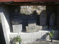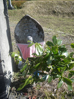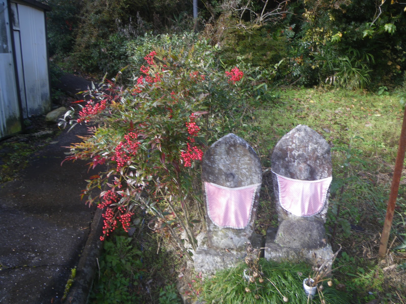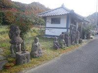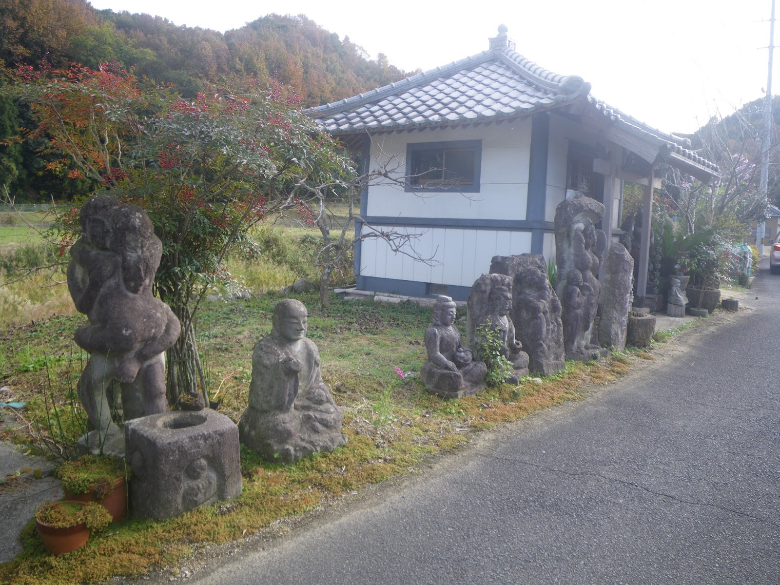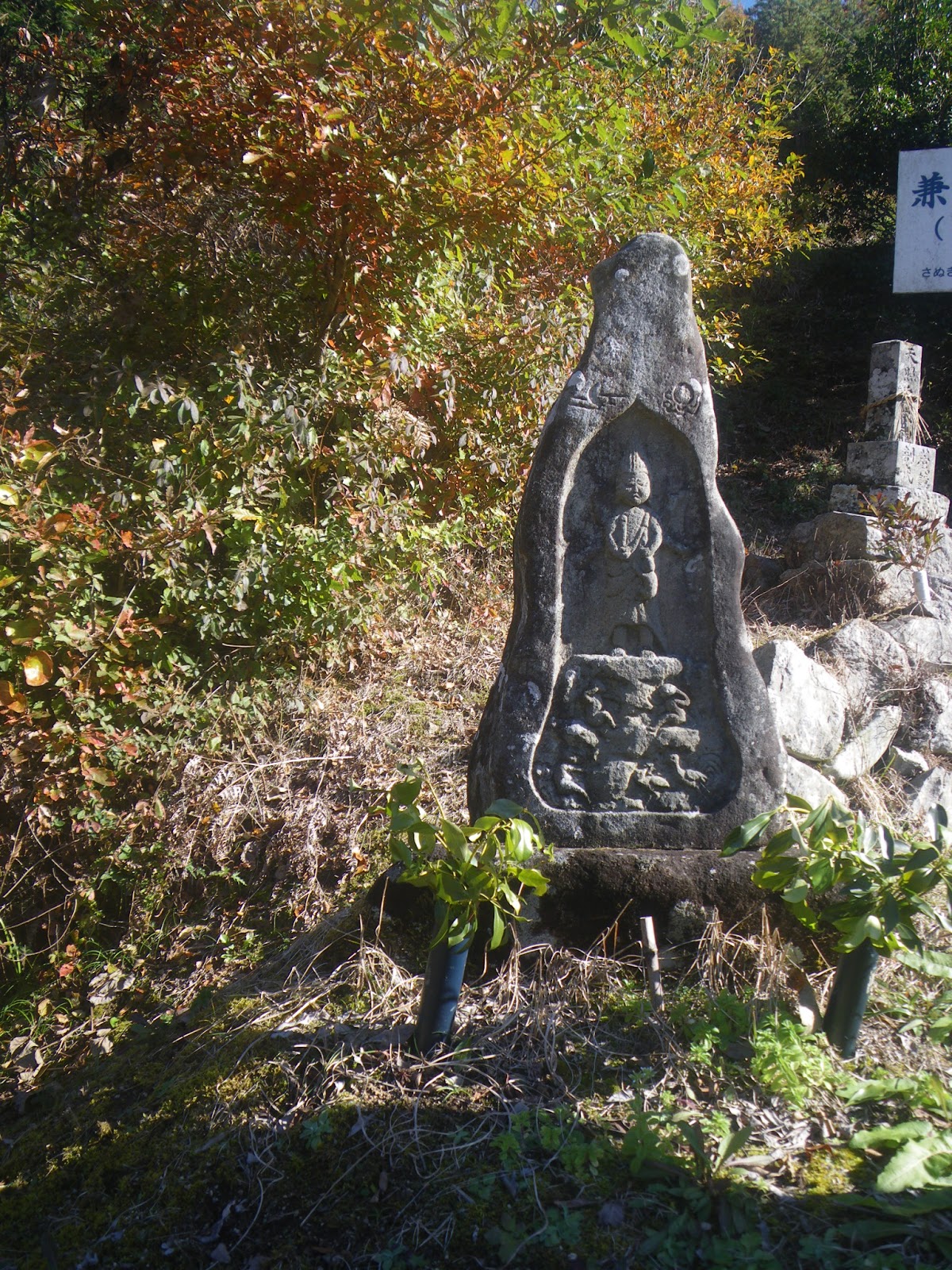 一旦県道3号に出た遍路道は、ほどなく左の旧道へと斜めに入る。しばらく道なりに進むと自然石に刻まれた道祖神、また双体道祖伸に続き道の左右に石仏群が並ぶ。作風は高地蔵のところで見た「一貞作」と刻まれた石仏と同様のテイスト。道の右手の塀囲いのお宅の主が「一貞」さんだろうか。