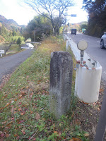 国道377号は槇川の谷筋へと下り、右手より槇川に沿って上って来た道と合流する手前に27丁石。「廿七丁」と刻まれる。