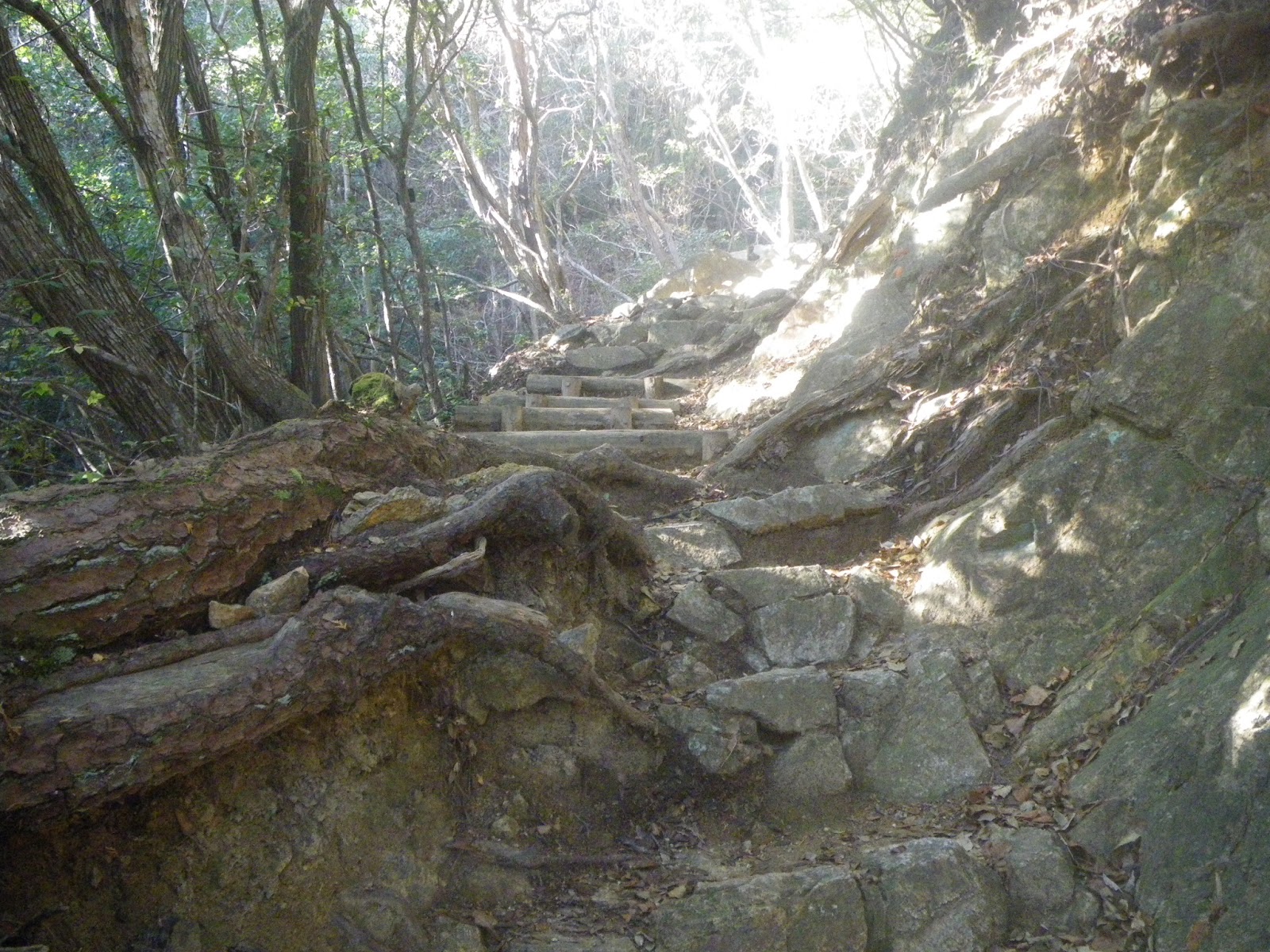 標高350m辺りからは緩やかに高度を上げ標高385mの辺りに遍路休憩所があった。傍に「古道と砦」の案内。「江戸時代初期に、「元暦のむかし、義経が矢(屋)島に向かった路」と澄禅大徳が『邊路日記』に書き、巨石に目印として銭をはさんで、平氏が祖谷へと落ちて行ったとの伝承のある古道―花折道(約2キロ)、少し北へ下ったところに標識がある。 東讃岐の豪族寒川氏の居城『昼寝城』関連の砦跡が、今も山の尾根で観察できる場所がすぐ北側にある」と記される。