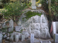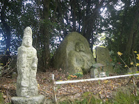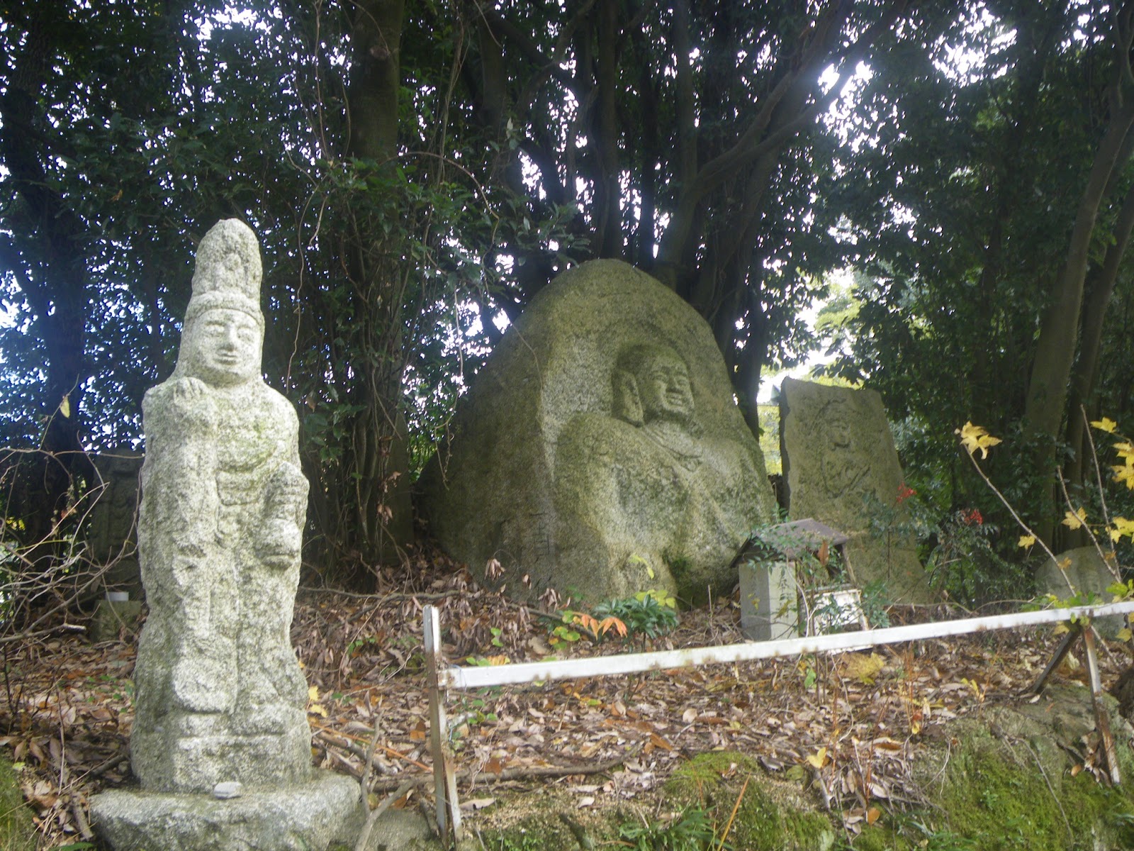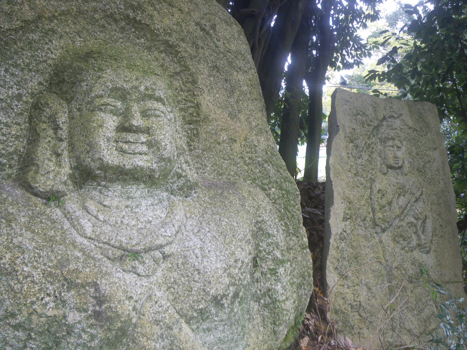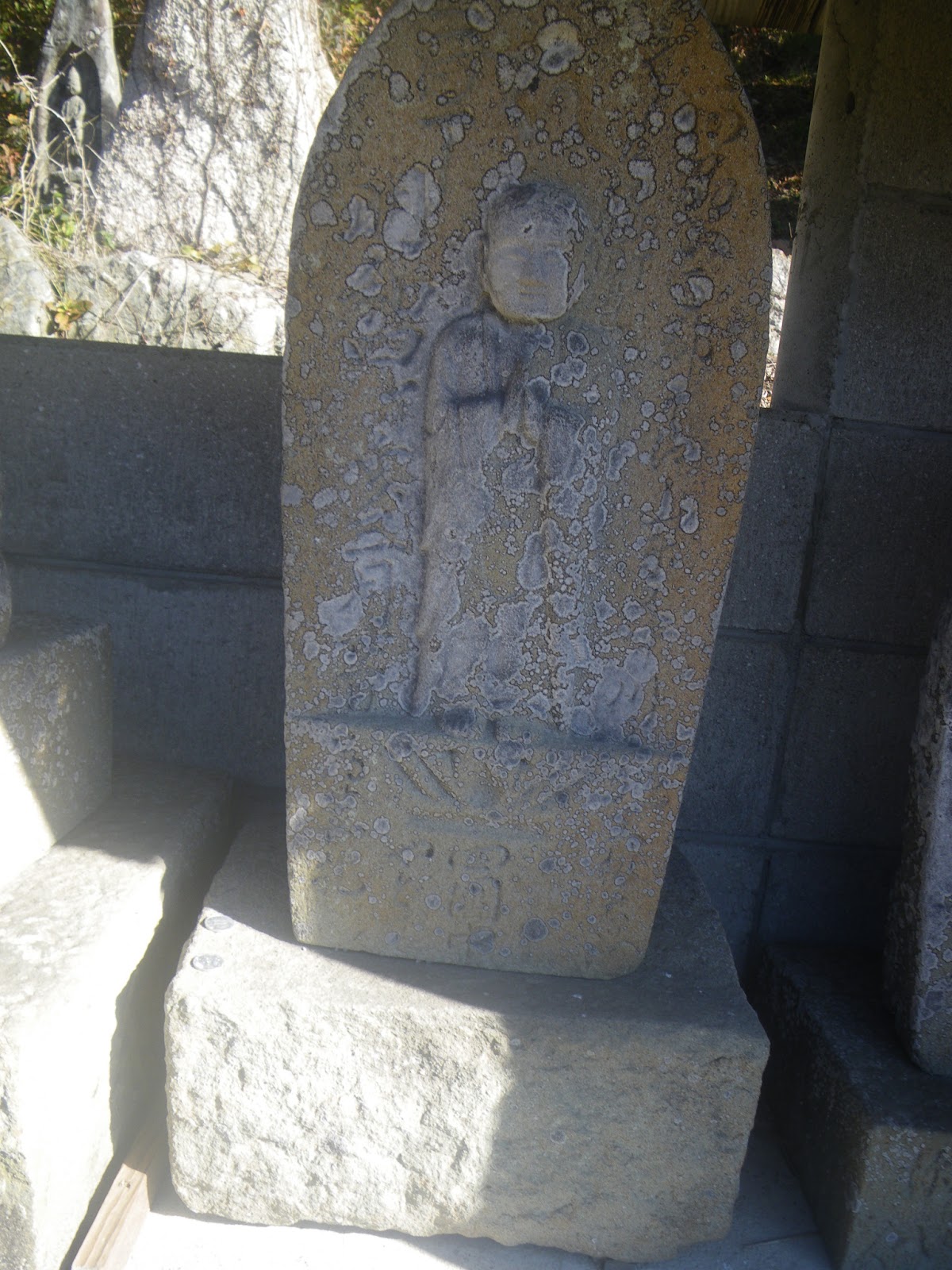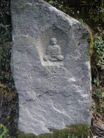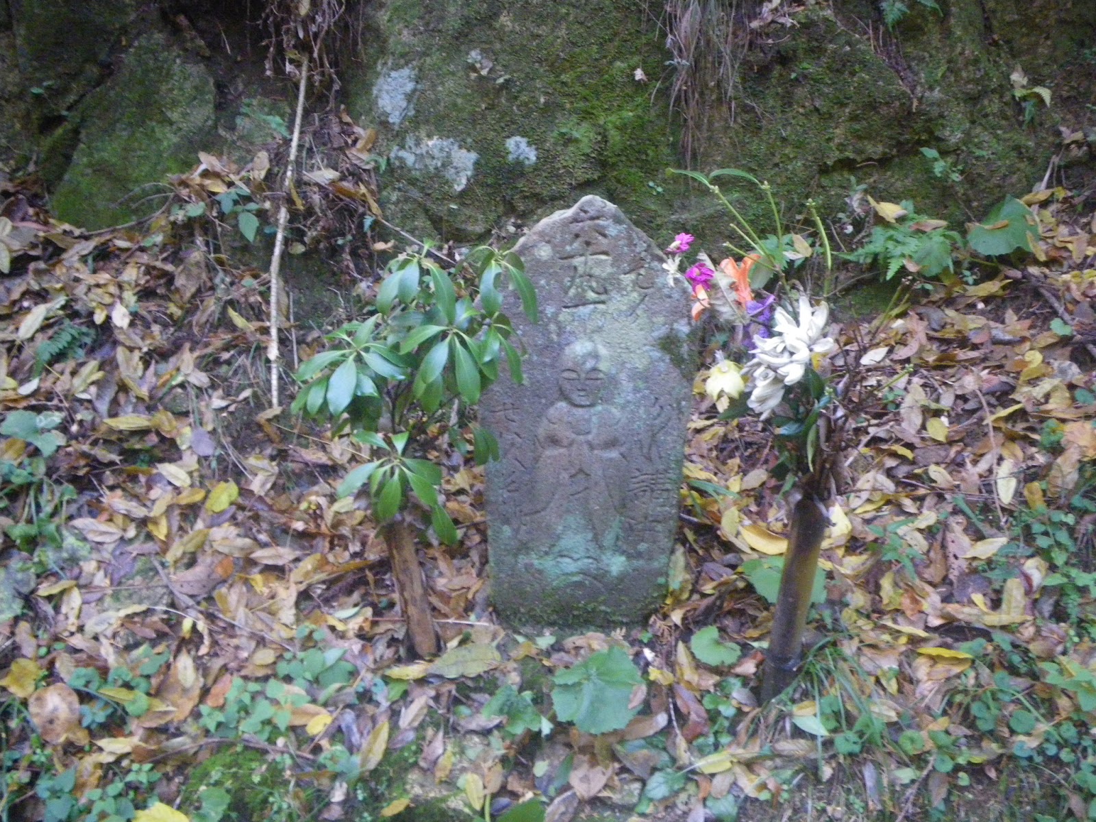 大師像や忠左衛門の墓石は見逃したが巨岩に彫られた石仏群は印象に残る。「少し奥まったところに忠左衛門の墓碑がある」との記述を読み間違え、旧道側から続く石段を上るのが「奥」だろうと進むと、県道3号側に出る。そこにも巨岩に彫られた石仏と同じ風情の石仏が並んでいた。「一貞作」とも刻まれており、どうも地元の仏師の作のようだ。忠左衛門の墓標を探し彷徨うが、見つかることがなかったのは上述のとおり。