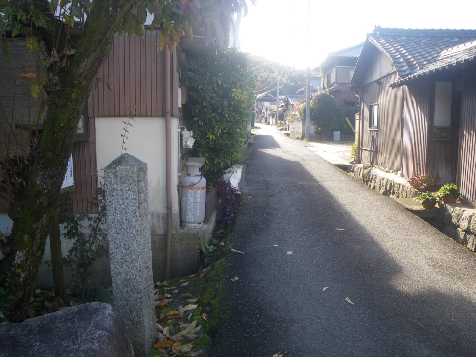右手に入る土径を進むと無住かと思われる民家がある。その軒先を抜け、道を進み前面が開けた道の左手に自然石の石碑と共に十六丁石が立つ。旧遍路道の趣を残す景観が、誠にいい。