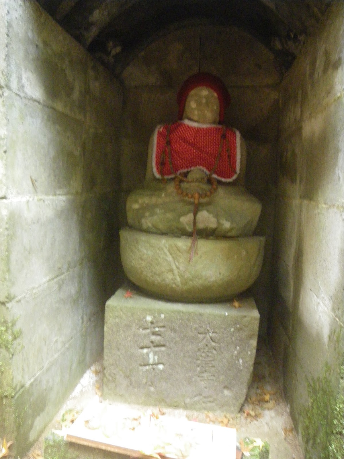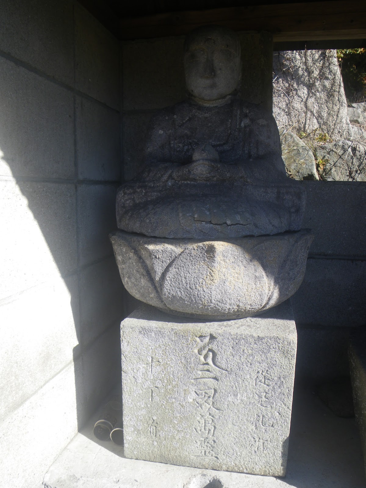 Wikipediaには「境内から女体山への登山道を0.5km上がると奥の院との分岐があり、その0.2km先に堂がある。阿弥陀如来や弘法大師など6体の石仏を祀っていて、その堂の左には、空海が本尊に水を捧げるため杉の根本を独鈷で加持すると湧き出た清水が今も枯れず直径1m弱の池になっている。広場の先(崖崩れの危険の為通行止め)の岩壁に、上には虚空蔵菩薩を下の左右には胎蔵界と金剛界の大日如来を表す3つの梵字が刻まれ、この場所で行が行われたとみられる」とあった。石仏にお参りし境内に下りる。