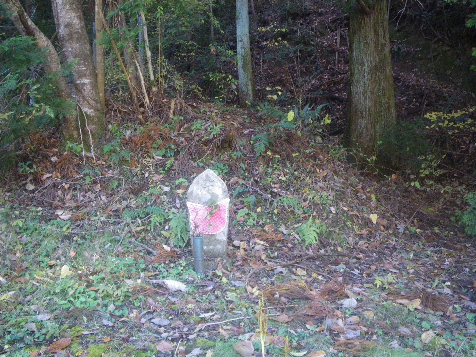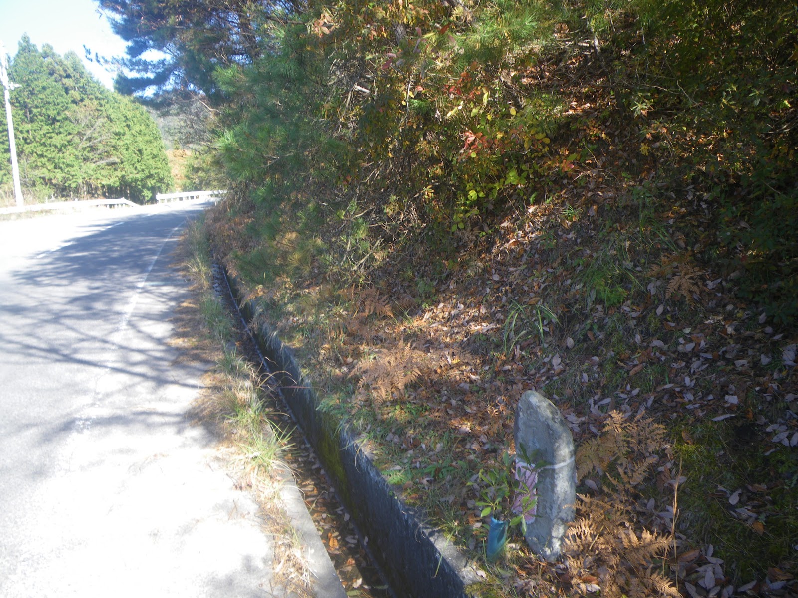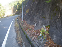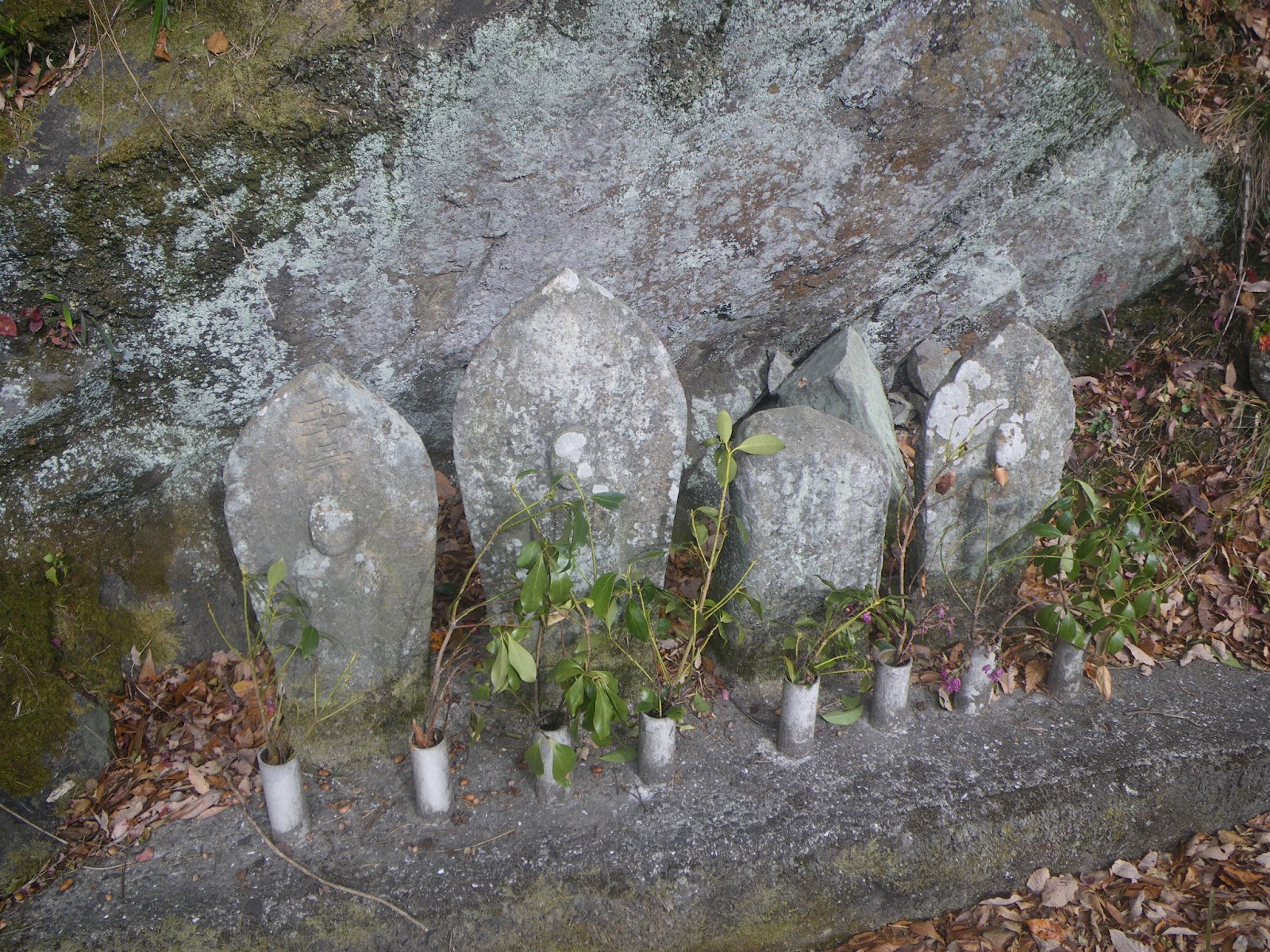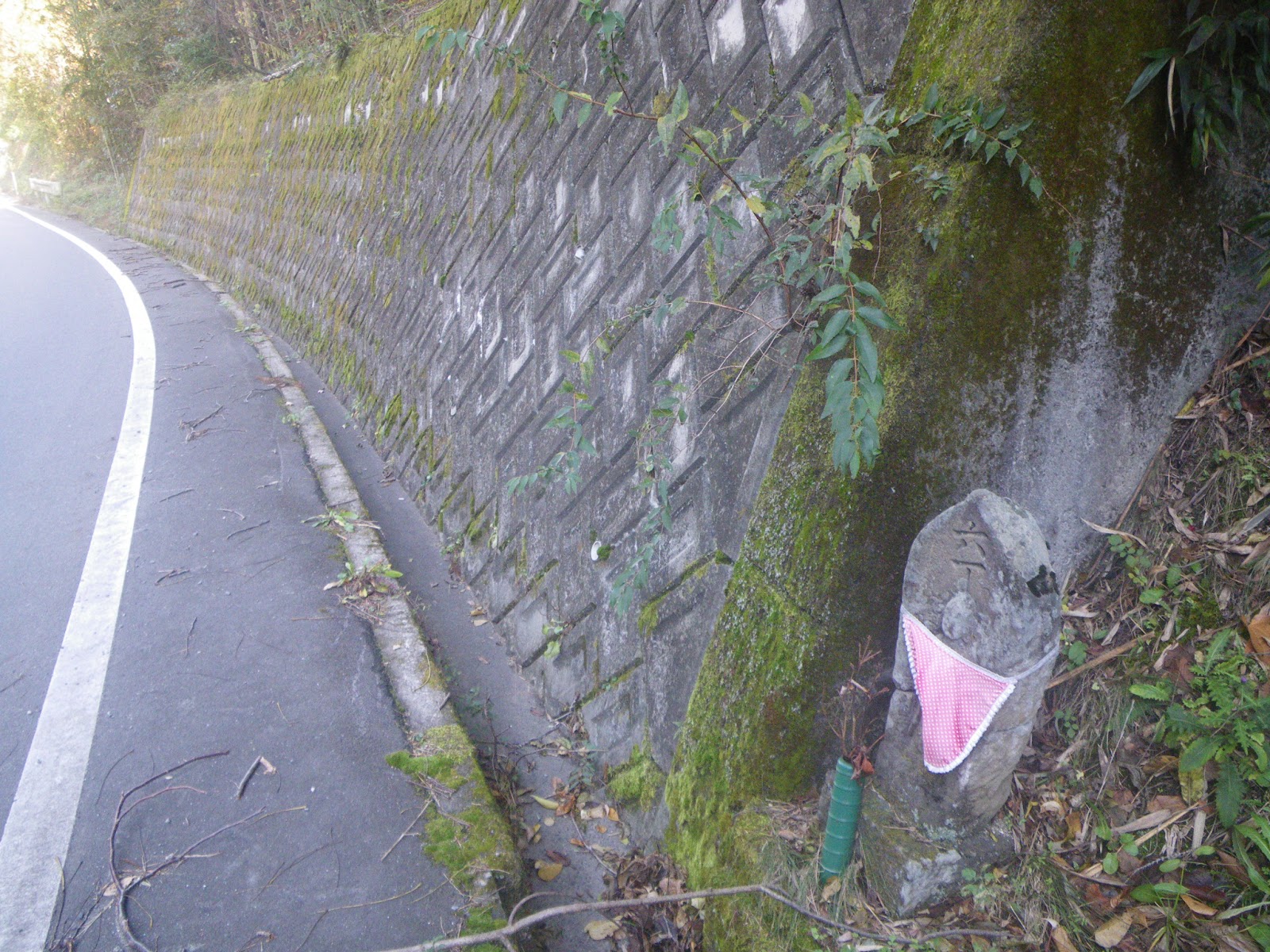 今まで花折峠と書いてきたが、「東花折峠」が正確な呼称のようだ。その峠の左手、ブロックの中に地蔵座像。台座に「七十丁」と刻まれる。またその右側には遍路墓。「寛政七年 大阪」「寛政六年」といった文字が刻まれる。