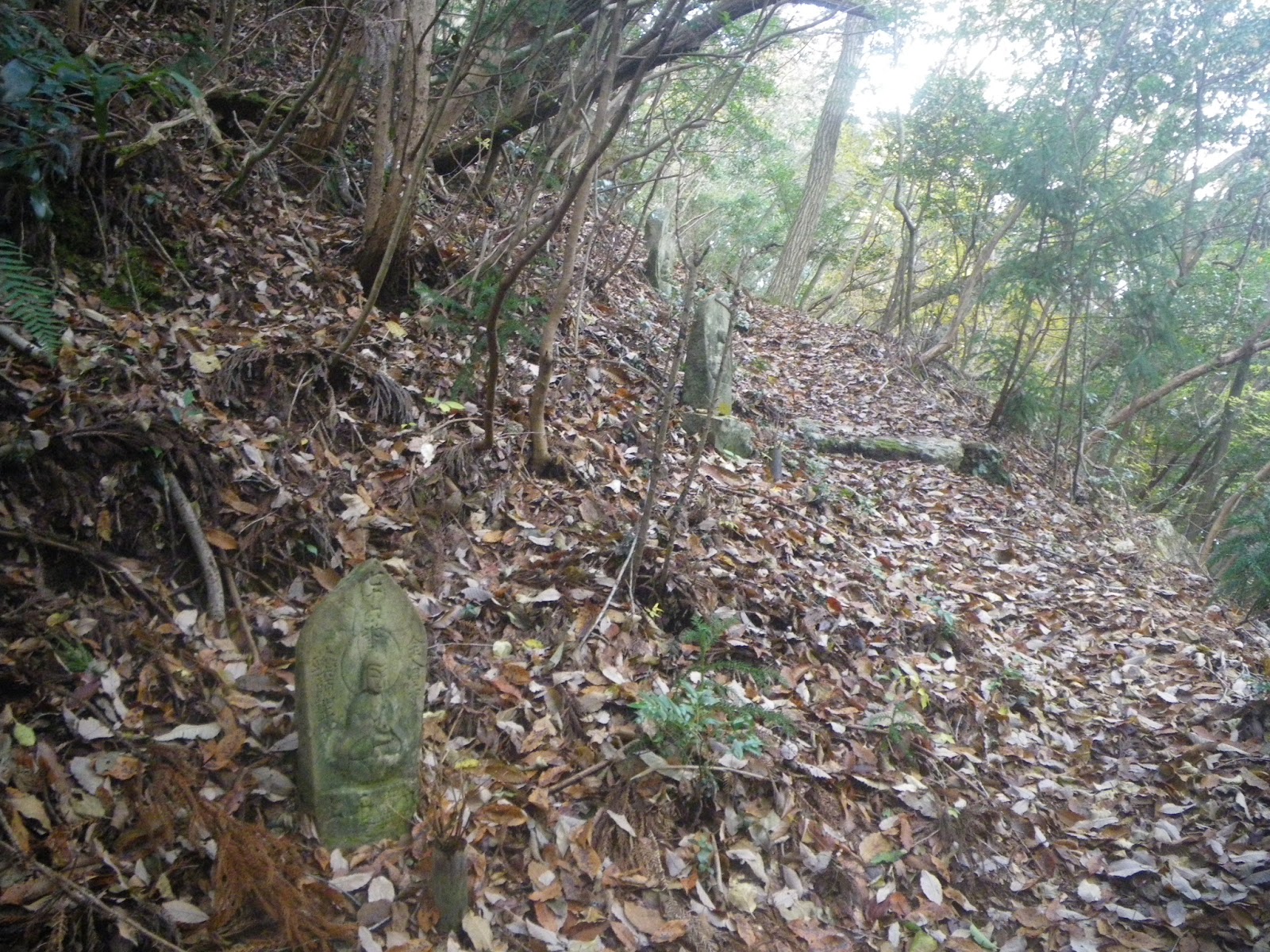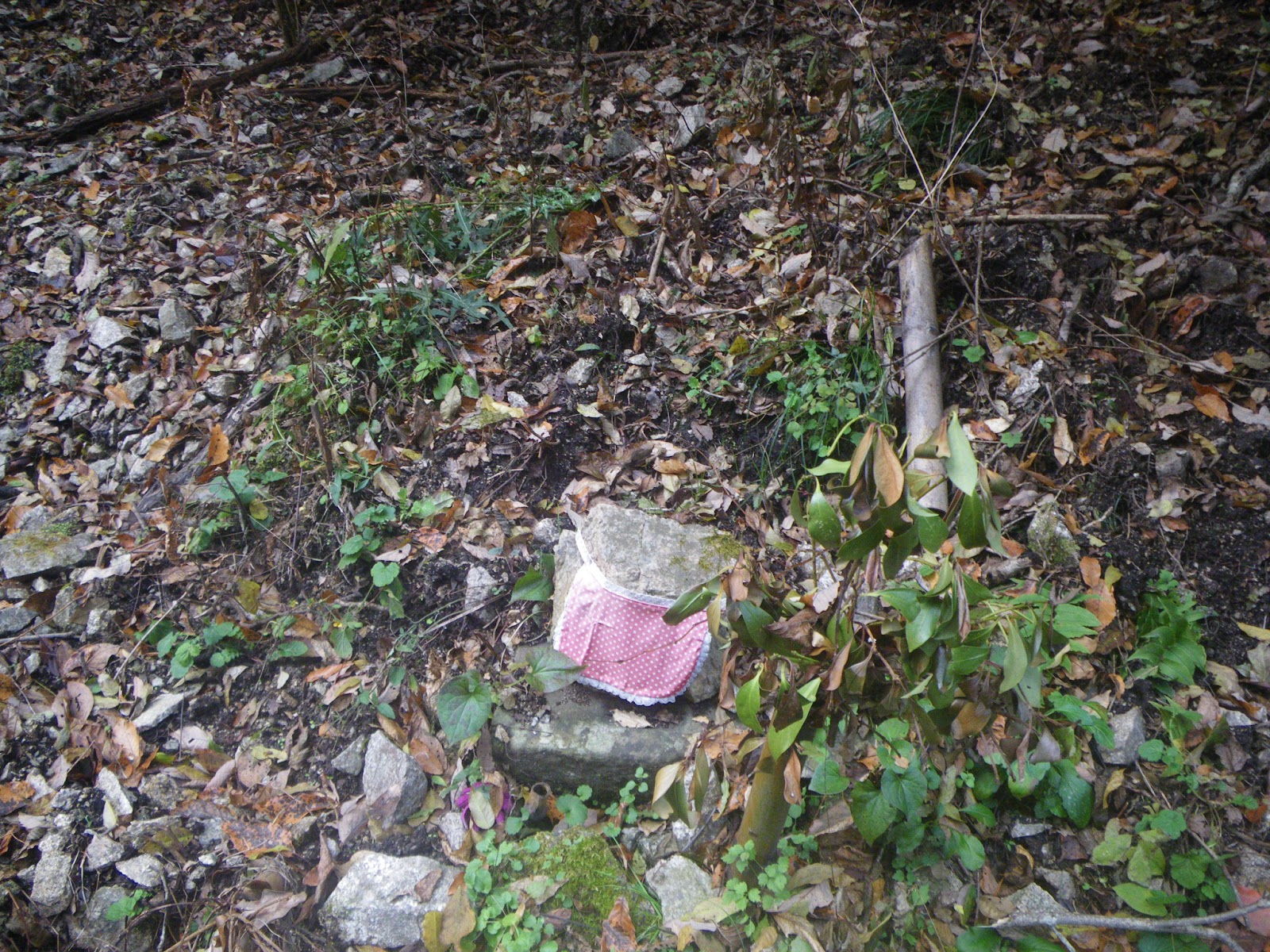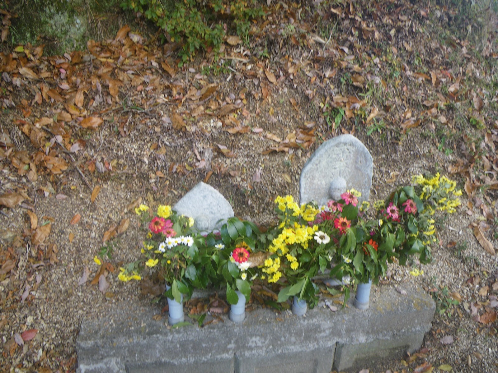 今まで花折峠と書いてきたが、「東花折峠」が正確な呼称のようだ。その峠の左手、ブロックの中に地蔵座像。台座に「七十丁」と刻まれる。またその右側には遍路墓。「寛政七年 大阪」「寛政六年」といった文字が刻まれる。