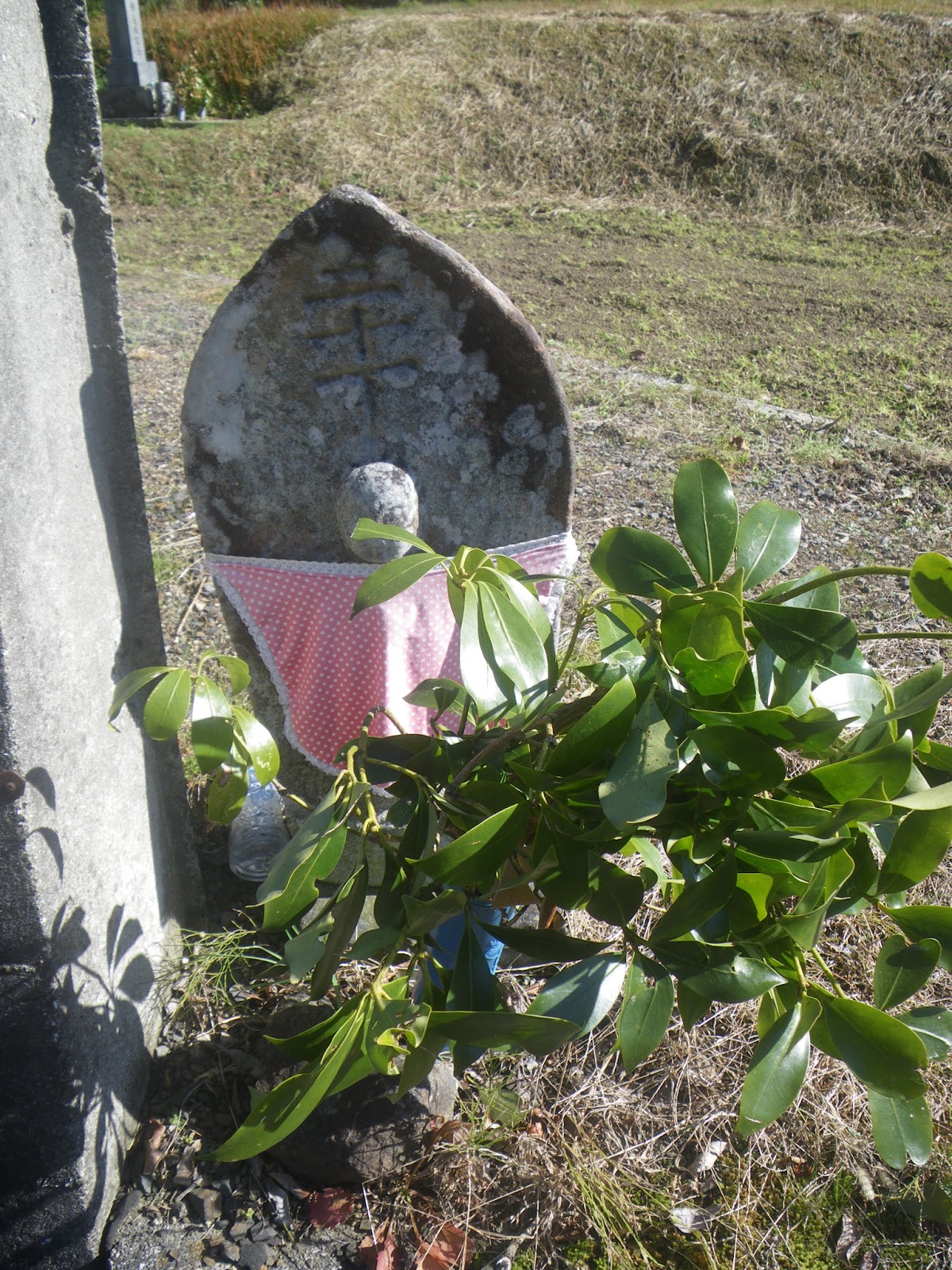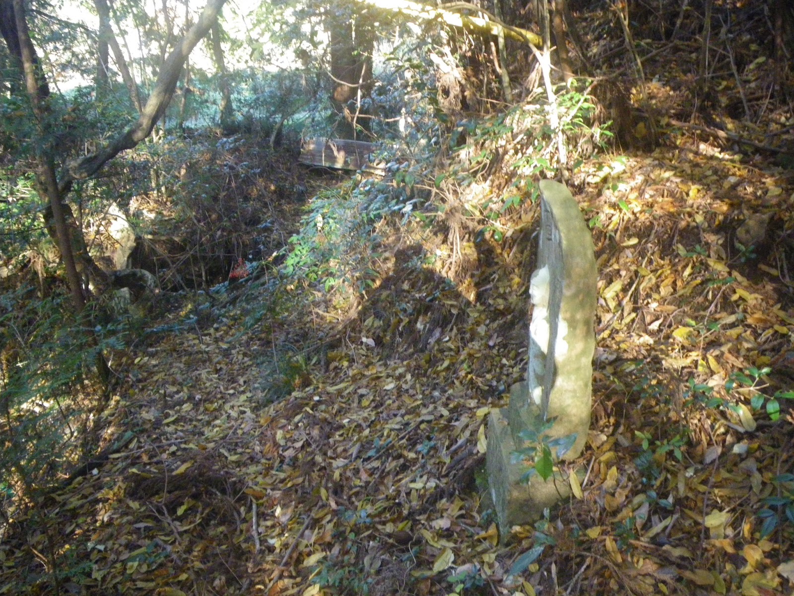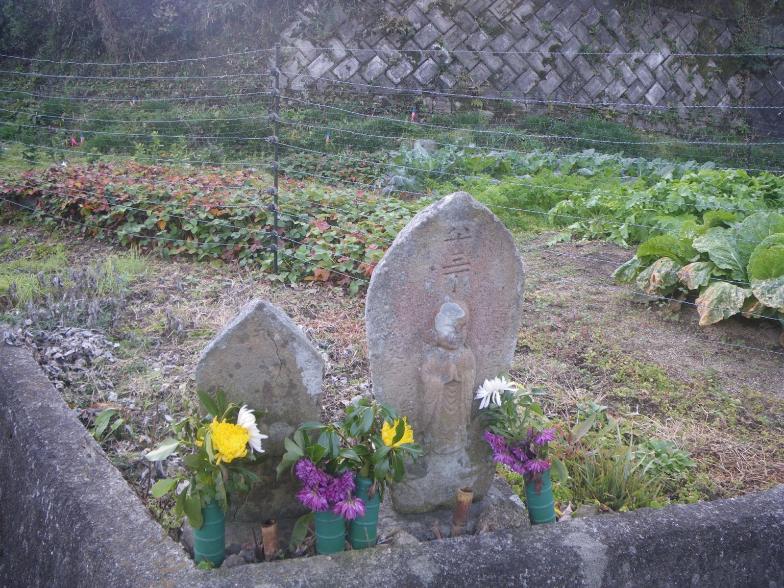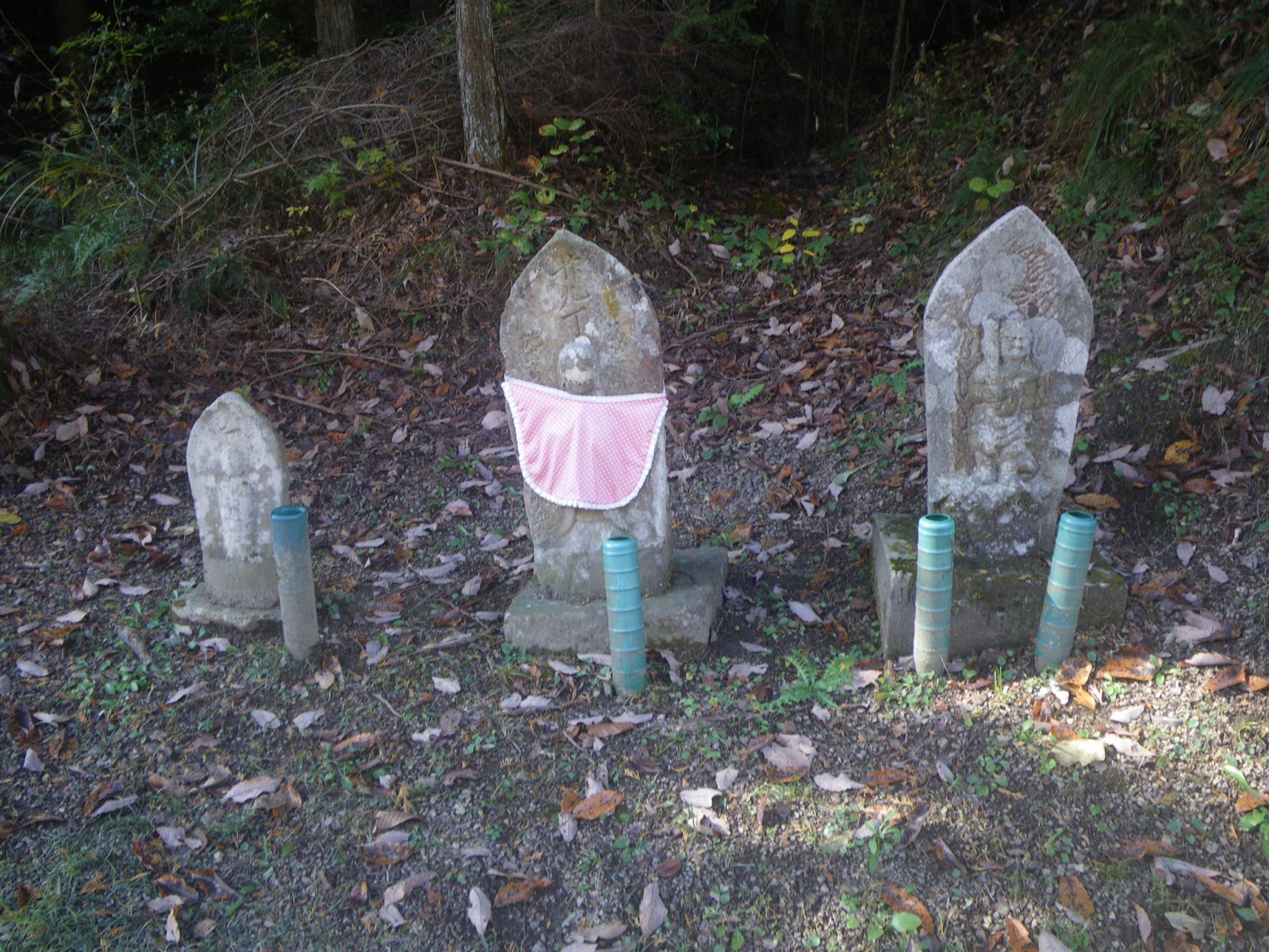 今まで花折峠と書いてきたが、「東花折峠」が正確な呼称のようだ。その峠の左手、ブロックの中に地蔵座像。台座に「七十丁」と刻まれる。またその右側には遍路墓。「寛政七年 大阪」「寛政六年」といった文字が刻まれる。
