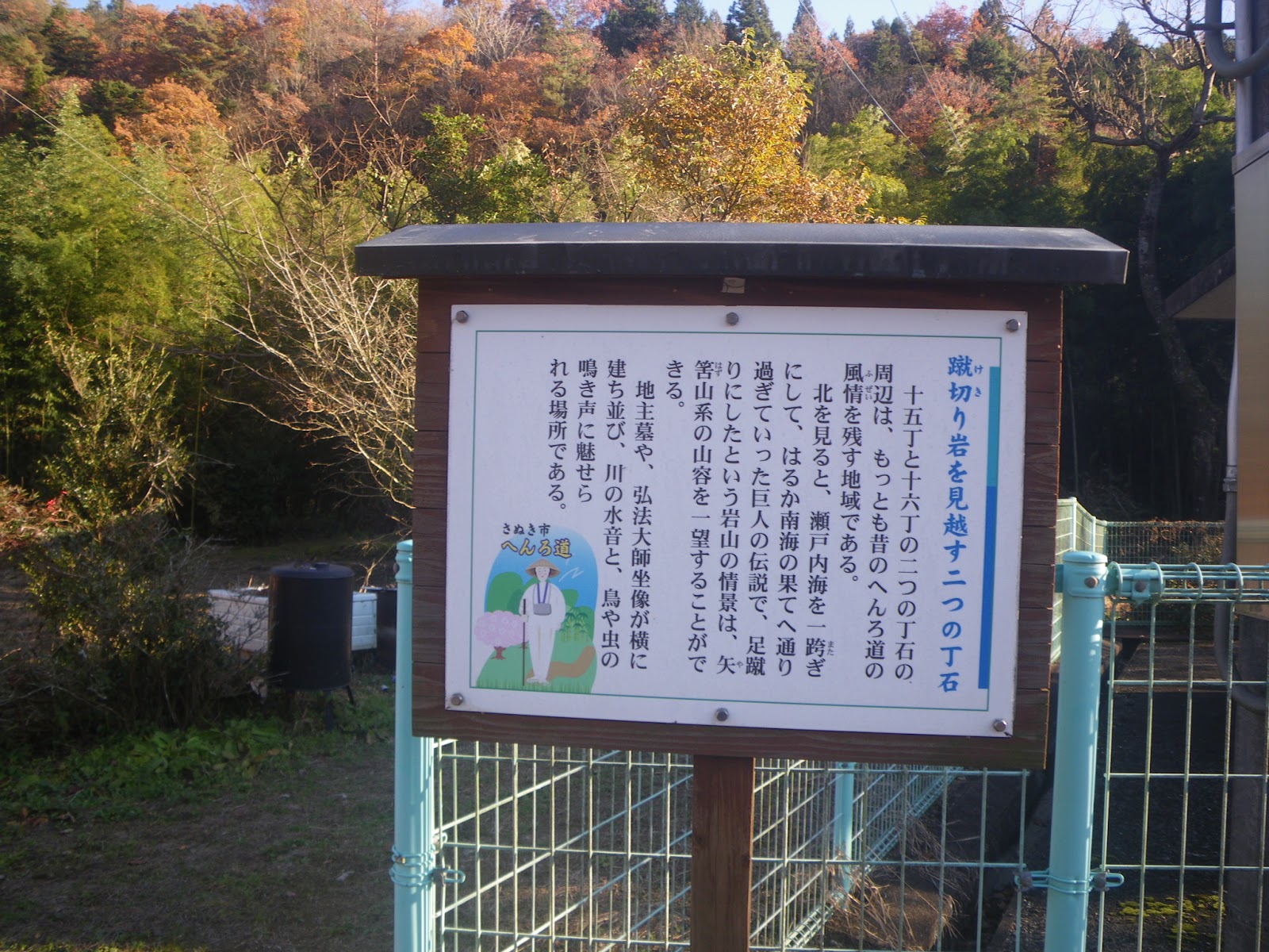 北を見ると、瀬戸内海を一跨ぎにして、はるか南海の果てへ通り過ぎていった巨人の伝説で、足蹴りにしたという岩山の情景は、矢筈山の山容を一望できる。 地主墓や弘法大師座像が横に建ち並び、川の水音と、鳥や虫の鳴き声に見せられる場所である」とあった。