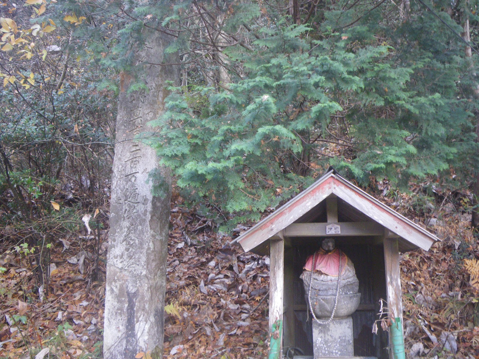 竹林を抜け、細くなった槙川に架かる橋を渡り左の藪へと入る。道は少々荒れ、大丈夫かな、などと不安になる頃に、「十四丁石」、「十三丁石」の案内。十三丁石は先を指すが、十四丁石は谷側を指すように見える。目をこらすと、道の下、槙川傍に舟形地蔵が見える。