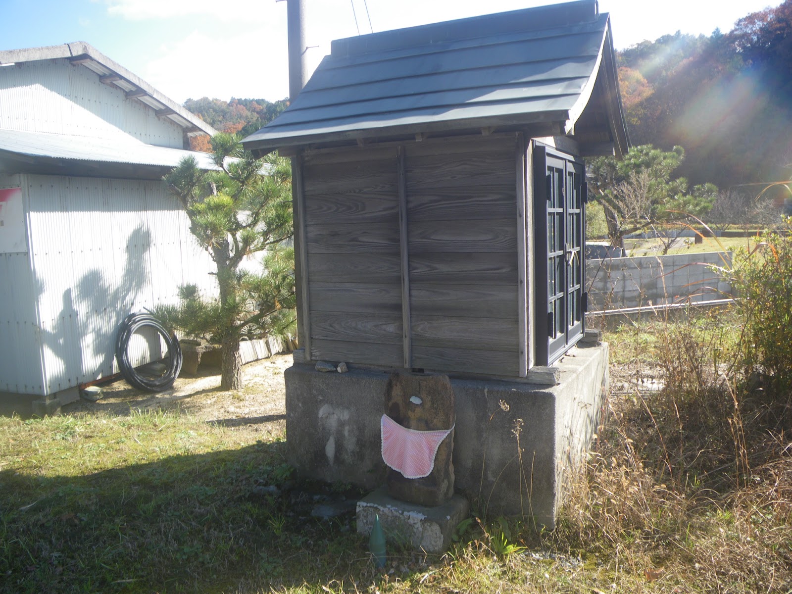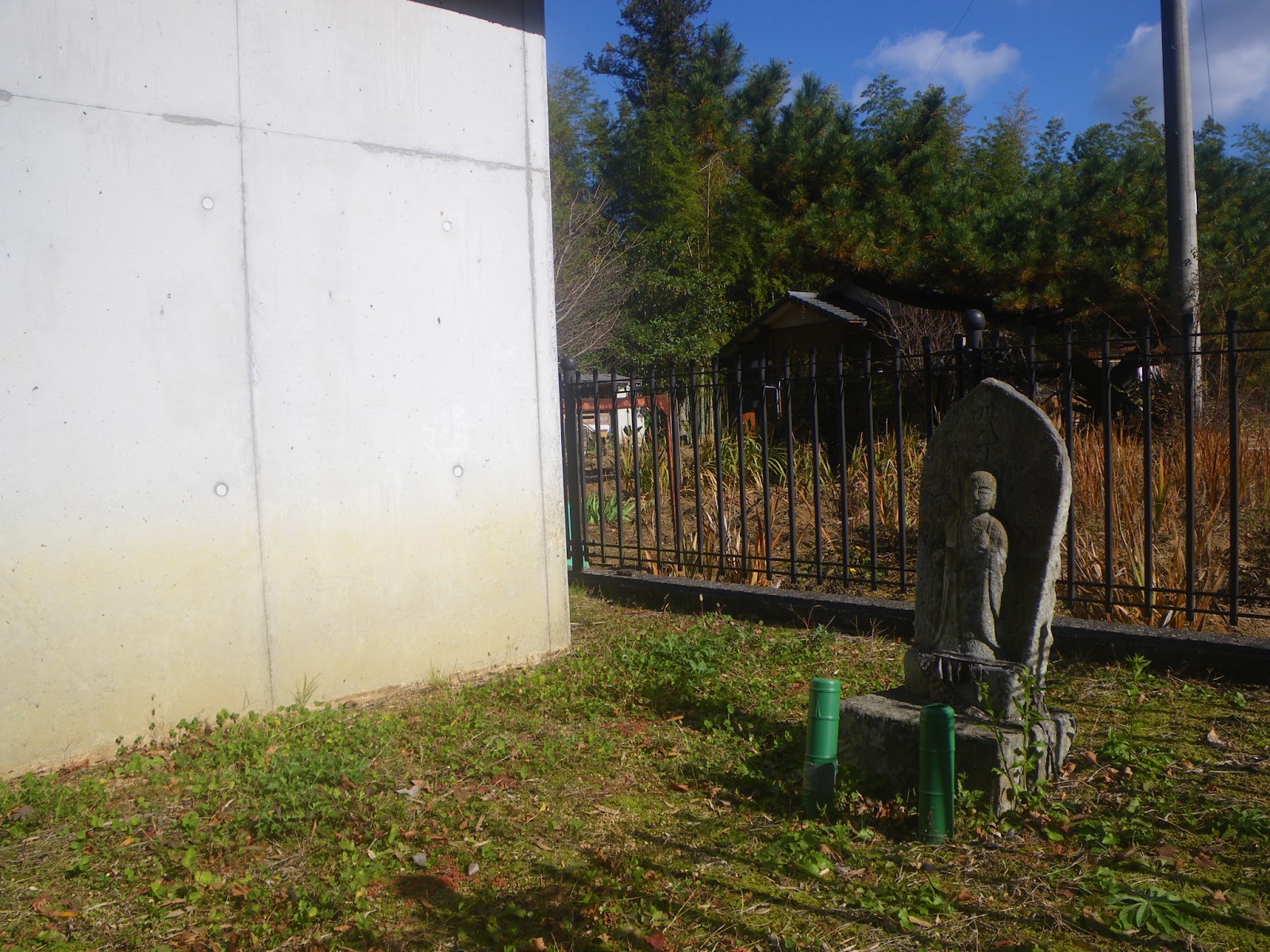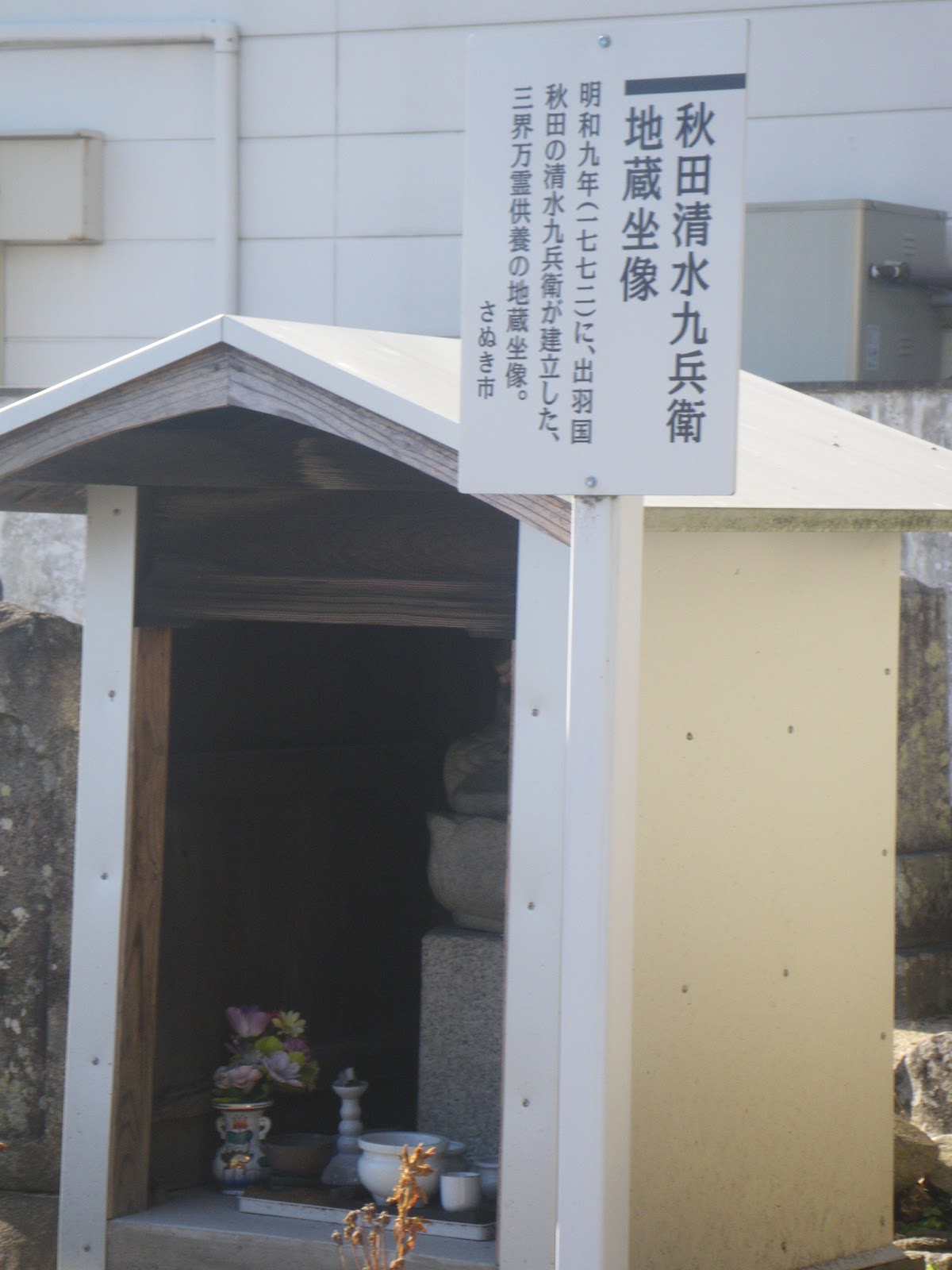 長尾寺の仁王門を左に折れ、直ぐ先の四つ辻を右に折れて道を南に向かう。県道10号と交差する手前、道の右手に墓石が並ぶが、その一角にコンクリート造りの小祠があり、その脇に「秋田清水久兵衛地蔵座像 明和九年(1772)に出羽国秋田の清水久兵衛が建立した三界萬霊供養の地蔵座像」とある。