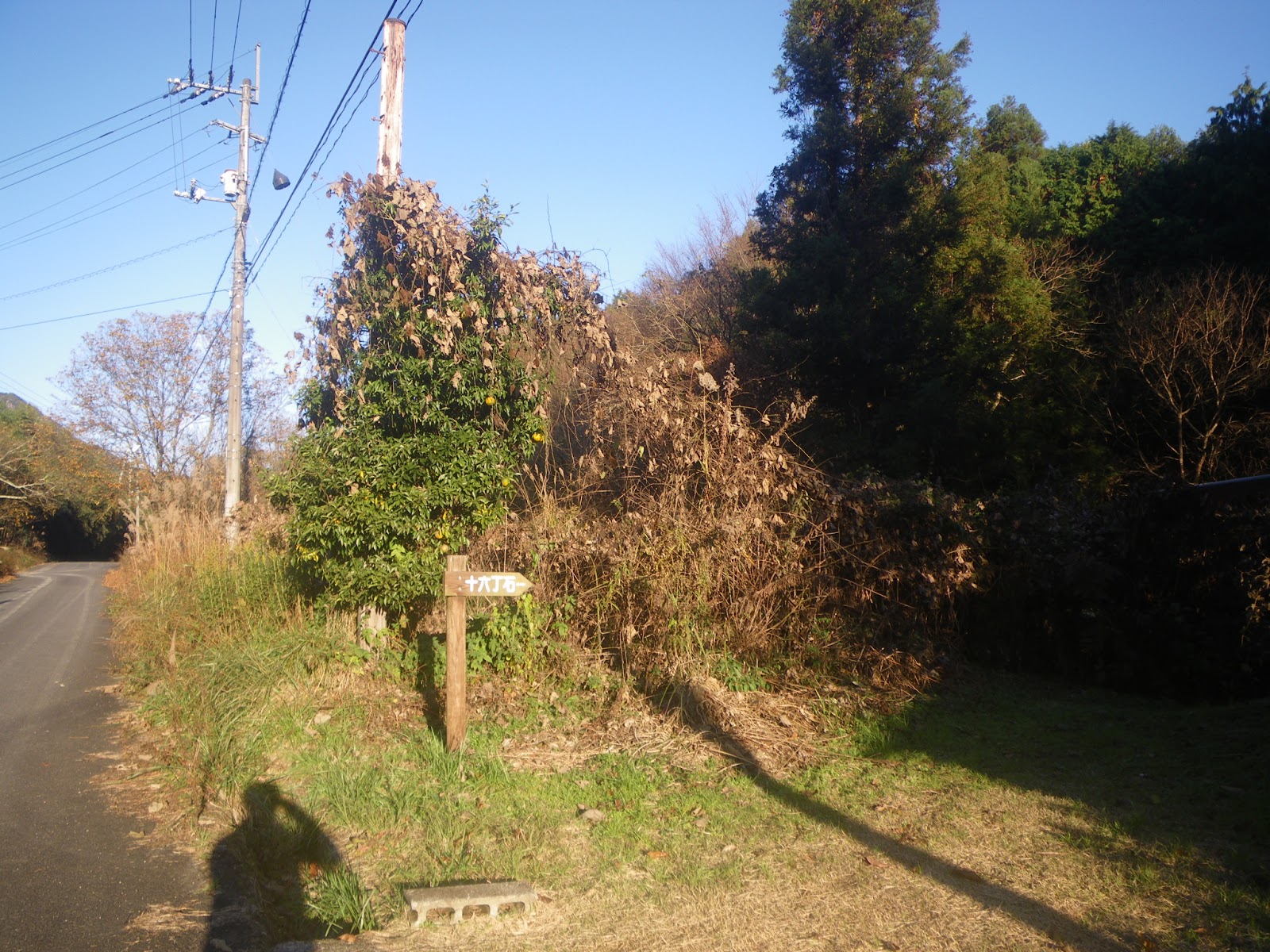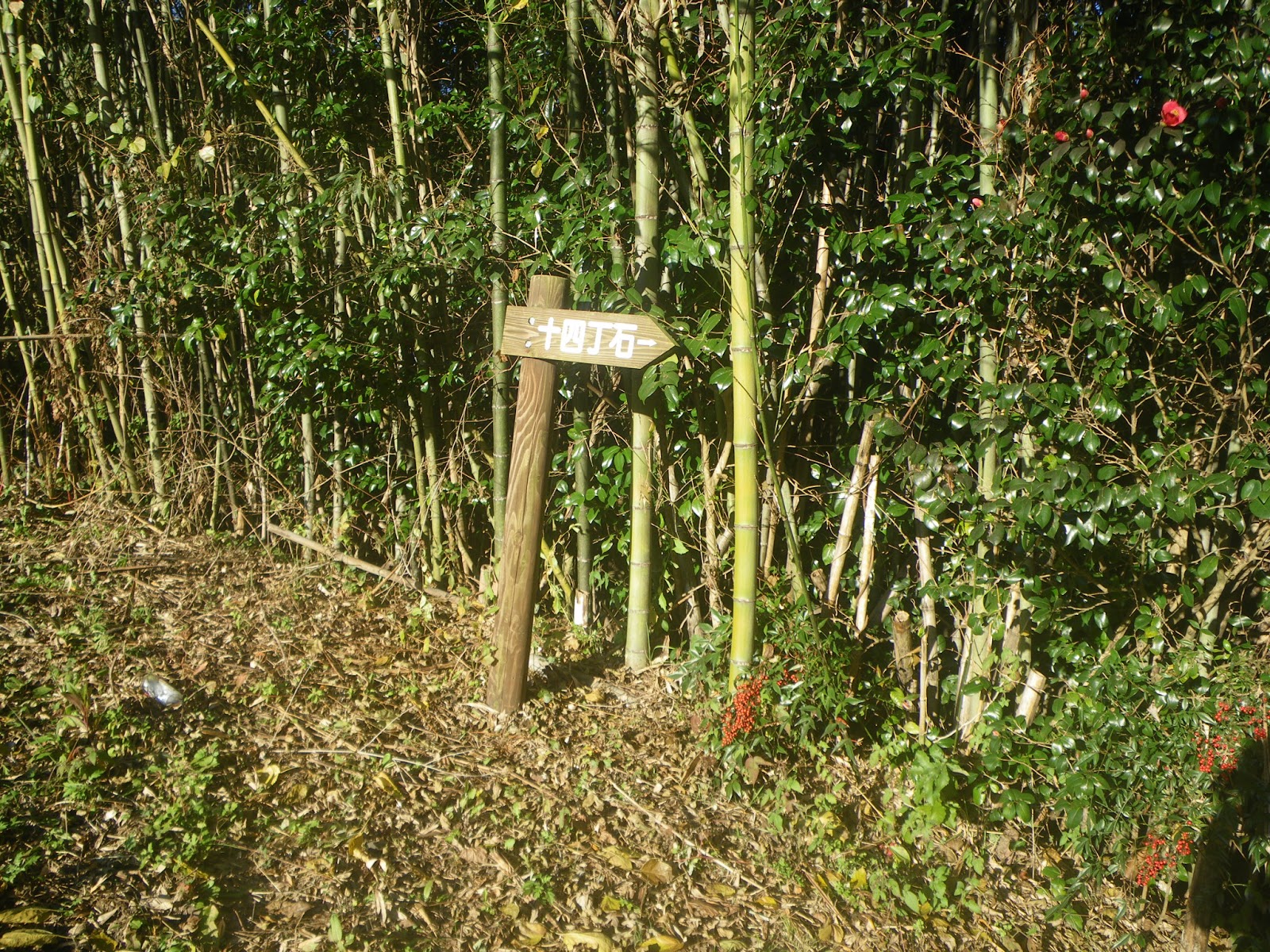 道を進むと、道の右手、畑の向こうの竹林の前に木標が見える。木標までは道らしきものはないのだが、畑の端の畔道を進み木標に。木標には「十四丁」とあり、右を指す。