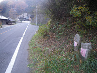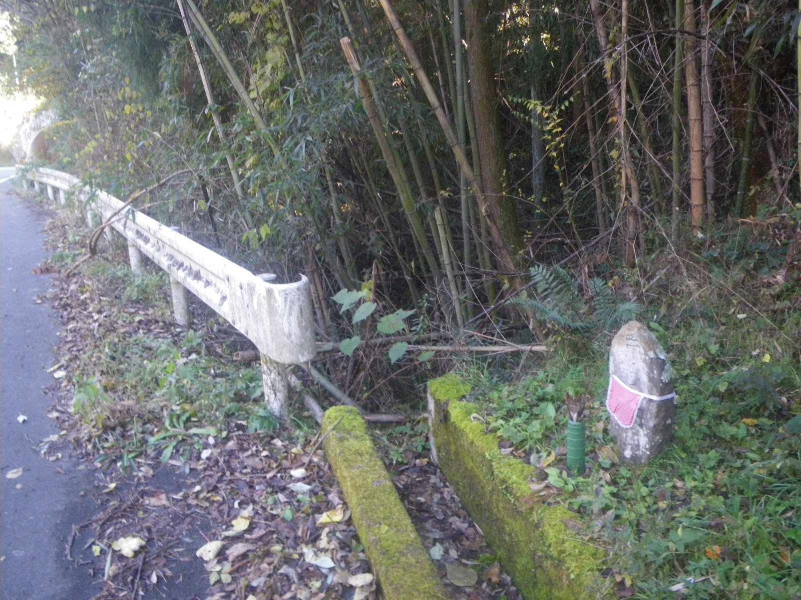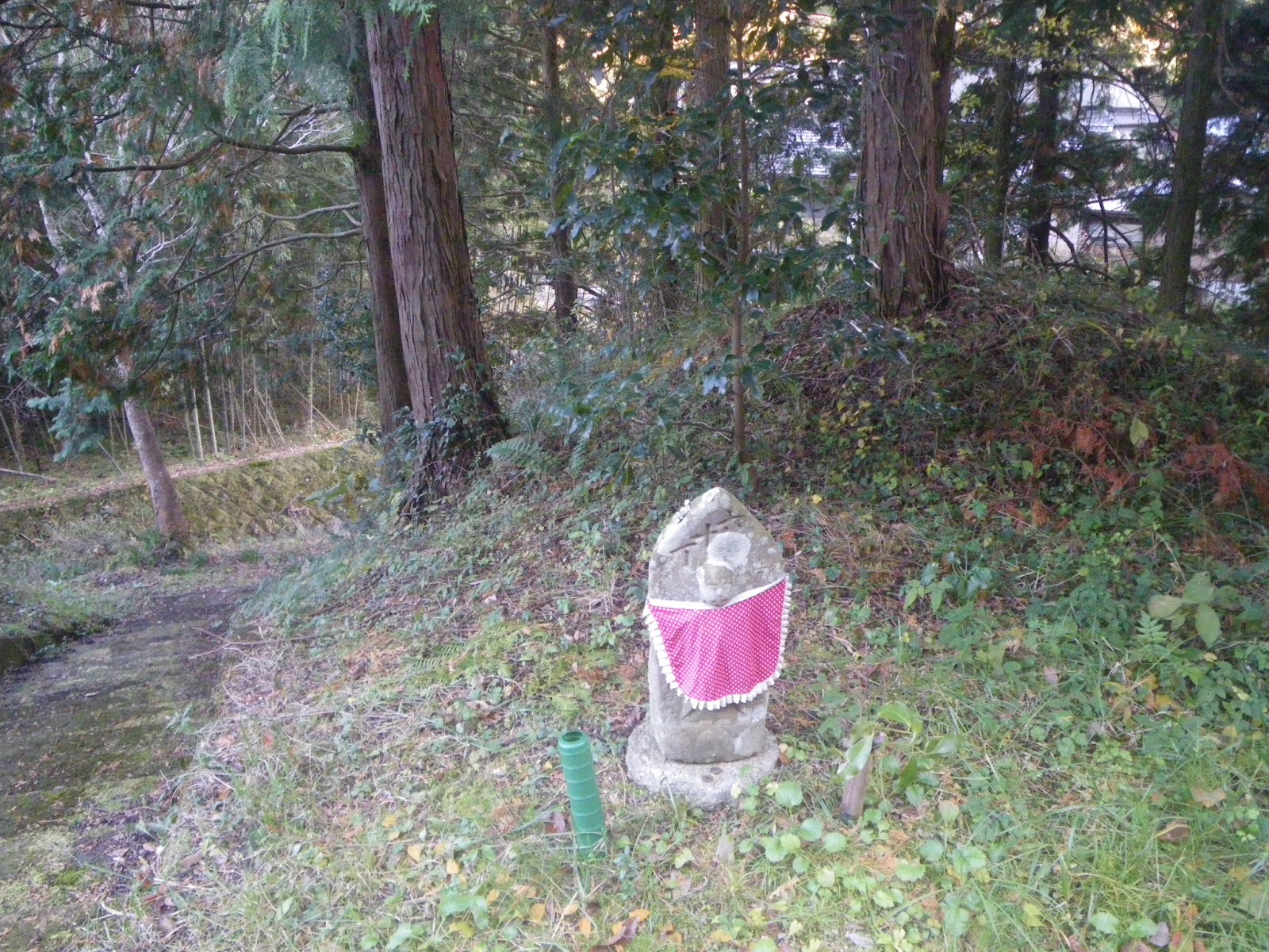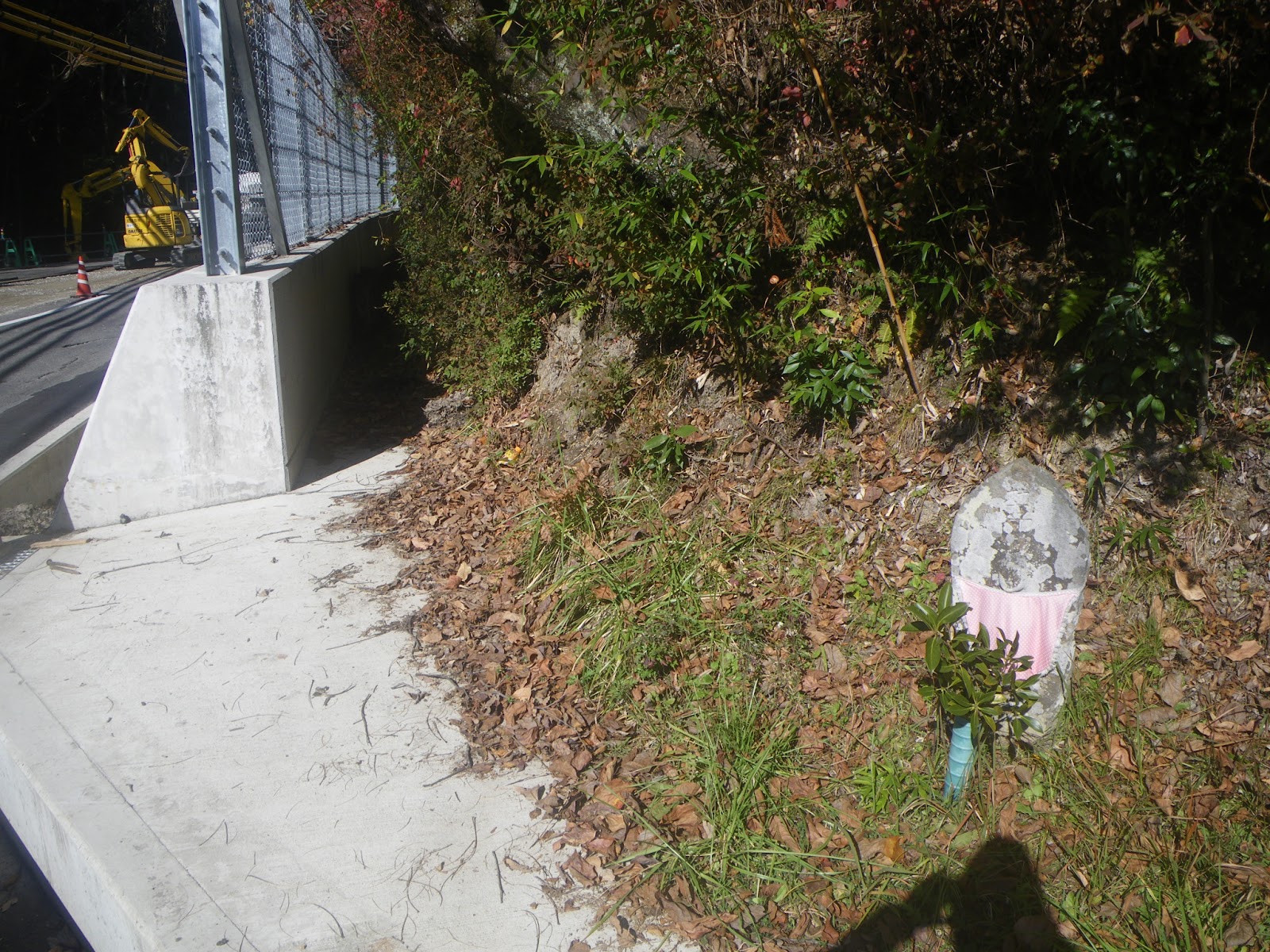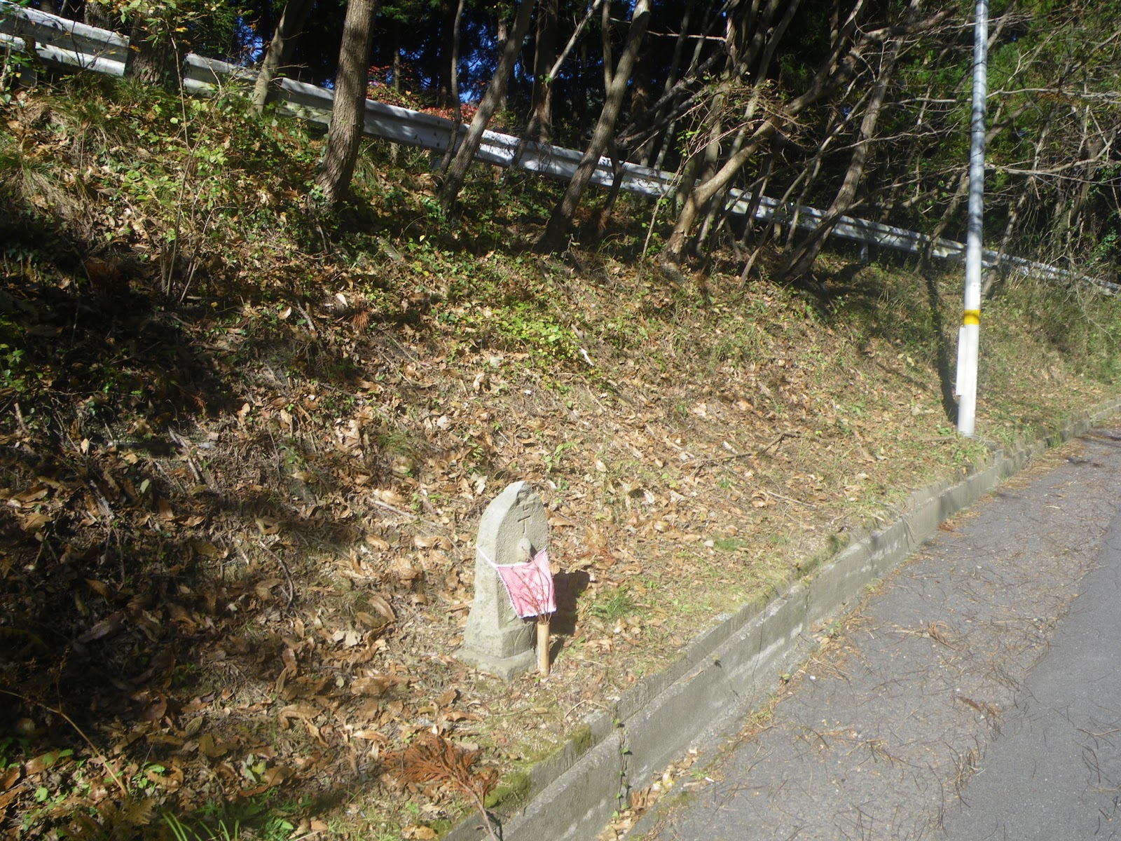 十四丁石から元の土径に戻り、国道377号下のコンクリート水路溝を進み、民家庭先を抜けて国道377号へのアプローチとなる坂道を上る。国道と対面には先ほど見た13丁の舟形地蔵丁石が立っていた。これで丁石はなんとかつながった。また往昔の遍路道らしき道筋も少しばかりトレースできた。