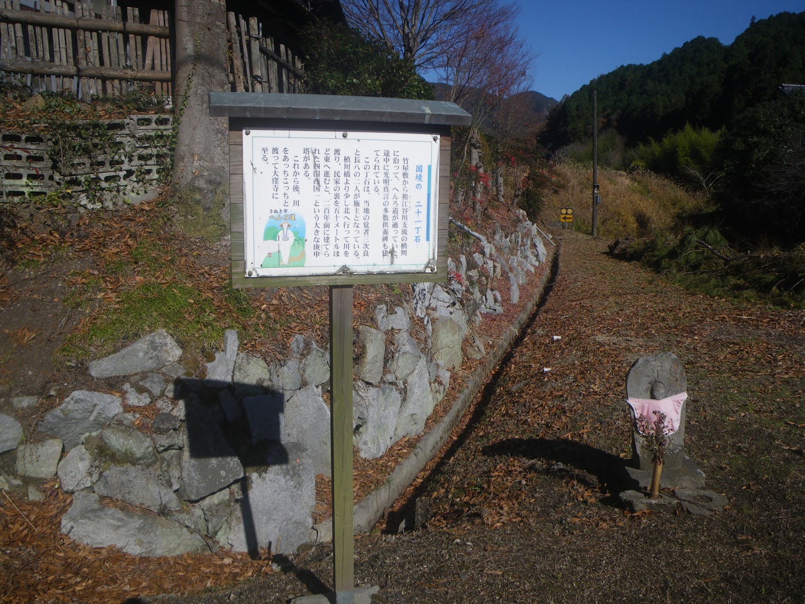 と、国道の左手に舟形地蔵があり、21丁石の案内。「国境の二十一丁石 竹屋敷から祖江谷川の支流槇川に沿って、へんろ道が通っていた。途中、光明真言の多数供養塔も建てられている。