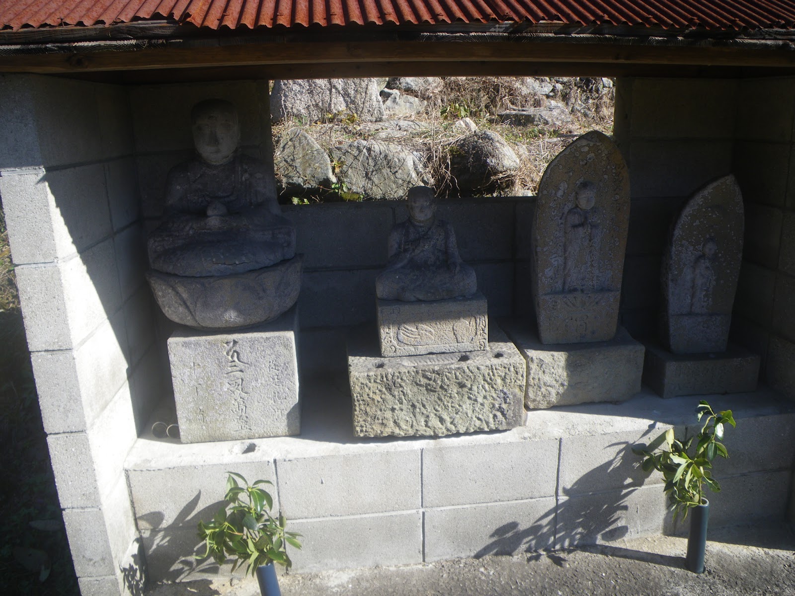 高地蔵にお参り。大師堂は道端の小屋とは思えず、眼前の巨岩に彫られた石仏が大師像であろうか(不動明王のようであり、大師像?とは思いながらも)、であれば大師堂のお堂は壊れたのだろうか、などと思い込み、小屋(大師堂)に入ることなく石仏群の辺りを彷徨った。