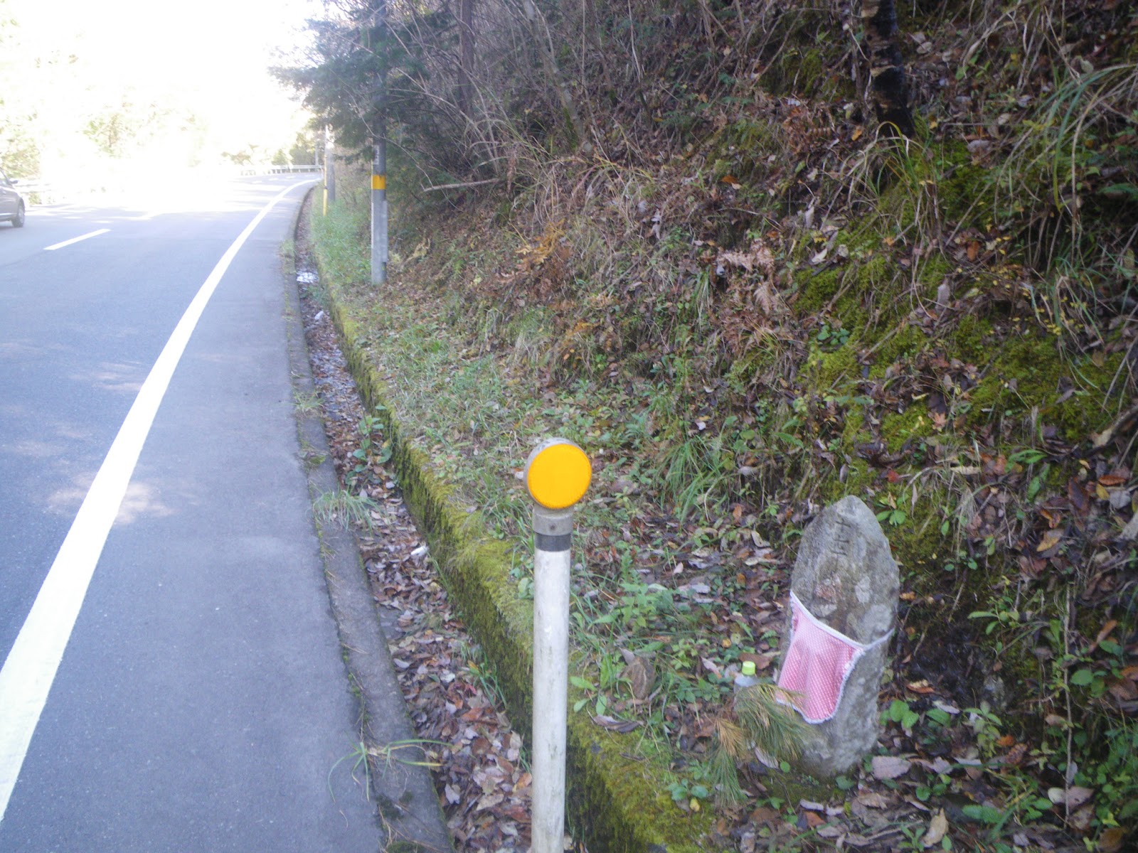 13丁石まで戻り、先に向かうと、国道左手、ガードレールの外に「十二丁」と刻まれた舟形地蔵丁石。その先、国道右手に「十一丁 宝暦十三年」と刻まれた舟形地蔵丁石が立つ。