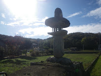 先回の散歩で、長尾寺手前で同じく清水久兵衛の標石があったが、その説明に「六年後の明和九年に、南の県道高松・長尾・大内線と市道筒井・北原線の交差点北詰の、木戸家の墓地に清水九兵衛は立派な三界万霊供養の地蔵坐像を建立している」とあった地蔵座像がこれである。