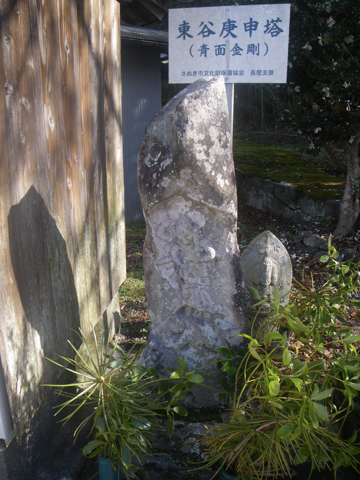 この丁石は当地の覚者 三次良と長八の二人が施主となっている。槇川橋より少し北へ行って川を渡り、民家の裏を50メートルほど東へ進むと、二百年前に建てられた四国西国一という大きな庚申塔がある。これから後、川をあっちこっちと渡って大窪寺に至る」とあった。