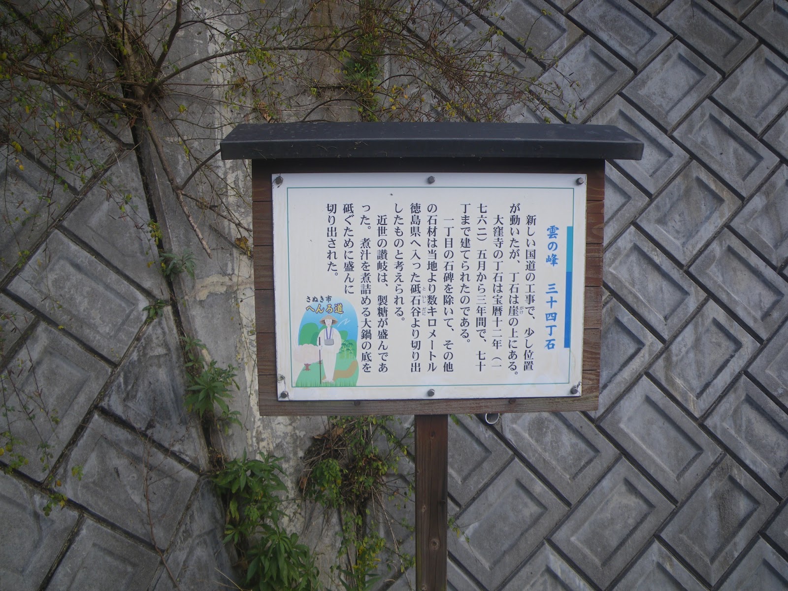 15丁を越え、成り行きで進み左に曲がり道に出る。そのT字路に案内があり、「蹴切り石を見越すふたつの丁石 十五丁と十六丁のふたつの丁石の周辺は、もっとも昔のへんろ道の風情を残す地域である。