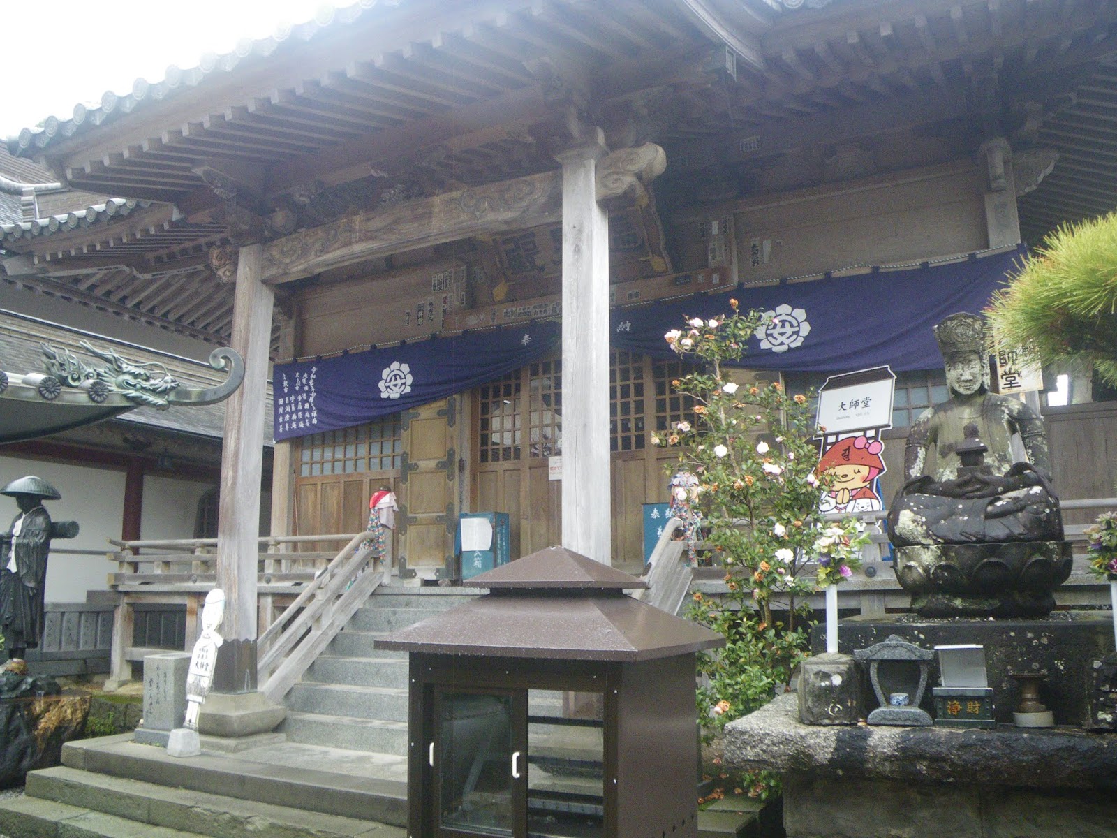 正面に本堂。コンクリート造りのお堂に木に銅葺きの屋根。結構落ち着いた造り。Wikipediaには「徳島県板野郡上板町にある高野山真言宗の寺院。温泉山(おんせんざん)瑠璃光院(るりこういん)と号する。本尊は薬師如来。大師堂前から湧き出る宿坊の温泉とラジウム鉱泉入りの薬湯も有名である。