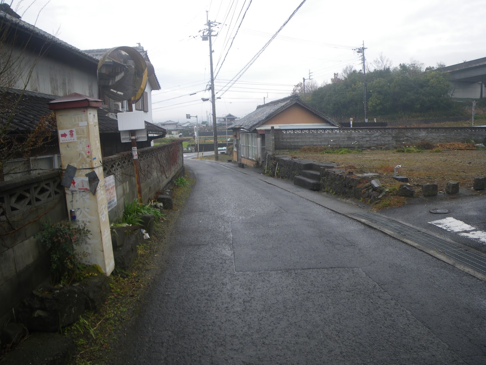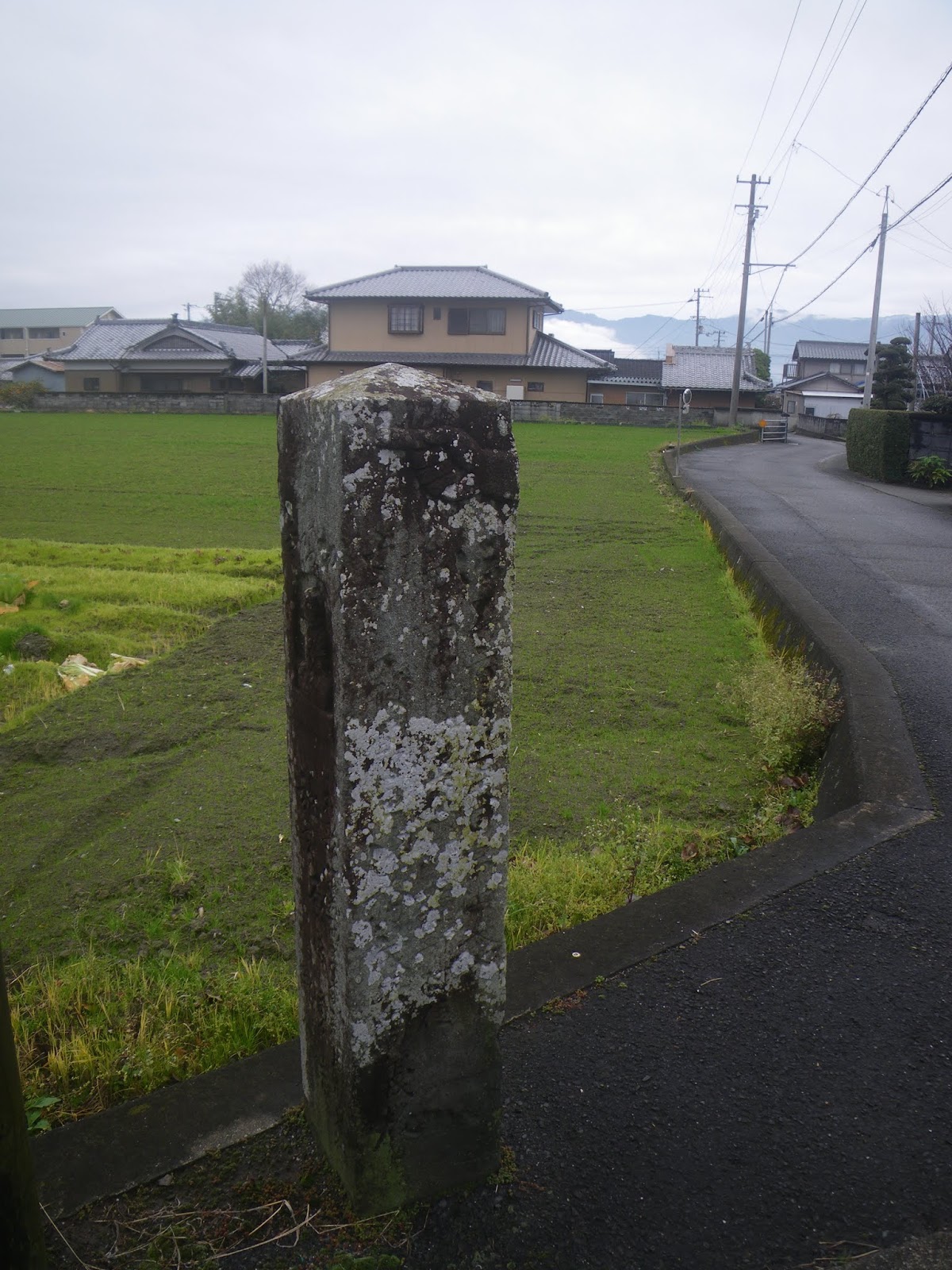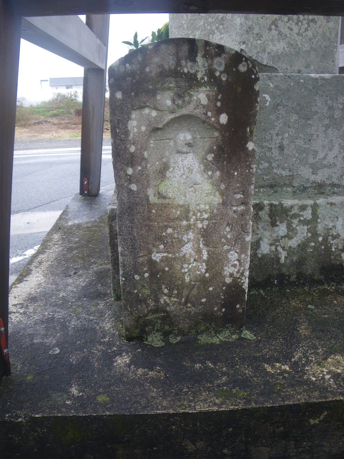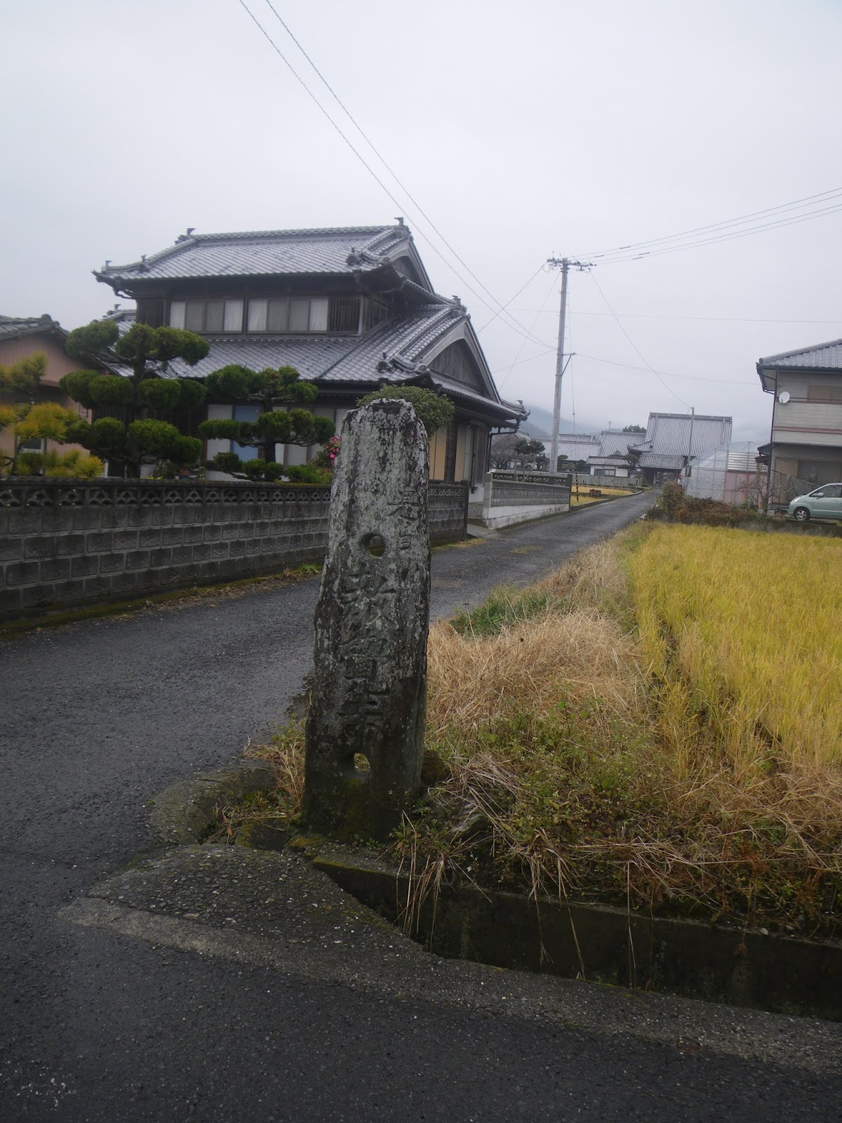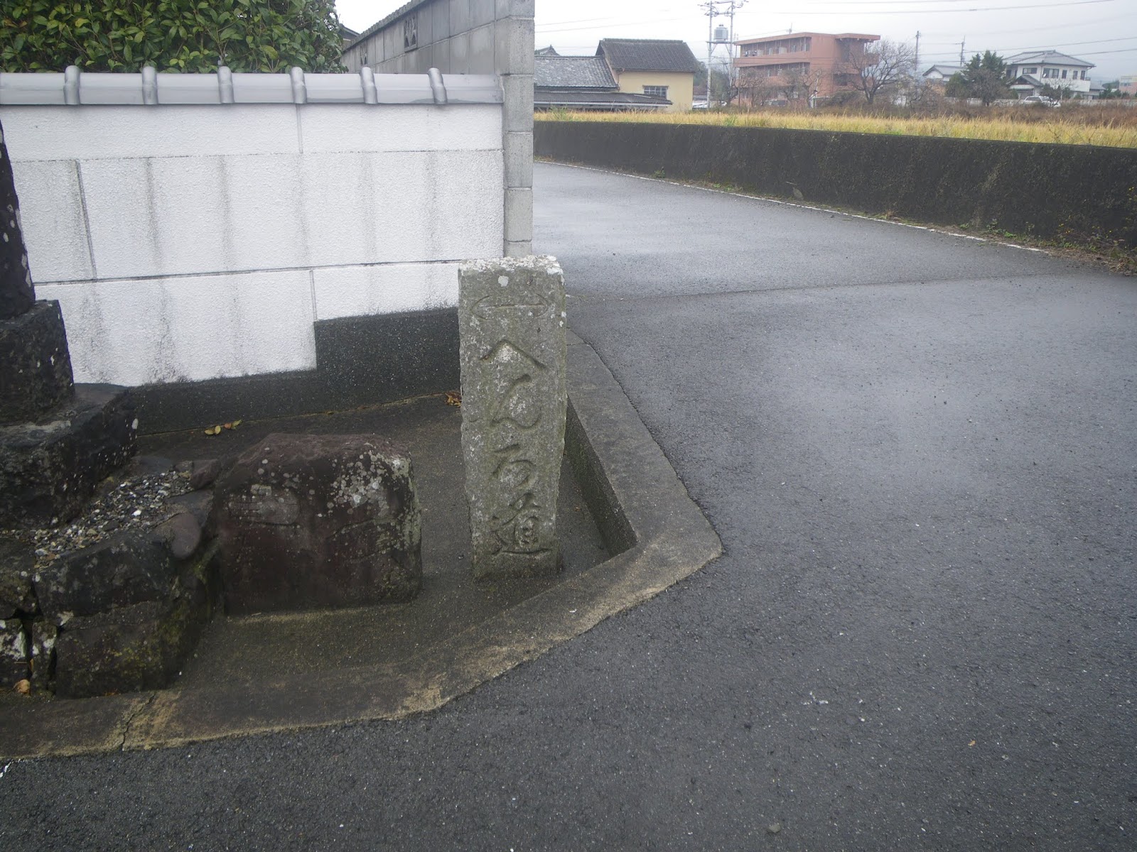 標石のある四つ辻を右に折れ、一旦県道を離れる。道なりに進むと道の右手、民家ブロック塀脇に自然石の標石。「左遍んろ」と青石に刻まれる。その先、天明二年の銘のある地蔵座像を越えると遍路道は再び県道に戻る。
