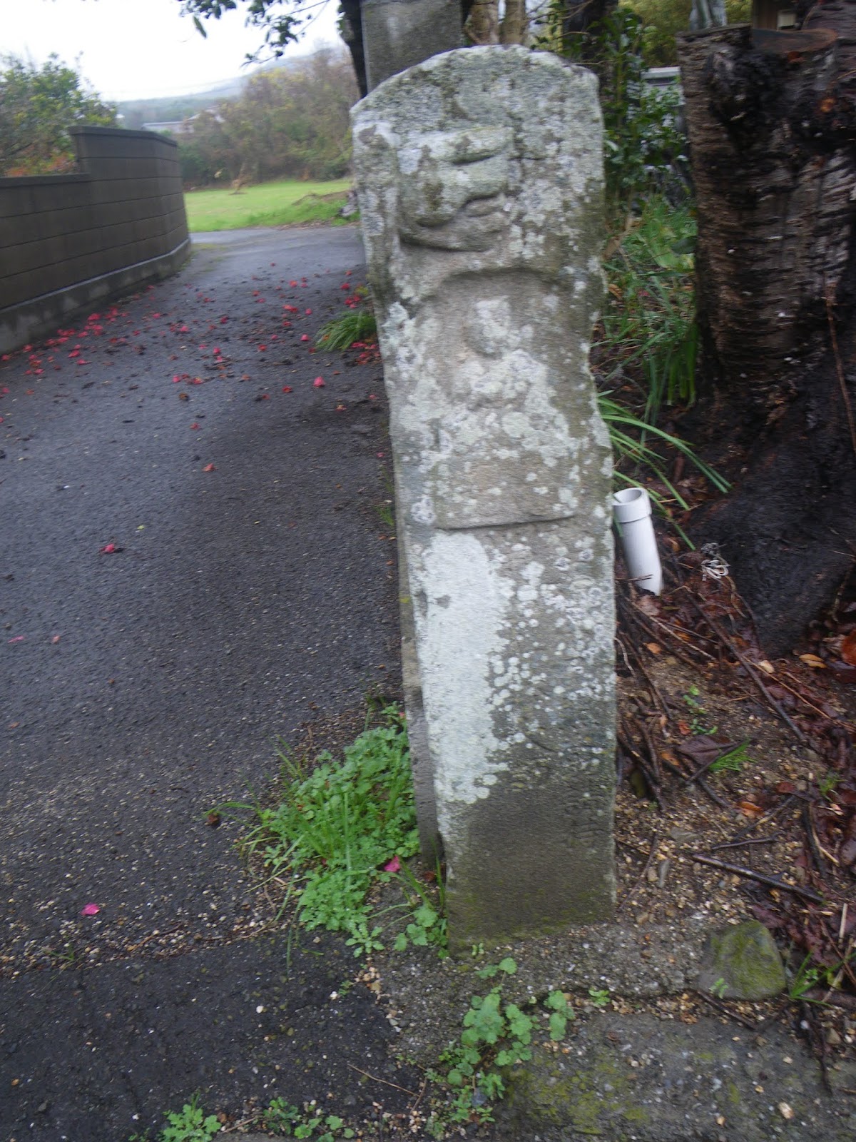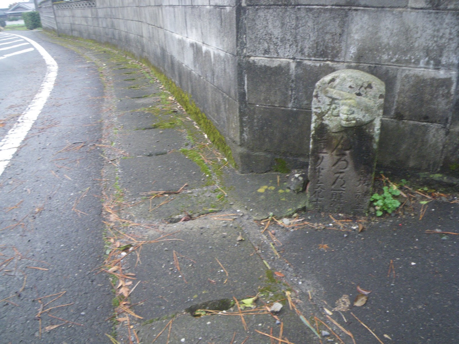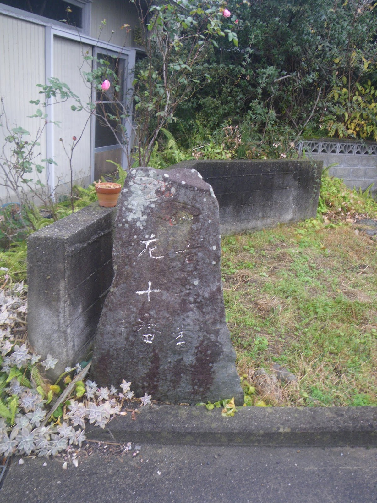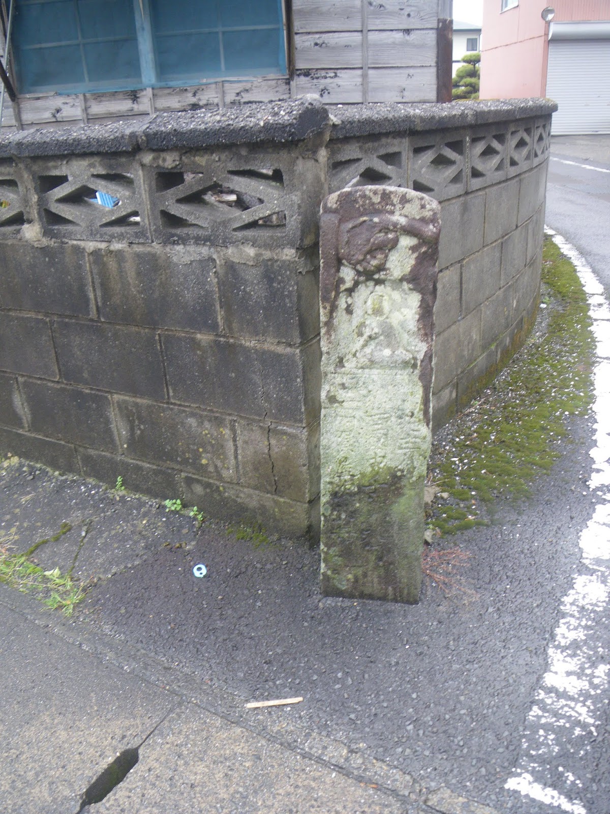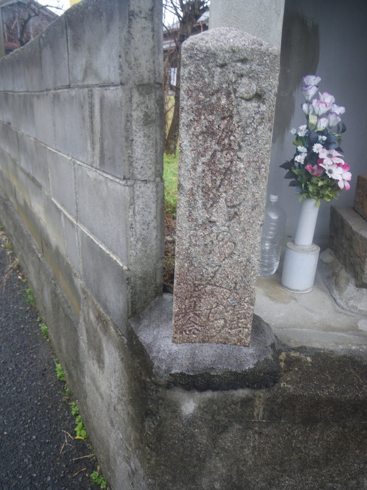 その先、道の右手、民家のブロック塀に組み込まれたような標石。これも四国千躰大師標石。