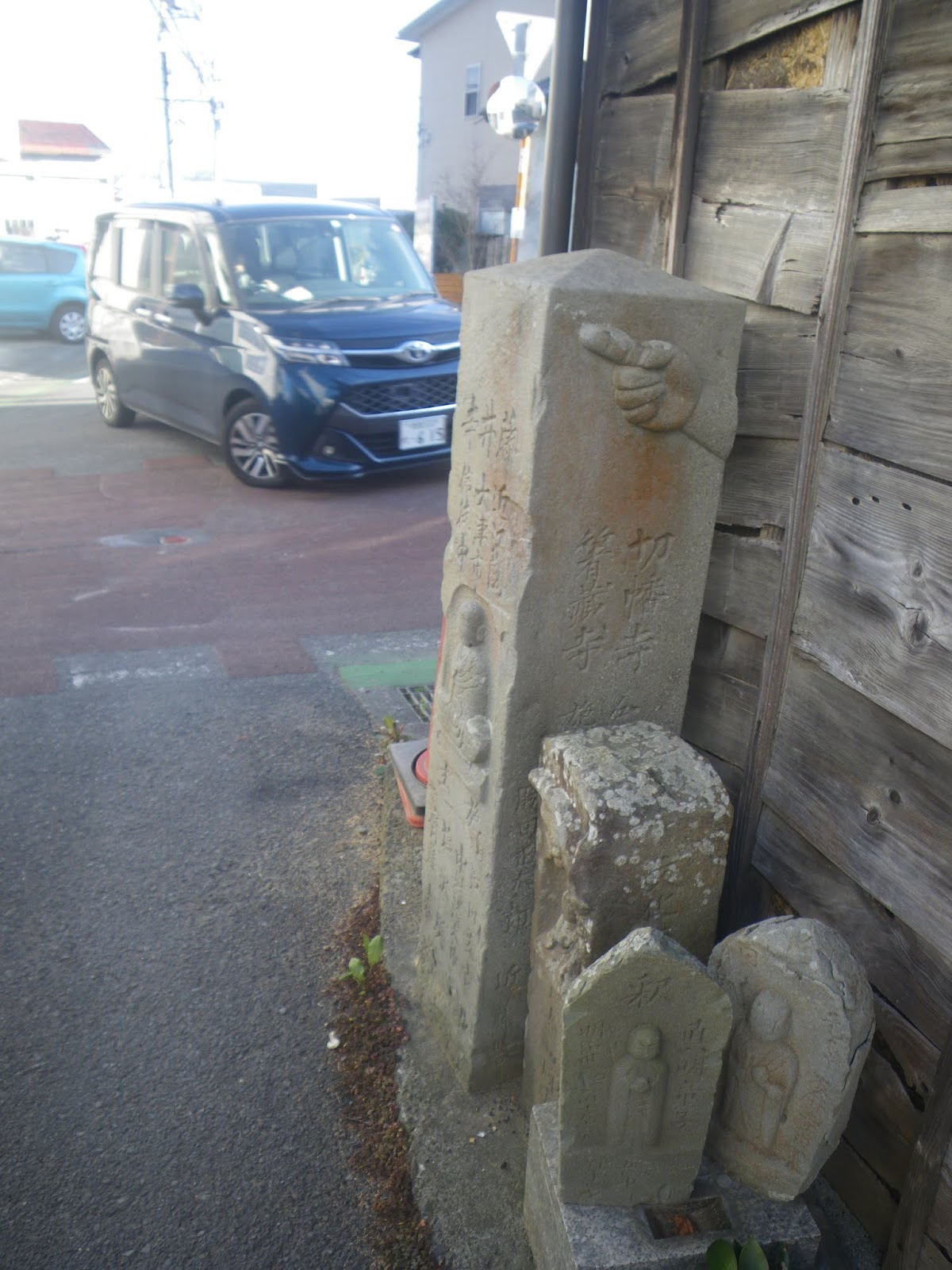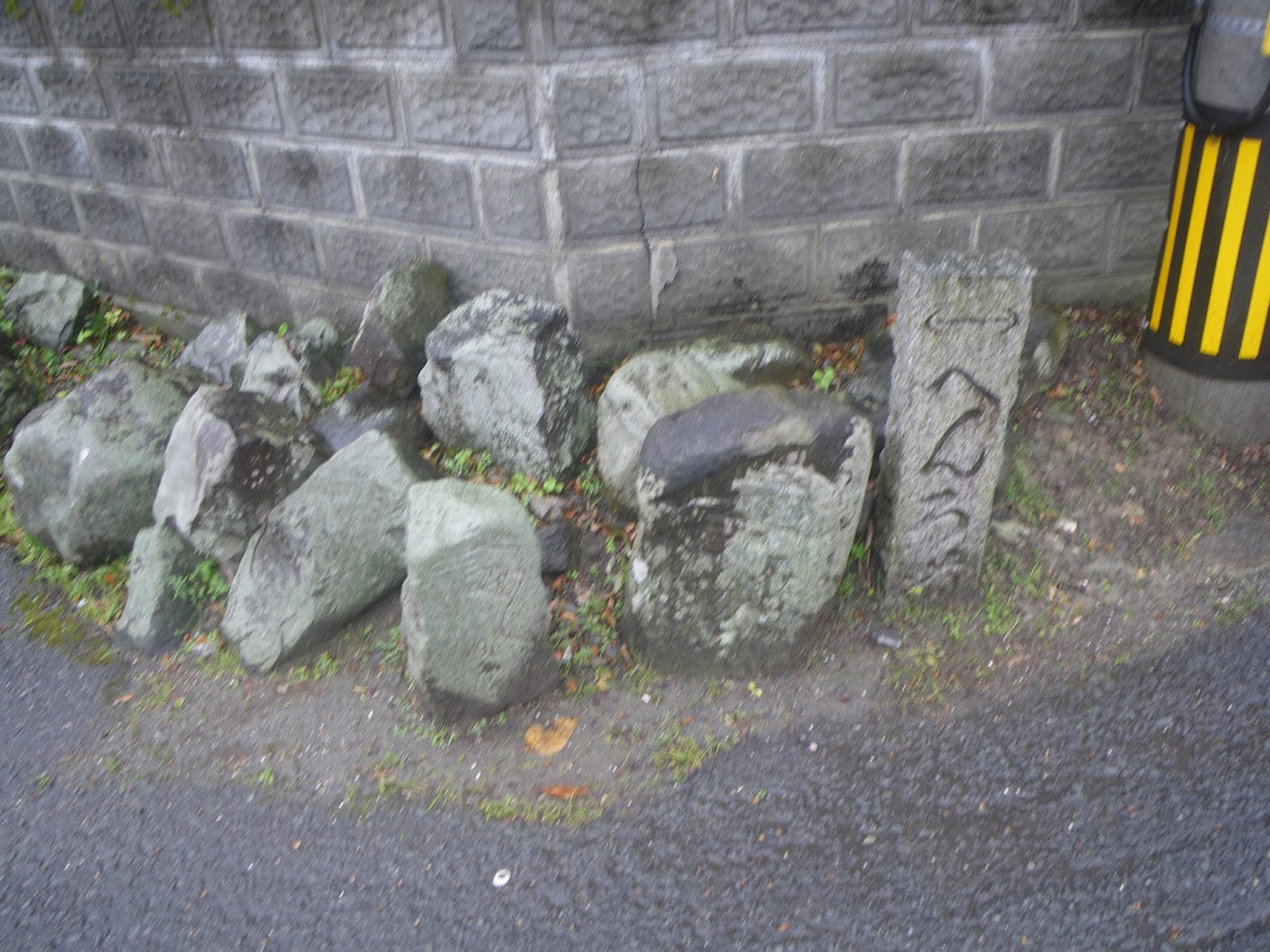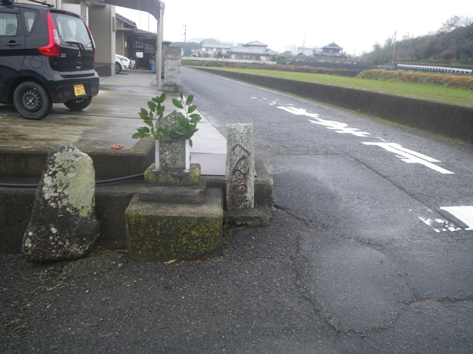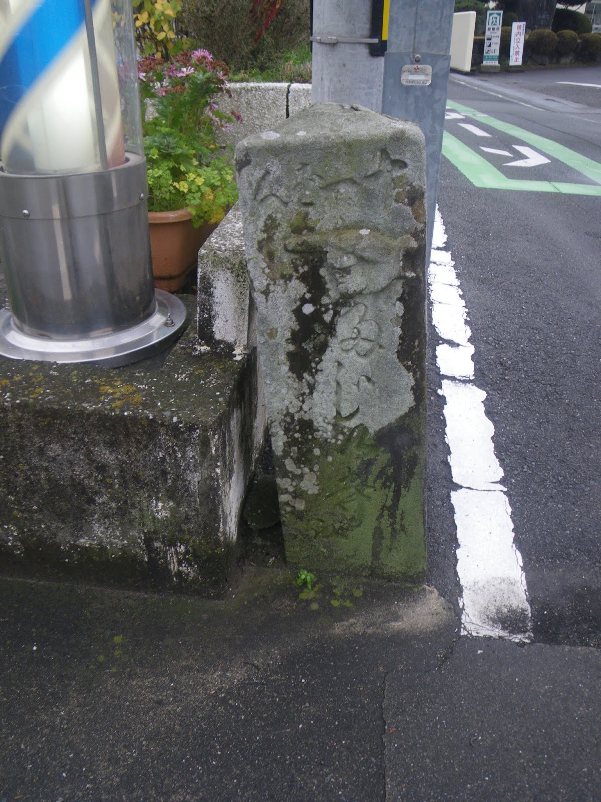 弧を描く道を県道に戻ると合流点に壊れた石造物が集められそこに4基の標石が見える。