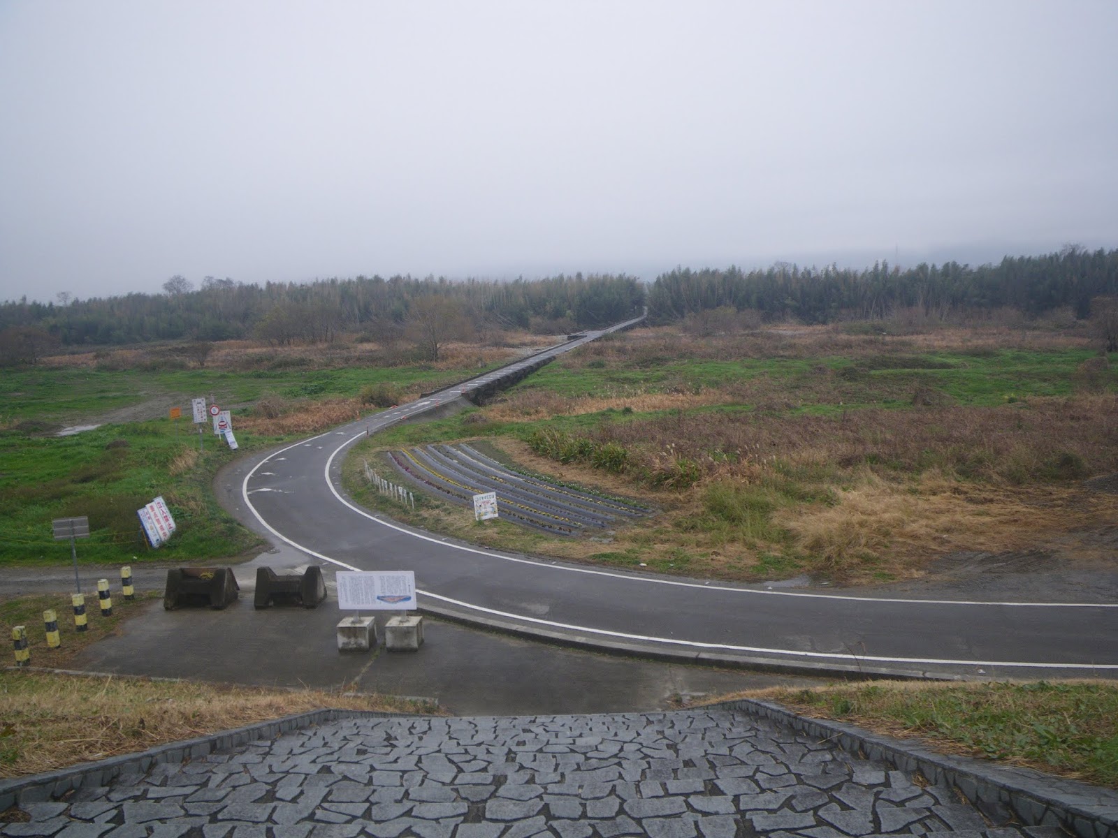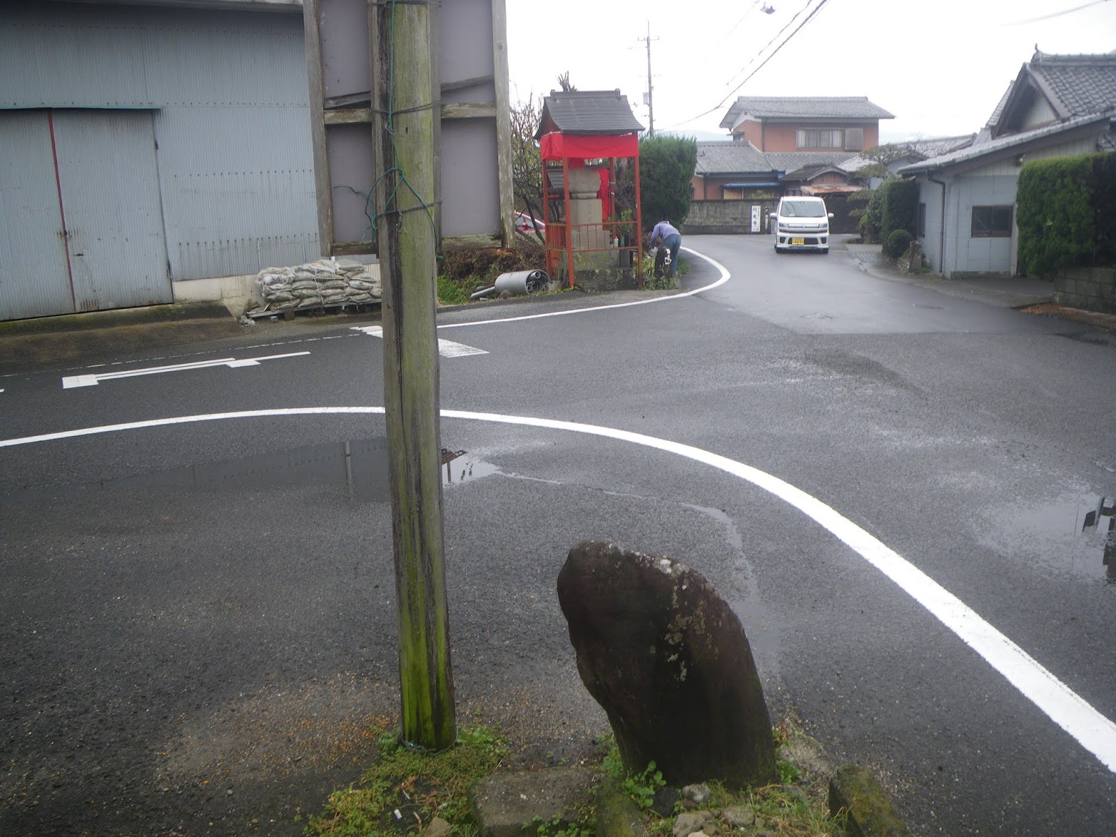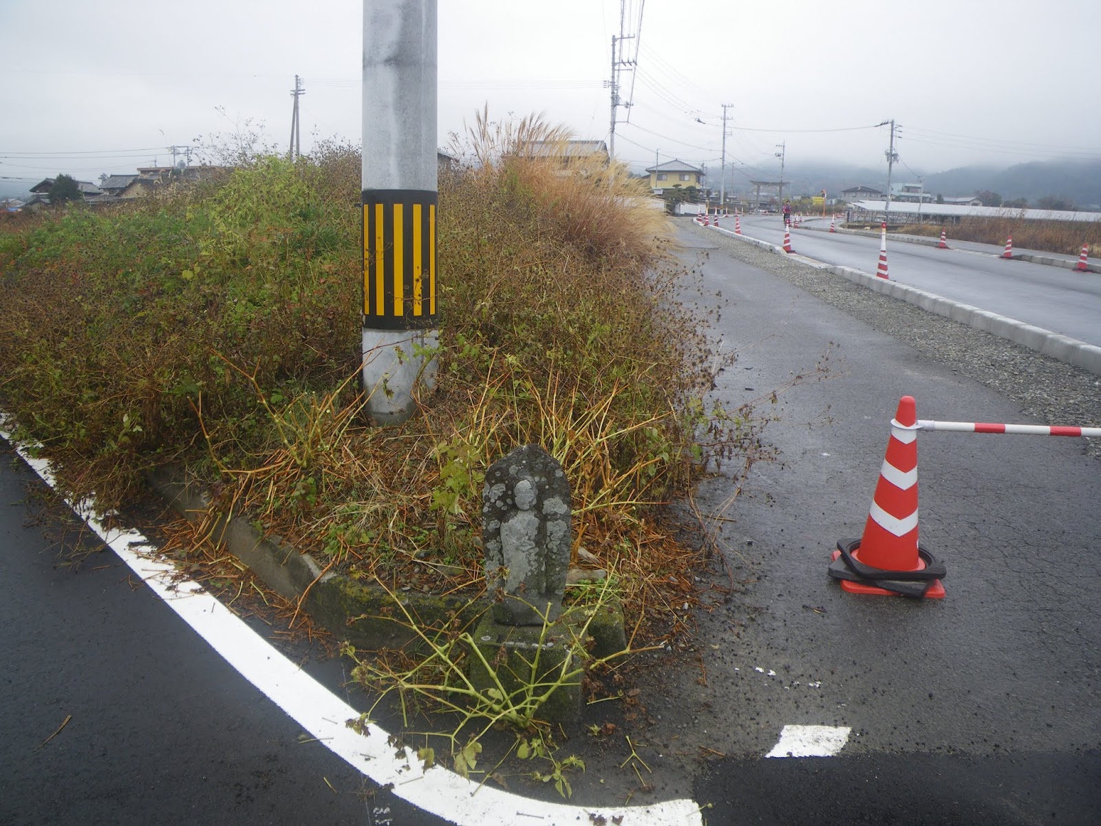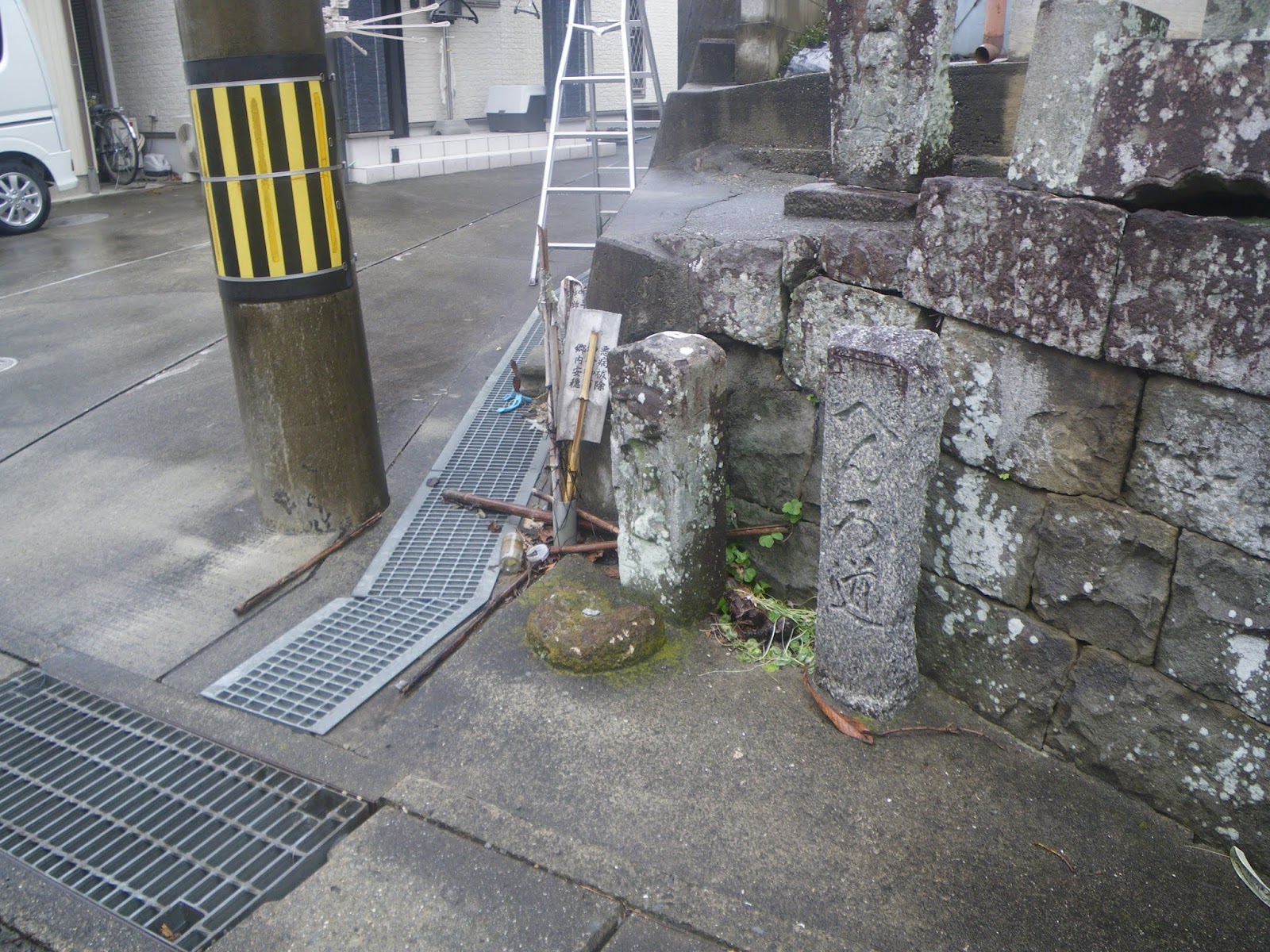 弧を描く道を県道に戻ると合流点に壊れた石造物が集められそこに4基の標石が見える。