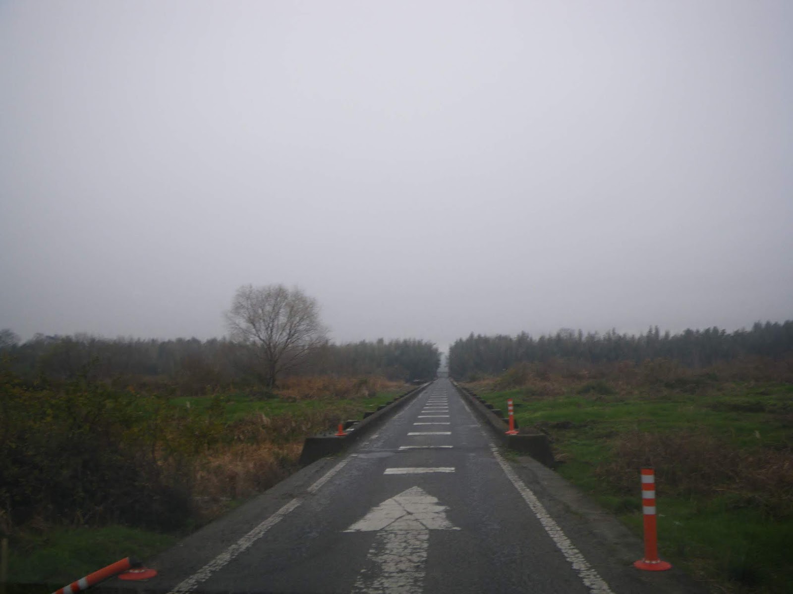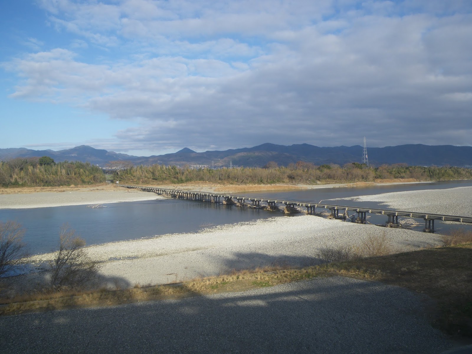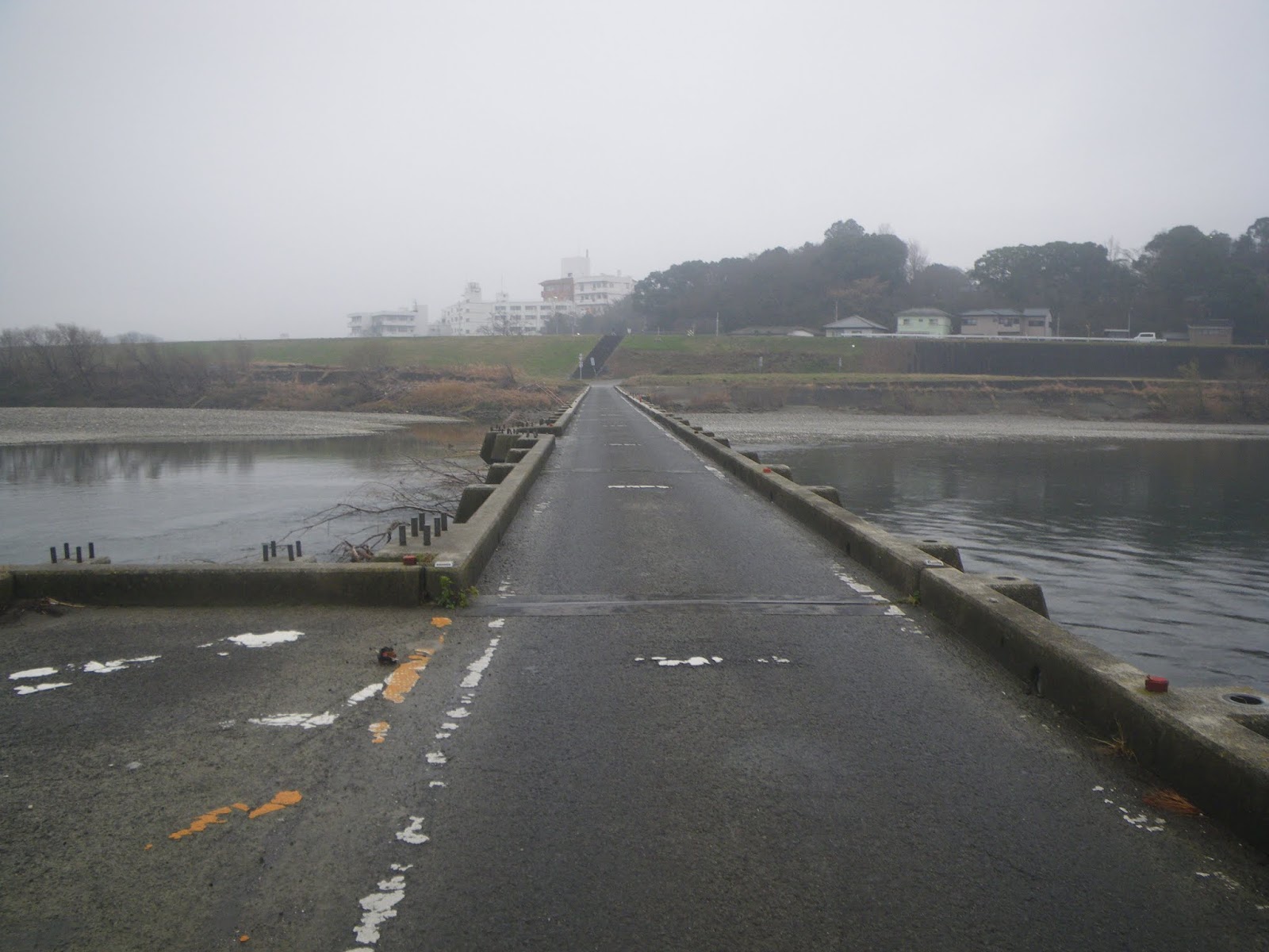 河川敷の車道を少し進むと「大野島橋」。前述、巨大な中州・善入寺島に架かる潜水橋である。橋桁は低い。幅は3メートルほどのコンクリート造り。車はすれ違い不可能で、対向車の有無を確認しながら渡っている。