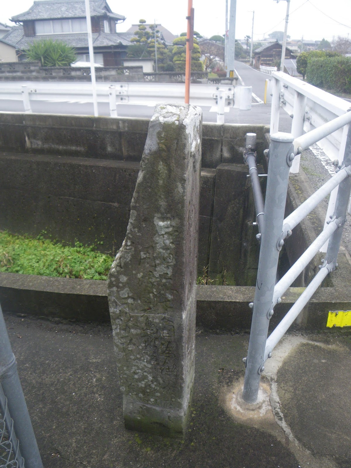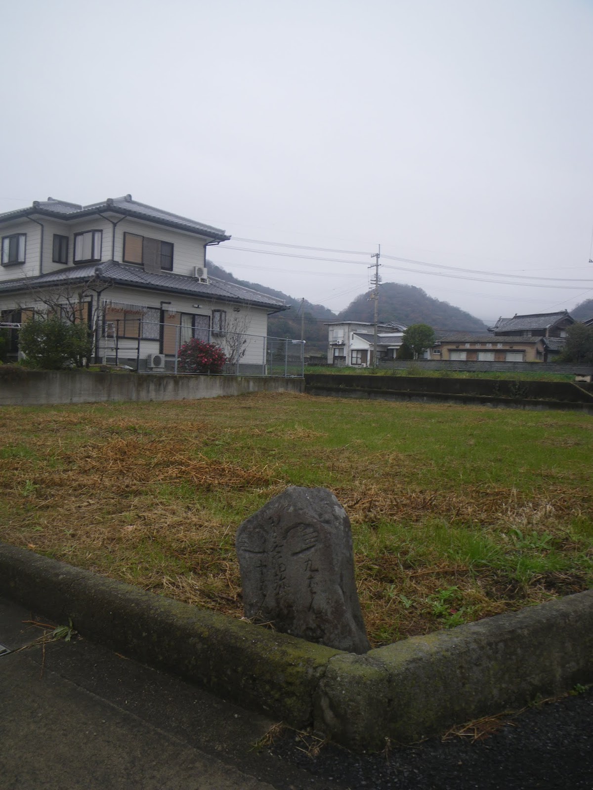 宮内谷川に架かる御所大橋を渡ると遍路道は一旦県道を離れて弧を描く旧道に入る。そこに自然石の標石。「是ヨリ大楽寺 十六丁 是与熊谷寺 *丁」と刻まれる。