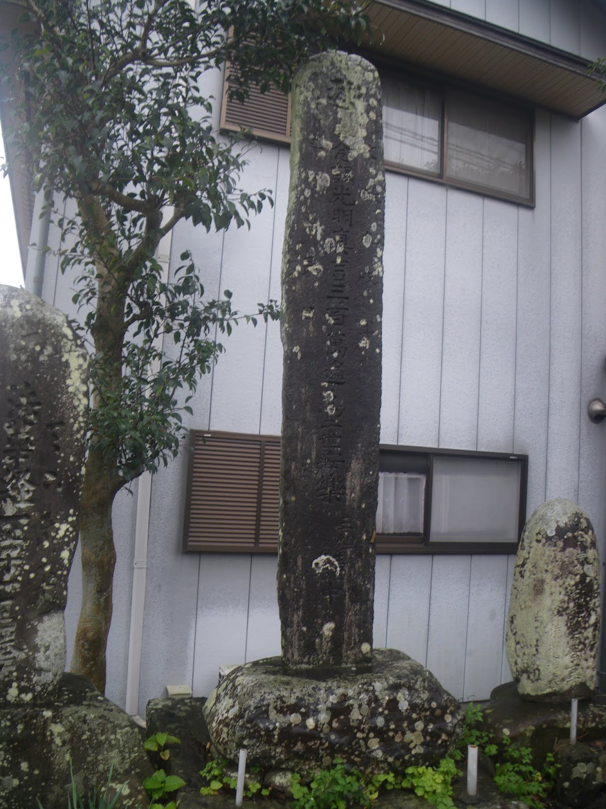 ほどなく道の右手に集会所があり、道を隔てた対面に3mほどの供養塔。「光明真言三百万遍為二世安楽」と刻まれる。その横に自然石の石碑。「法華経*石塔」といった文字が読める。